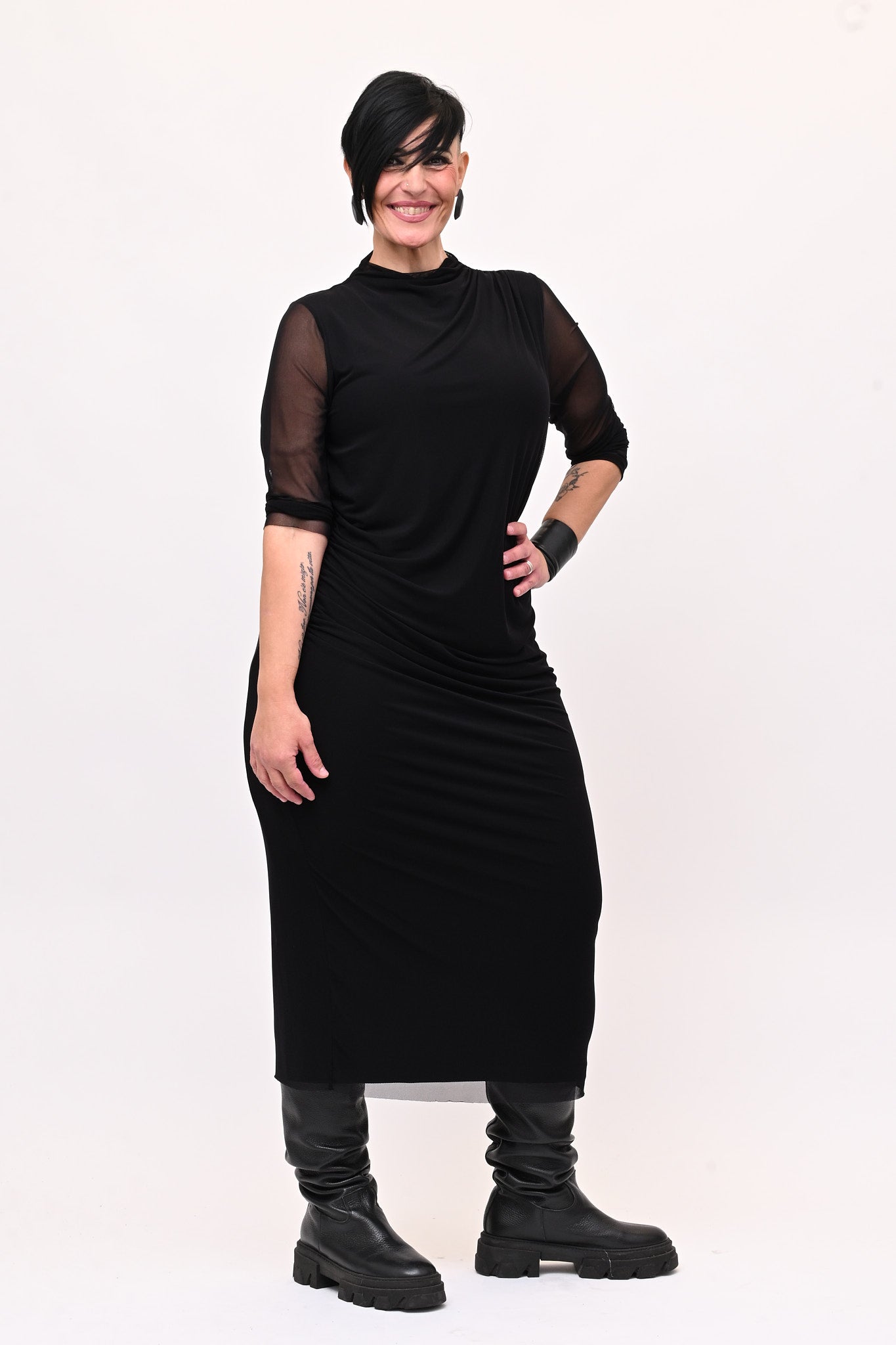 Abito mezzo collo e manica lunga con arricciature sulla spalla e sul fianco. Il capo presenta un doppio strato in tessuti diversi per evitare che risulti trasparente. Sexy, audace e casto allo stesso tempo, un must have per chi non vuole passare inosservata.