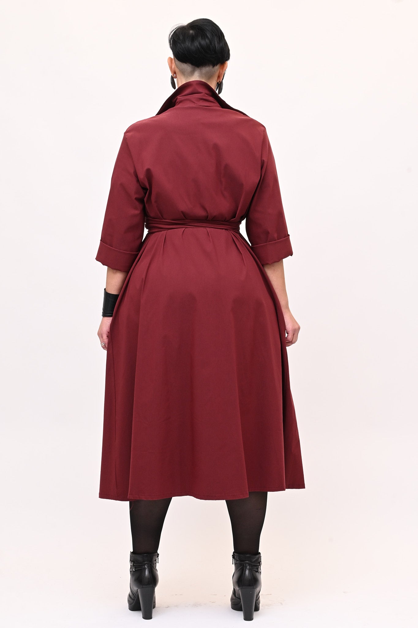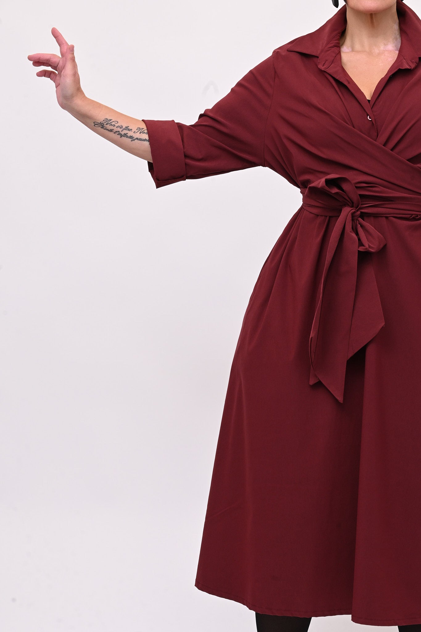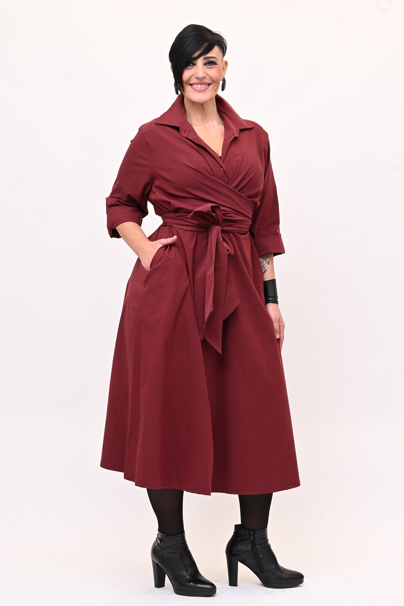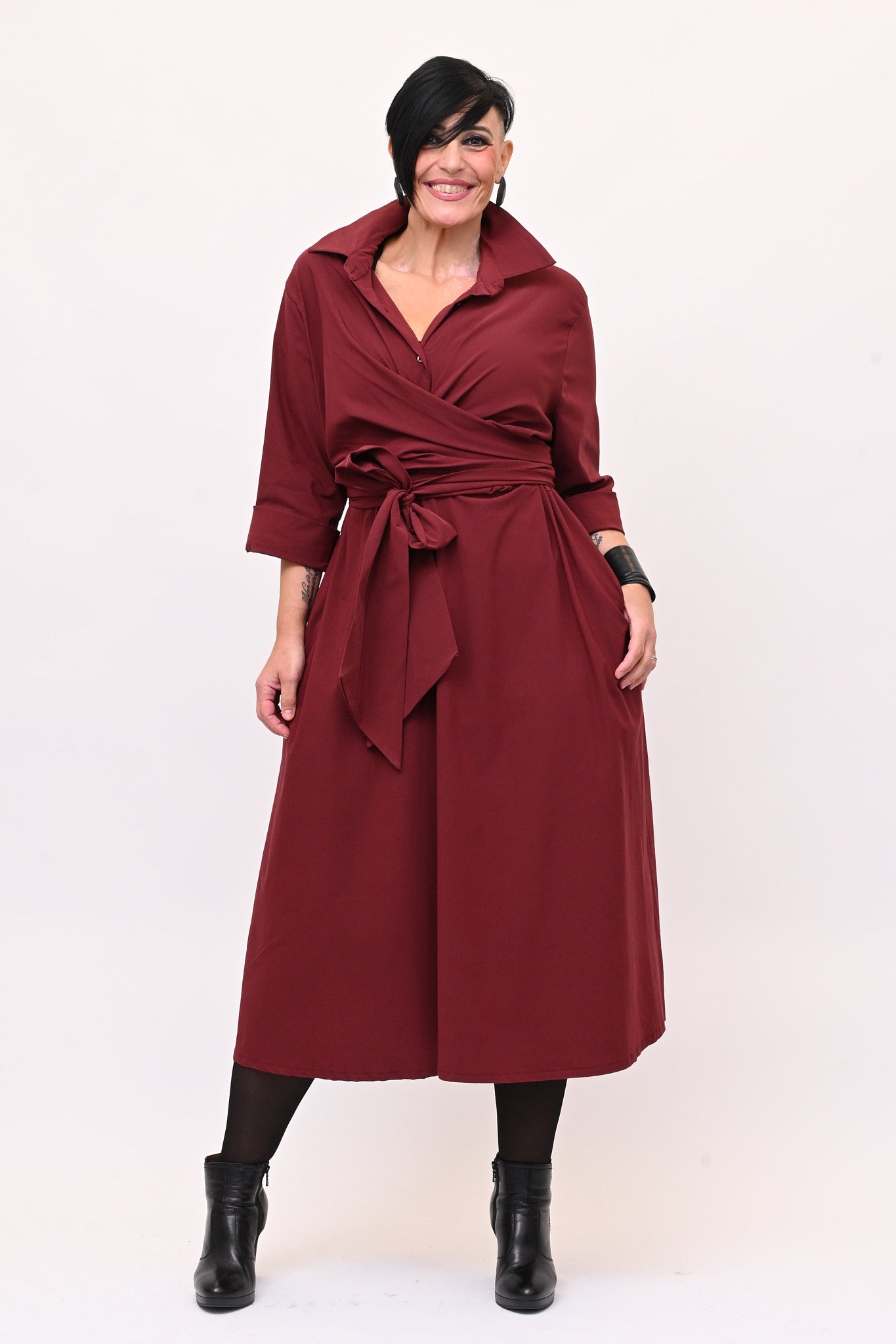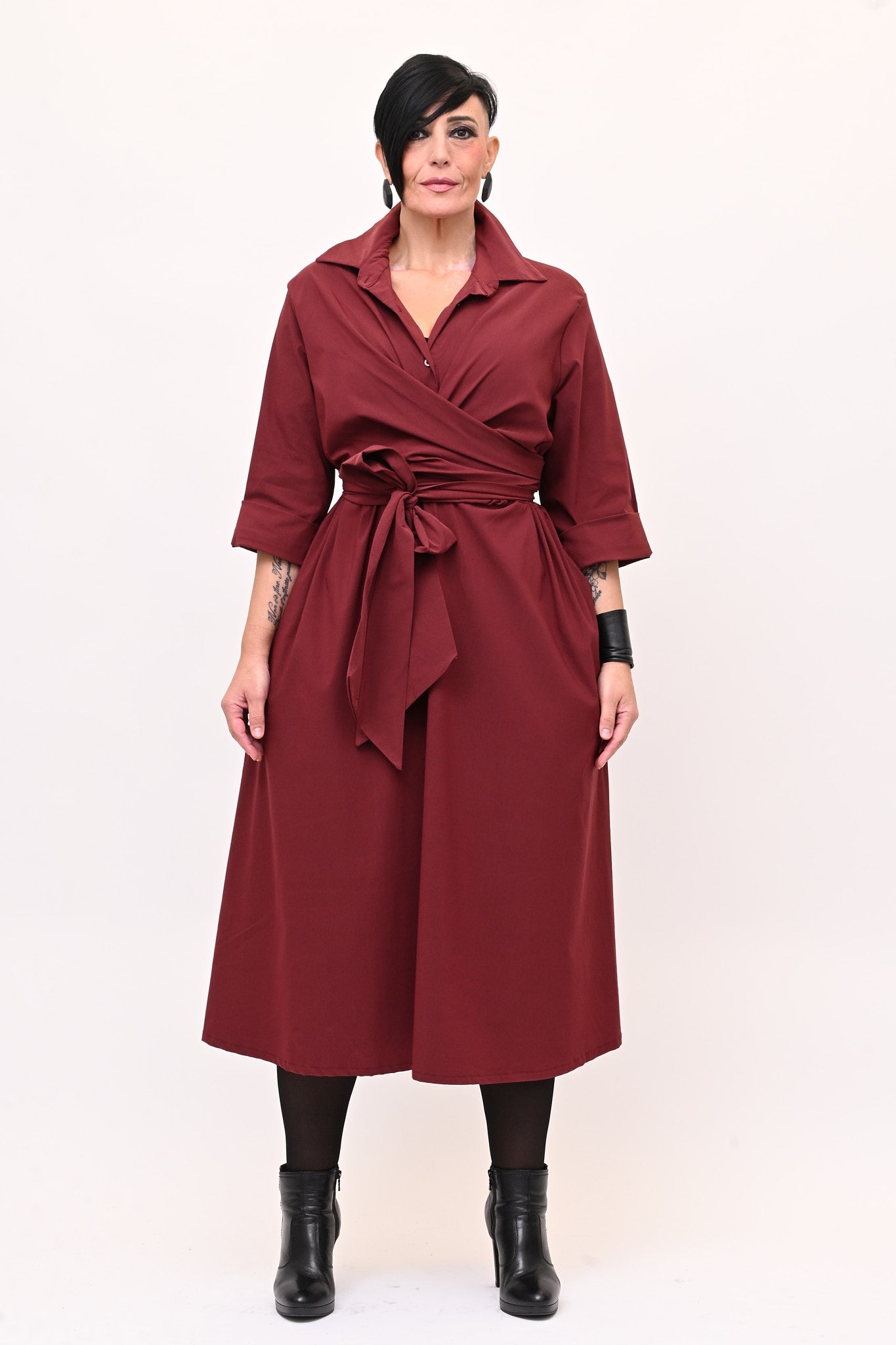 Abito in bengalina elasticizzata. La parte superiore è modello camicia con bottoni e colletto. La particolarità è l'incrocio frontale i cui estremi formano una cinta in vita. La parte inferiore è composta da una gonna svasata con tasche che arriva a metà polpaccio. Il confort e l'eleganza di questo outfit vi renderanno uniche per un evento sia easy chic che formale.