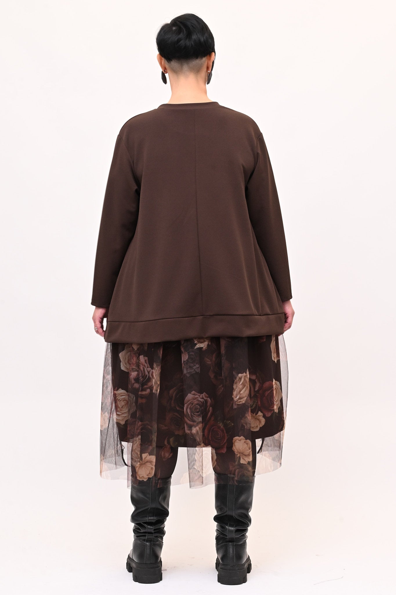 Abito composto da una sottoveste in tulle fantasia e una maglia in stile felpa. Il contrasto tra la leggerezza del tulle e la grinta della felpa dà vita a un look moderno e stiloso, perfetto per chi cerca uno stile sofisticato ma con un tocco deciso.