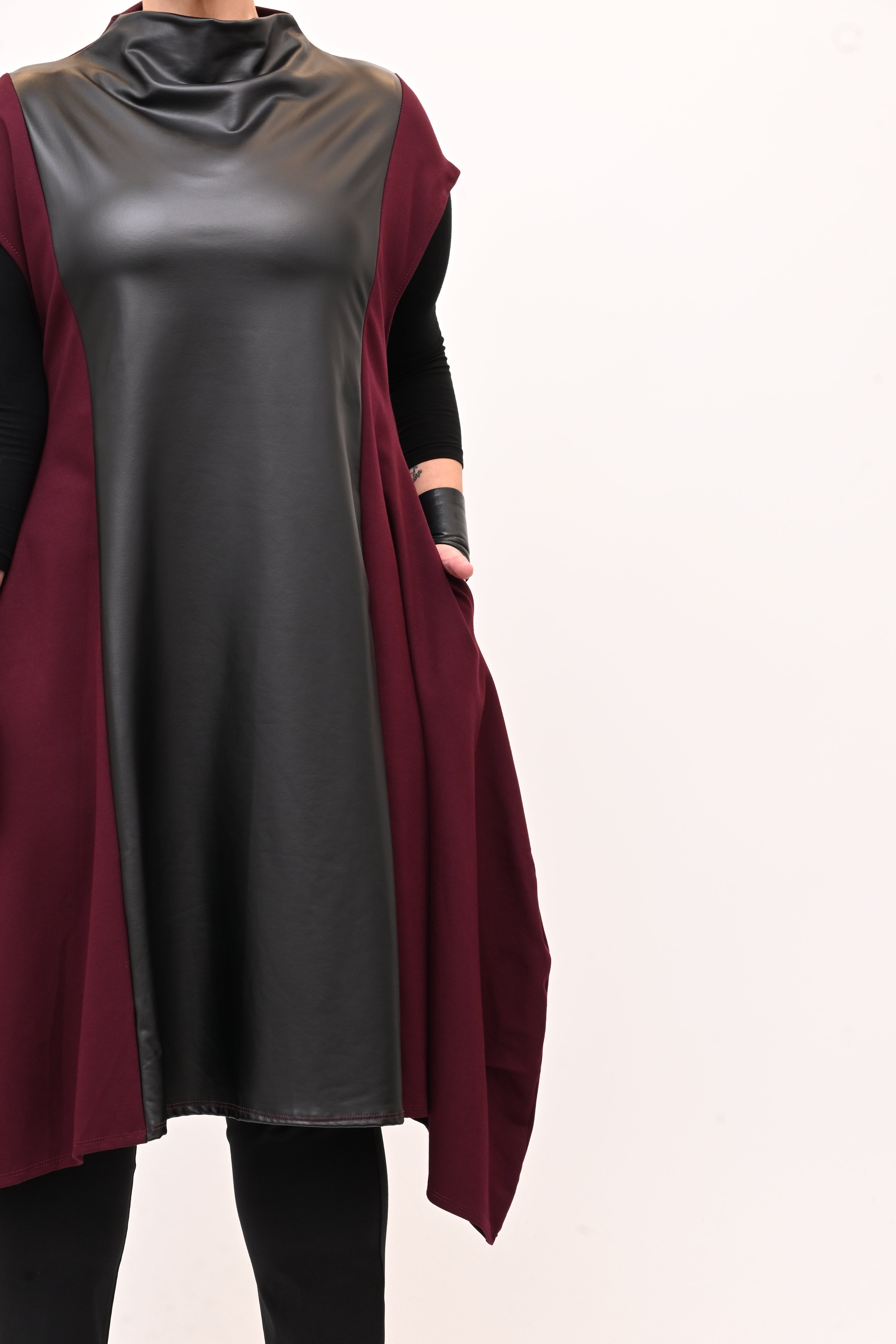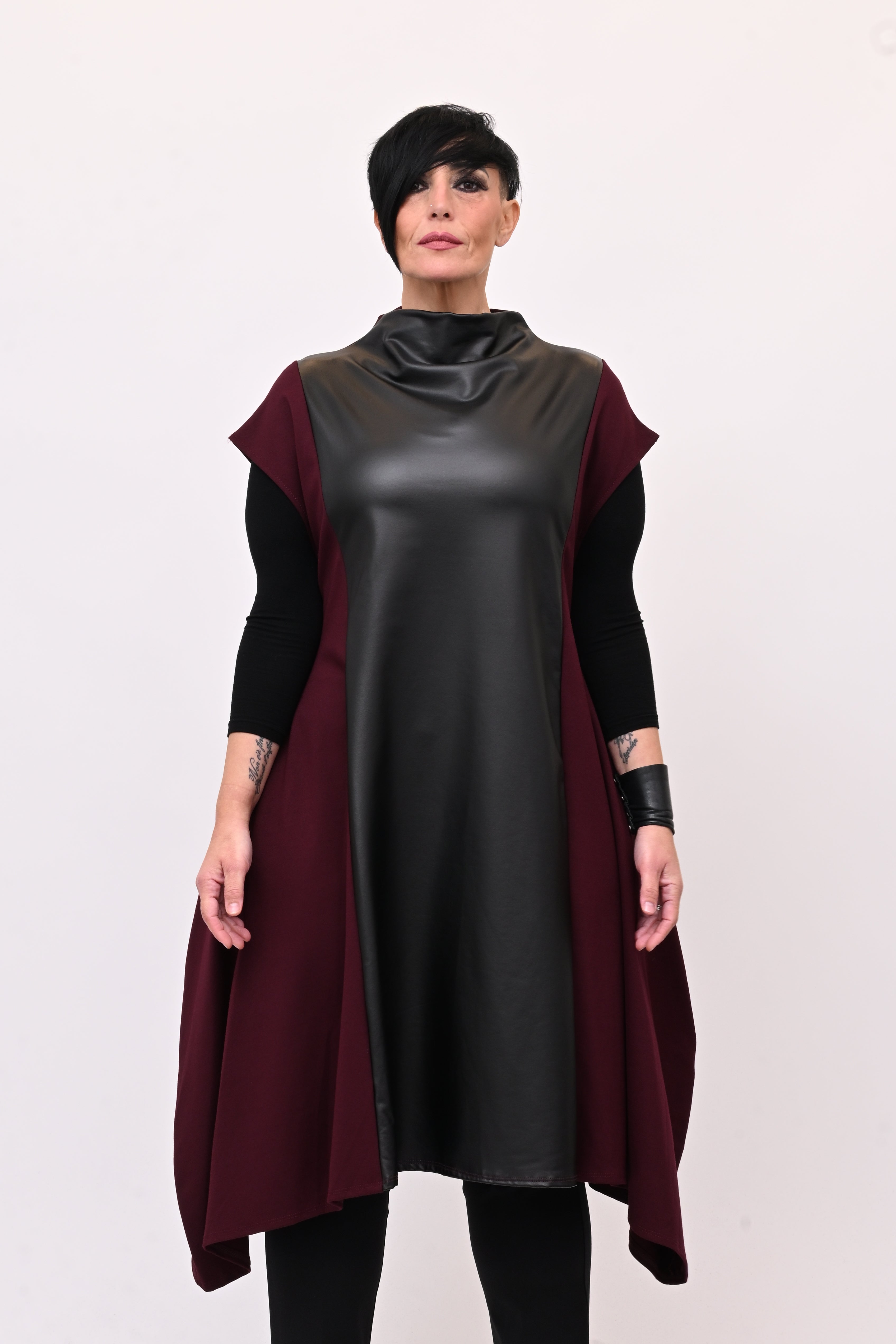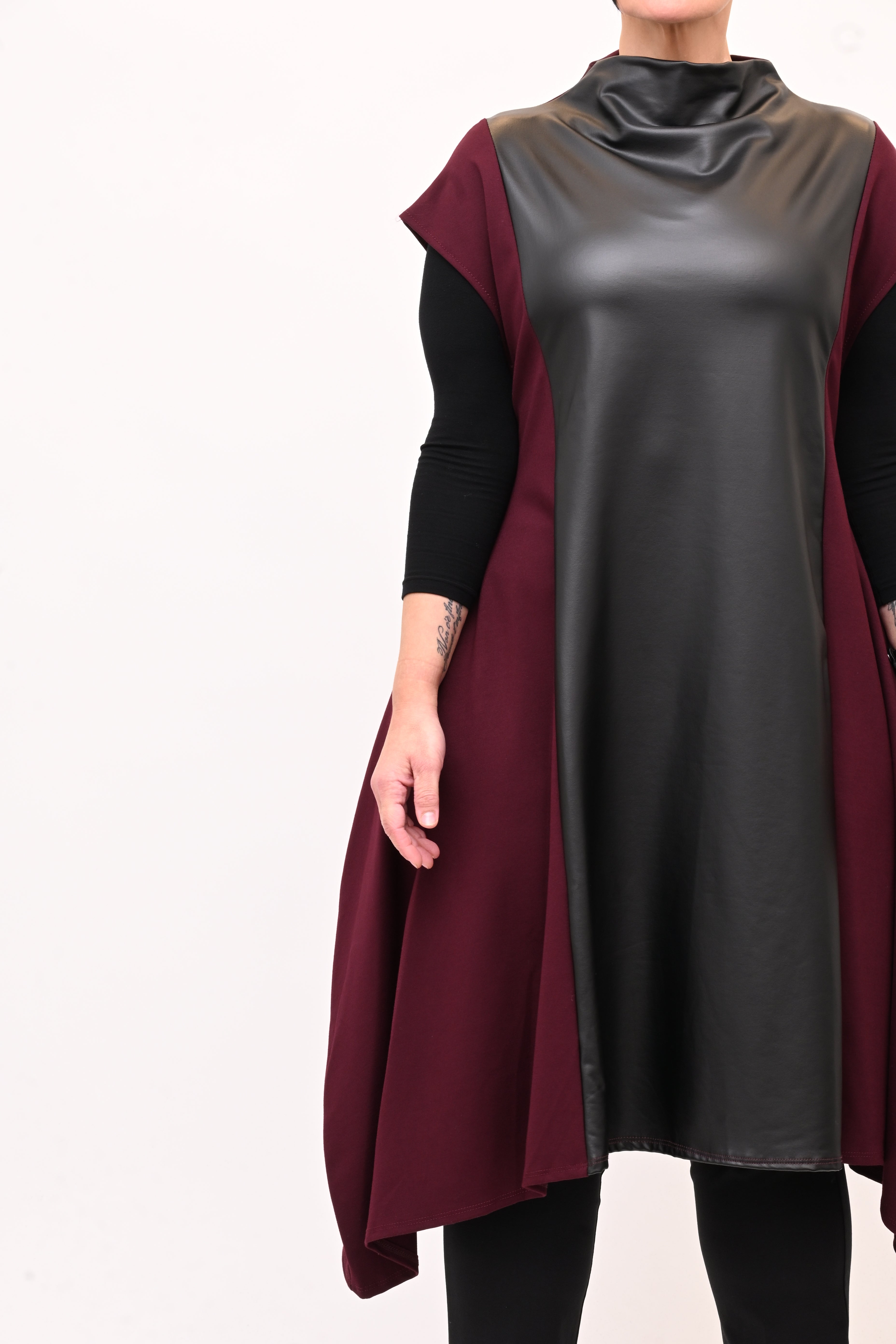 Abito in punto Milano, senza maniche, con collo vulcano e gonna svasata. L'inserto in ecopelle centrale aggiunge carattere e femminilità al capo. Dal tocco deciso e moderno è ideale per outfit sofisticati e di carettere.