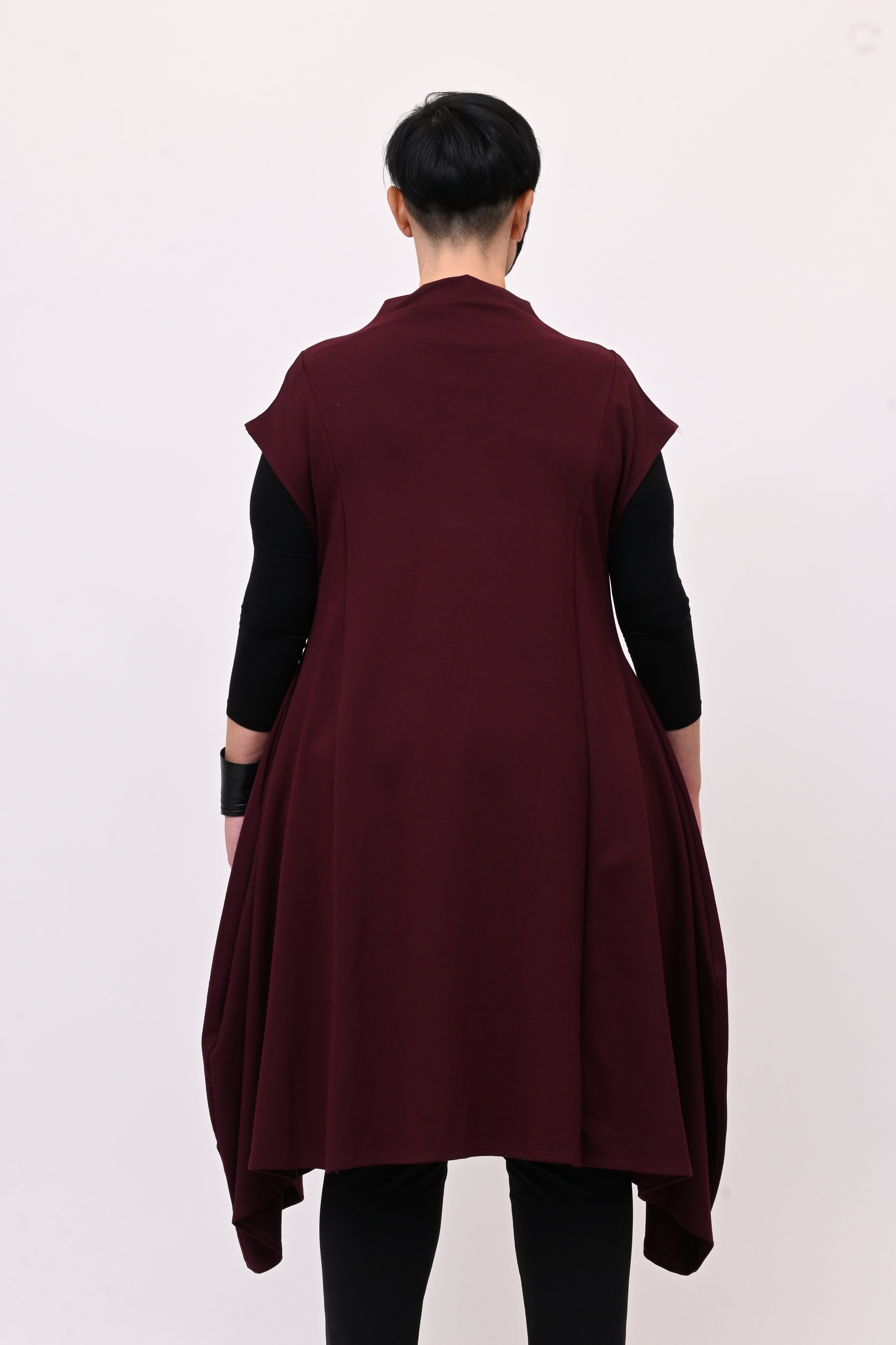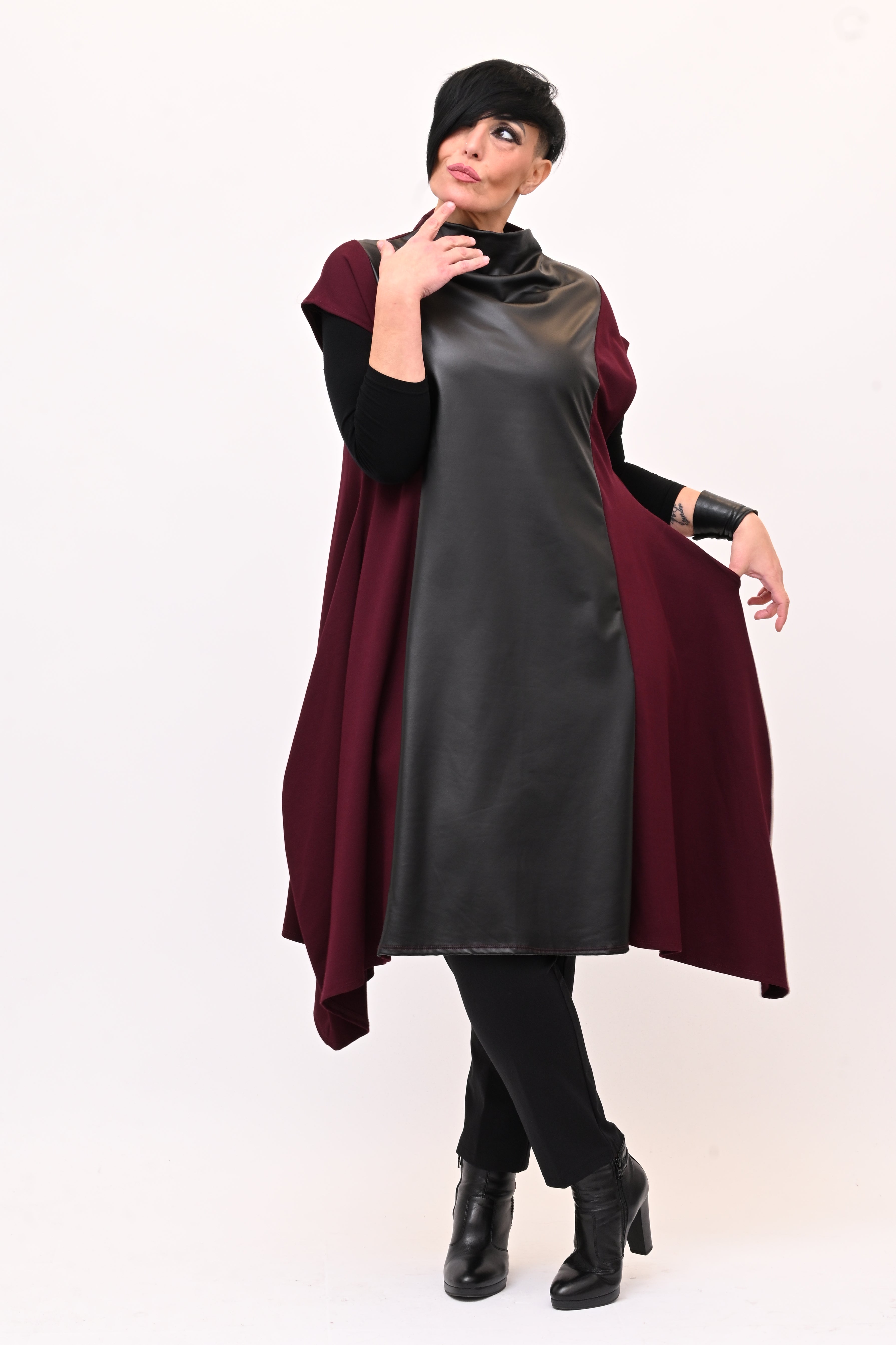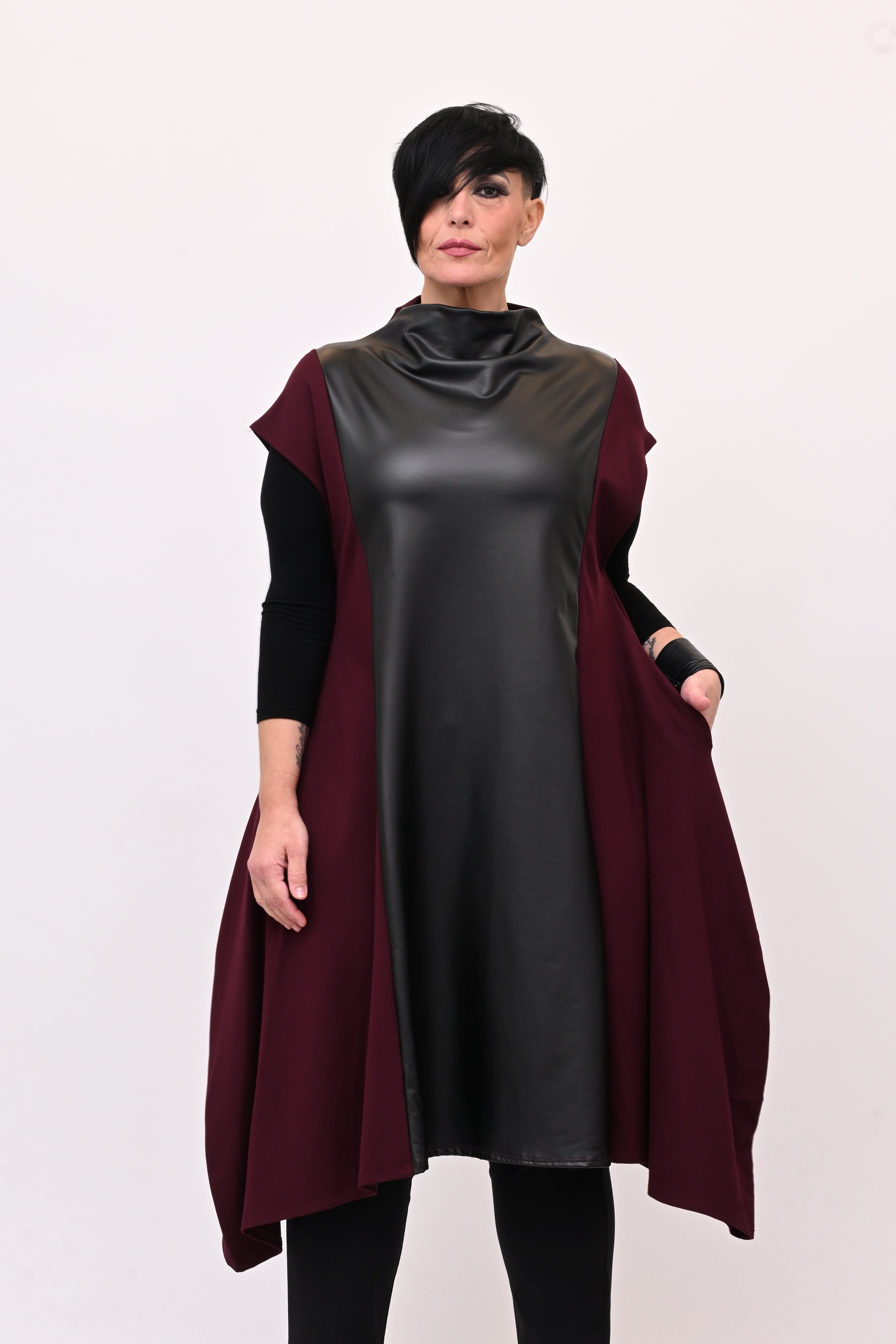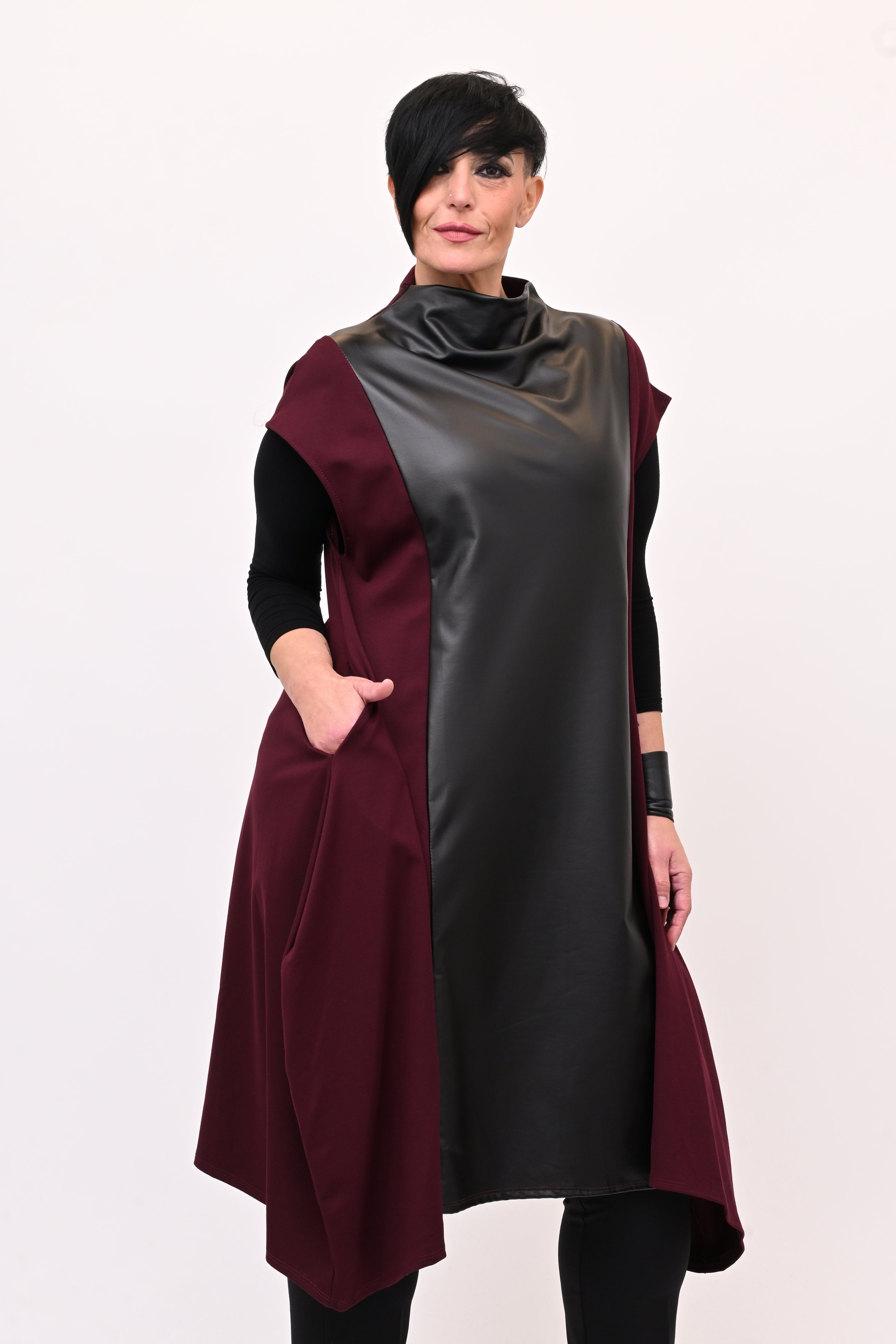 Abito in punto Milano, senza maniche, con collo vulcano e gonna svasata. L'inserto in ecopelle centrale aggiunge carattere e femminilità al capo. Dal tocco deciso e moderno è ideale per outfit sofisticati e di carettere.