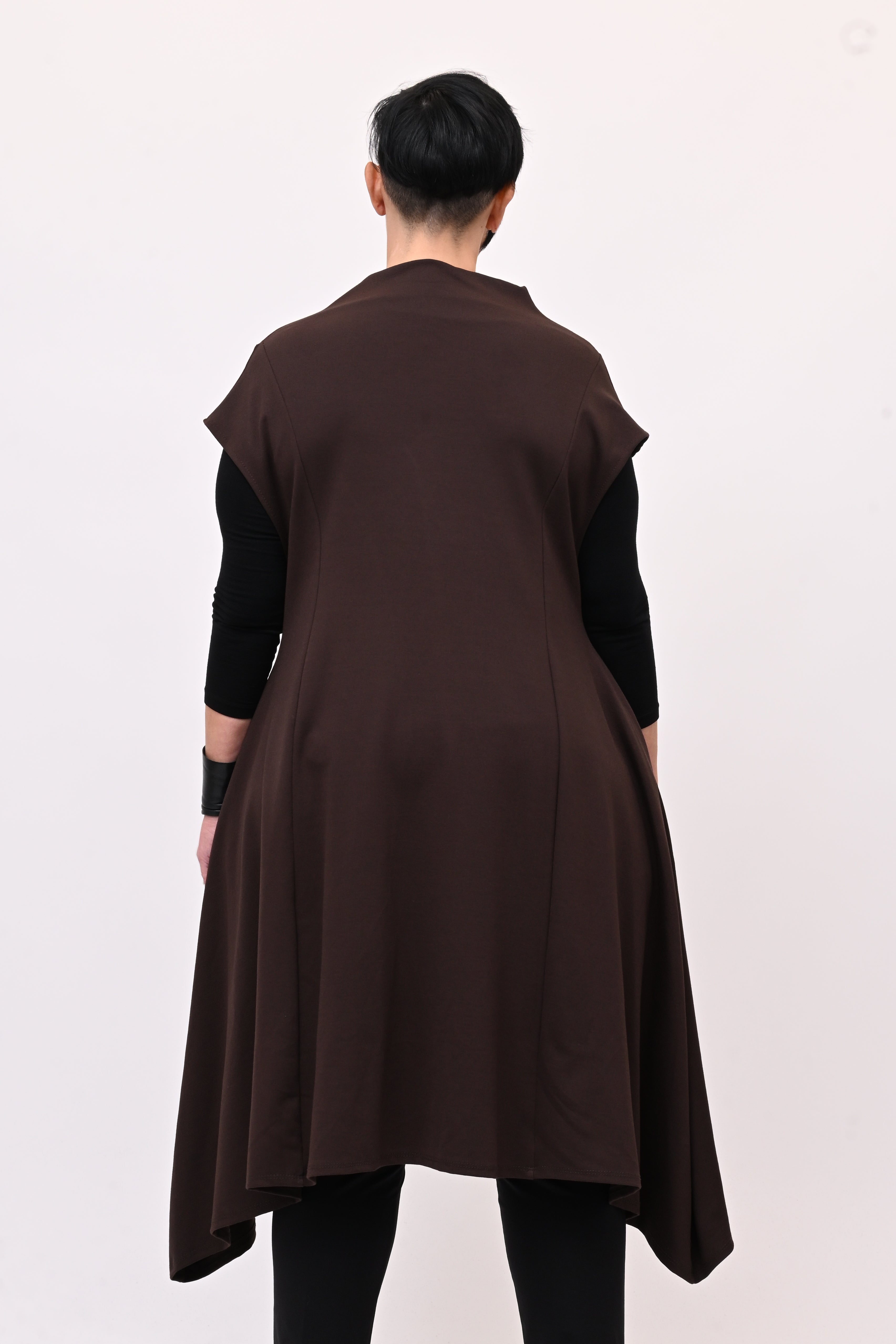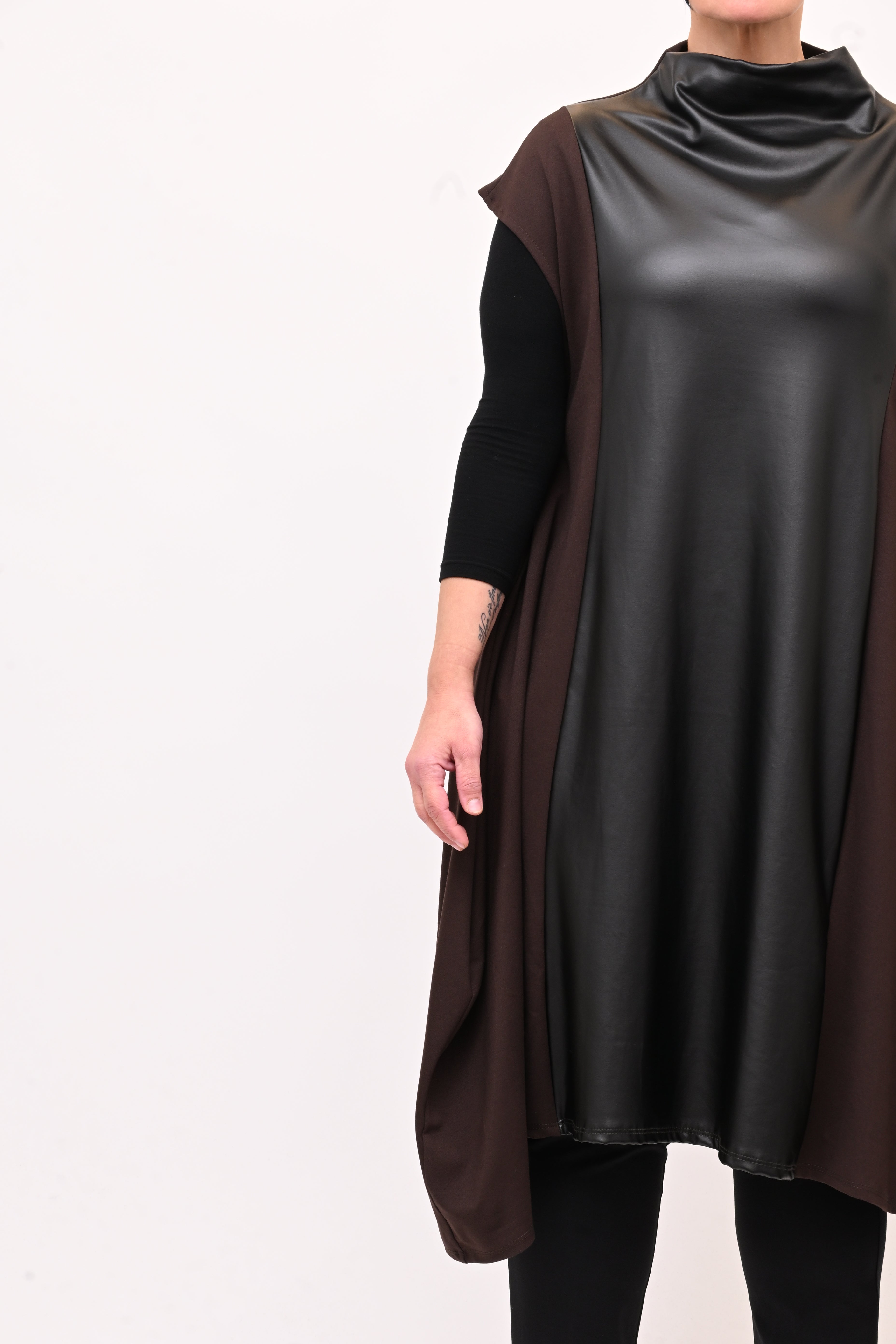 Abito in punto Milano, senza maniche, con collo vulcano e gonna svasata. L'inserto in ecopelle centrale aggiunge carattere e femminilità al capo. Dal tocco deciso e moderno è ideale per outfit sofisticati e di carettere.