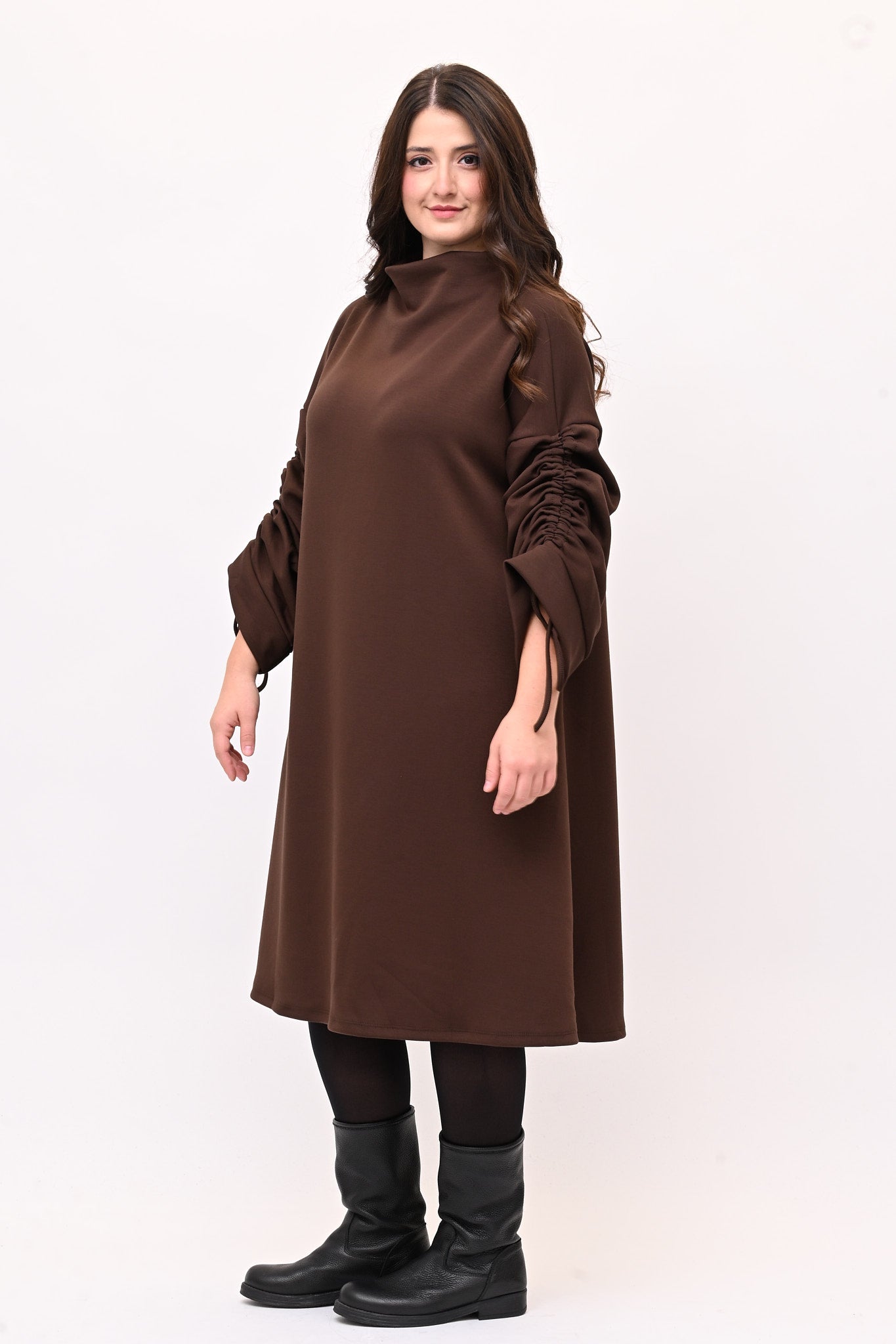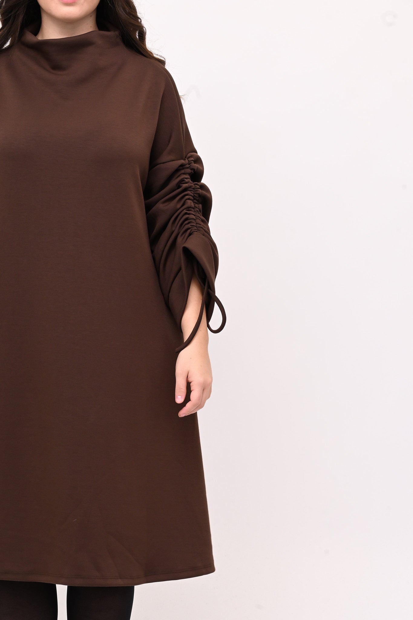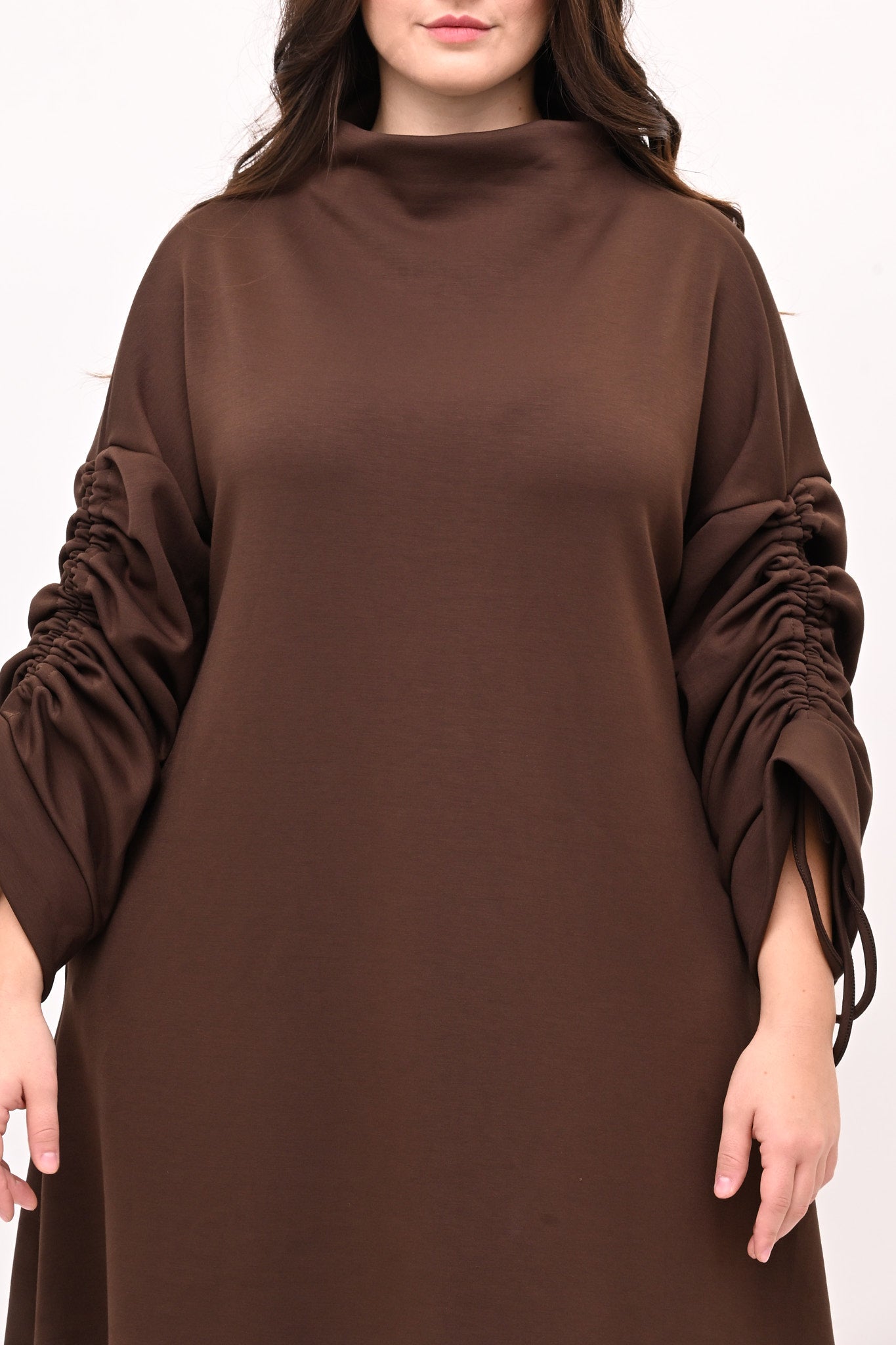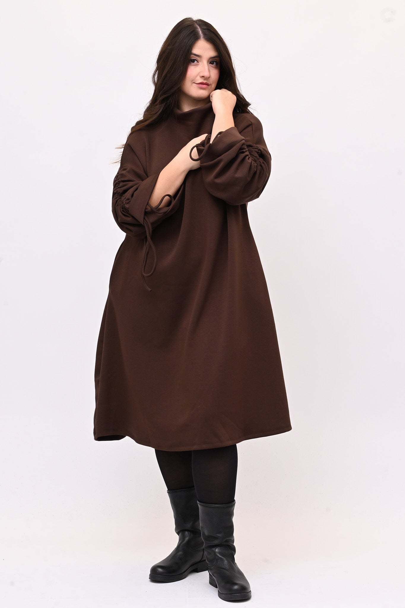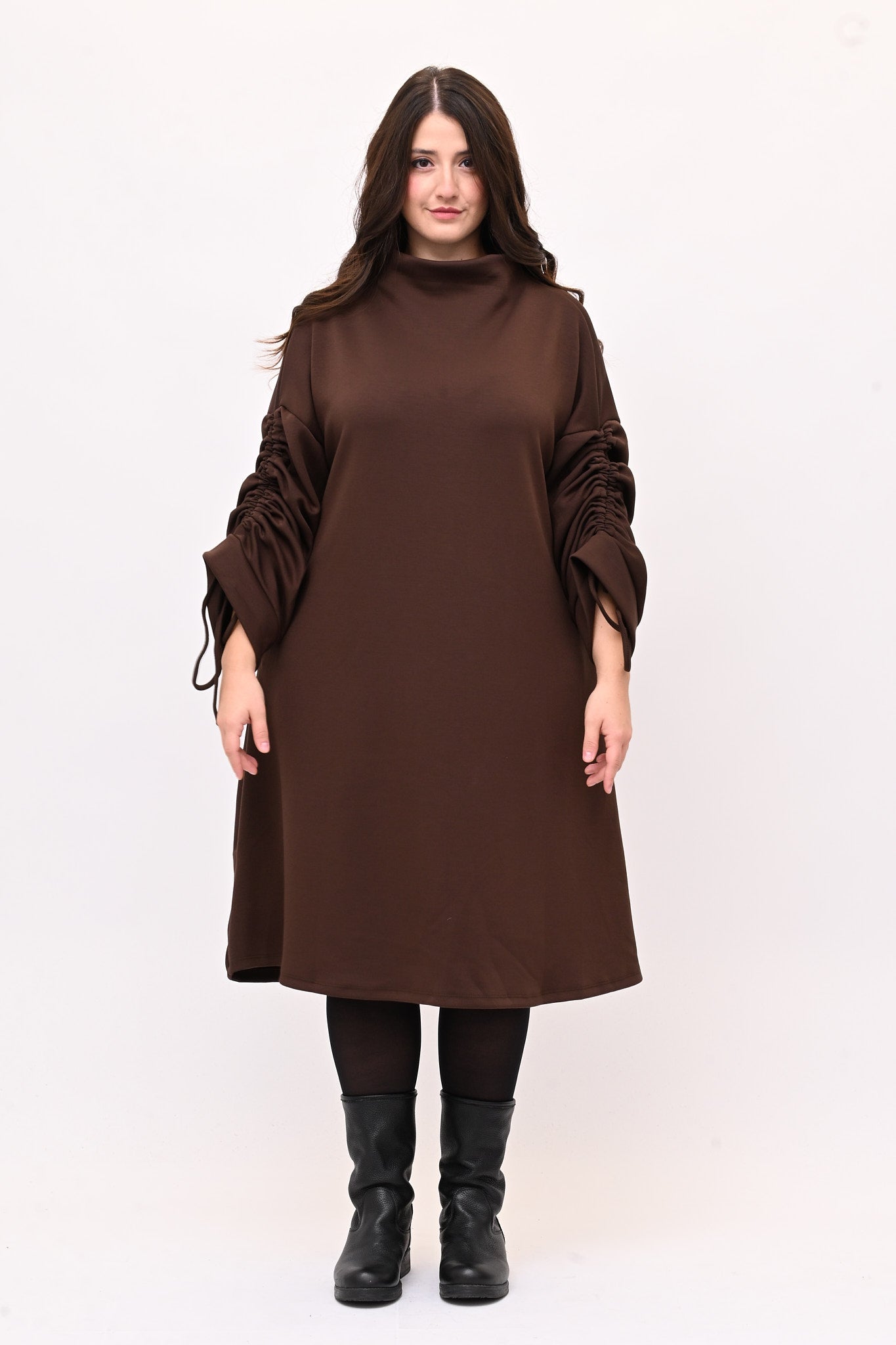Abito in tessuto scuba con collo a vulcano, modello ad A. I lacci sulle maniche creano un’arricciatura che aggiunge stile. Confortevole e versatile, è perfetto per outfit eleganti e pratici.
