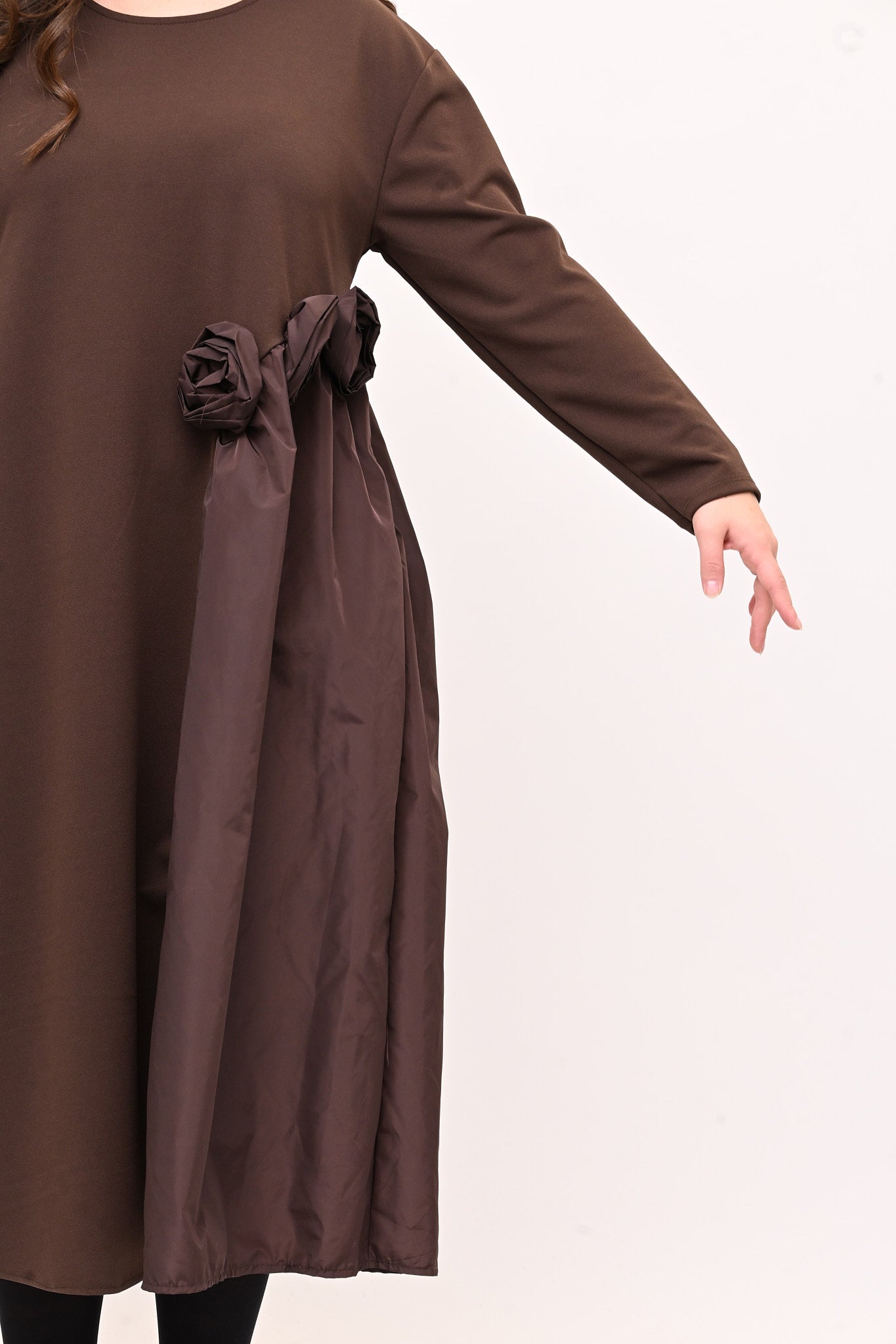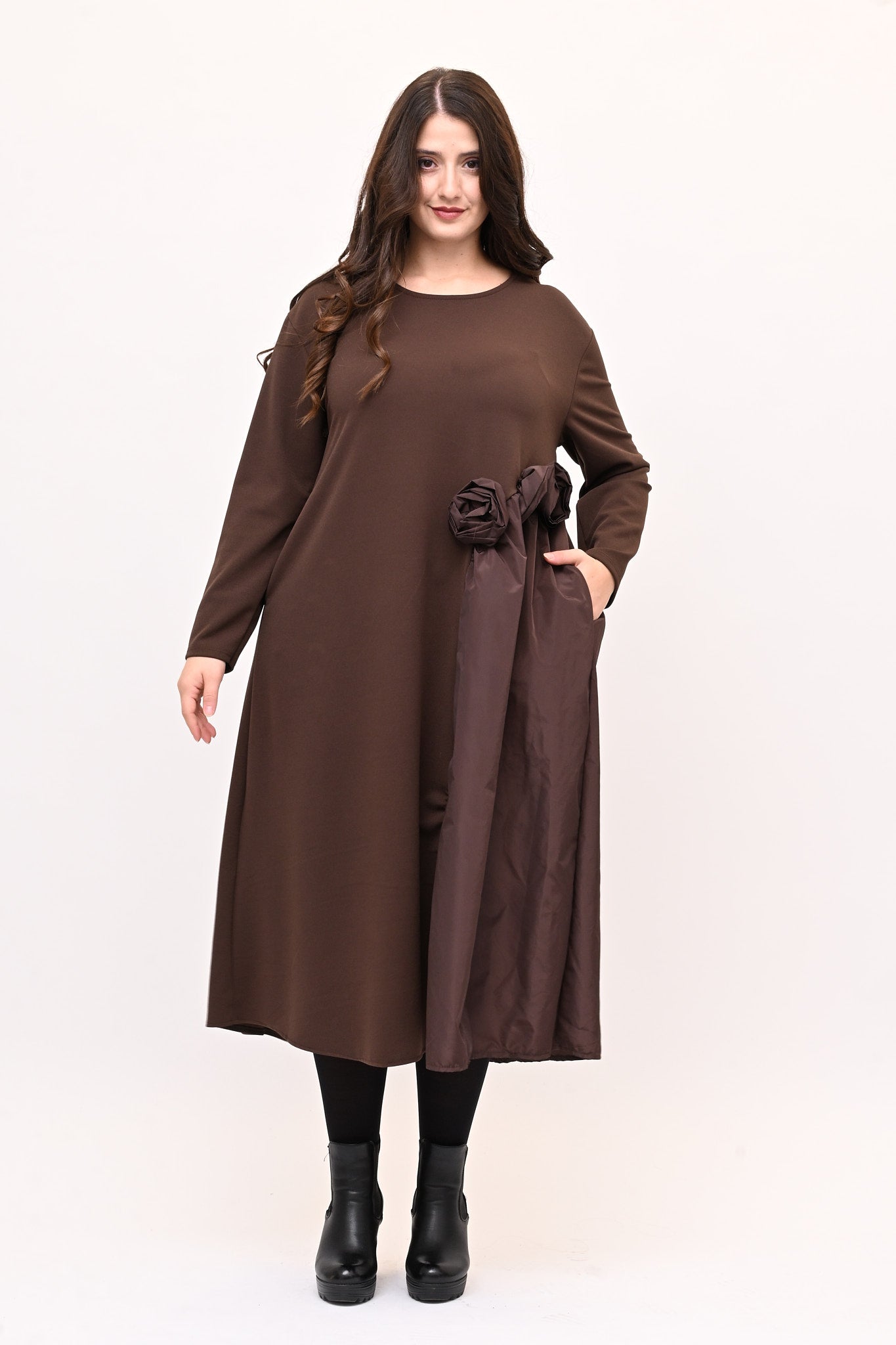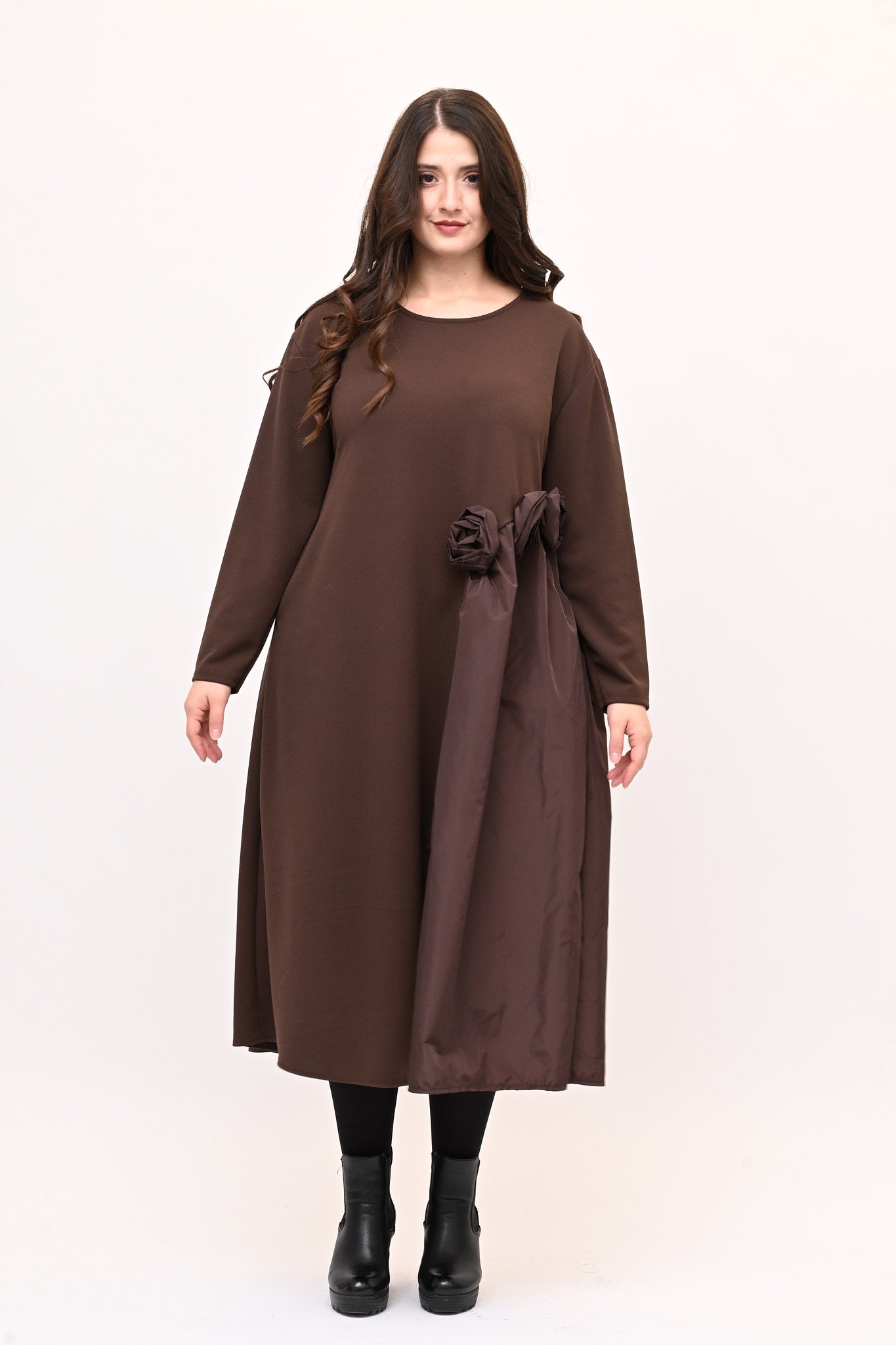 Abito girocollo, maniche lunghe e lunghezza al polpaccio. La gonna ha un inserto in tafta impreziosito da tre fiori applicati, che conferisce movimento e eleganza al capo. Sofisticato e femminile, è ideale per occasioni speciali e look ricercati.