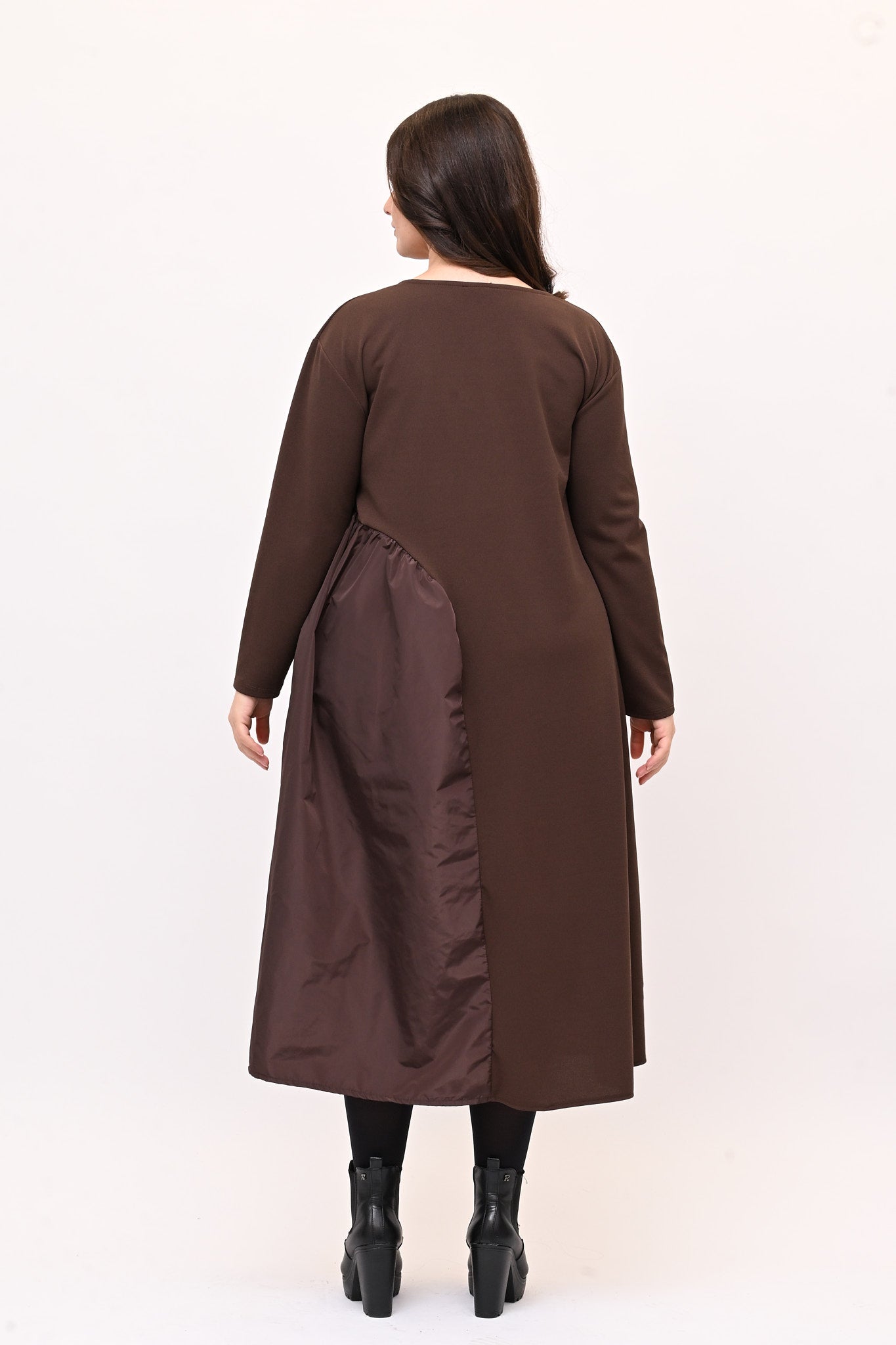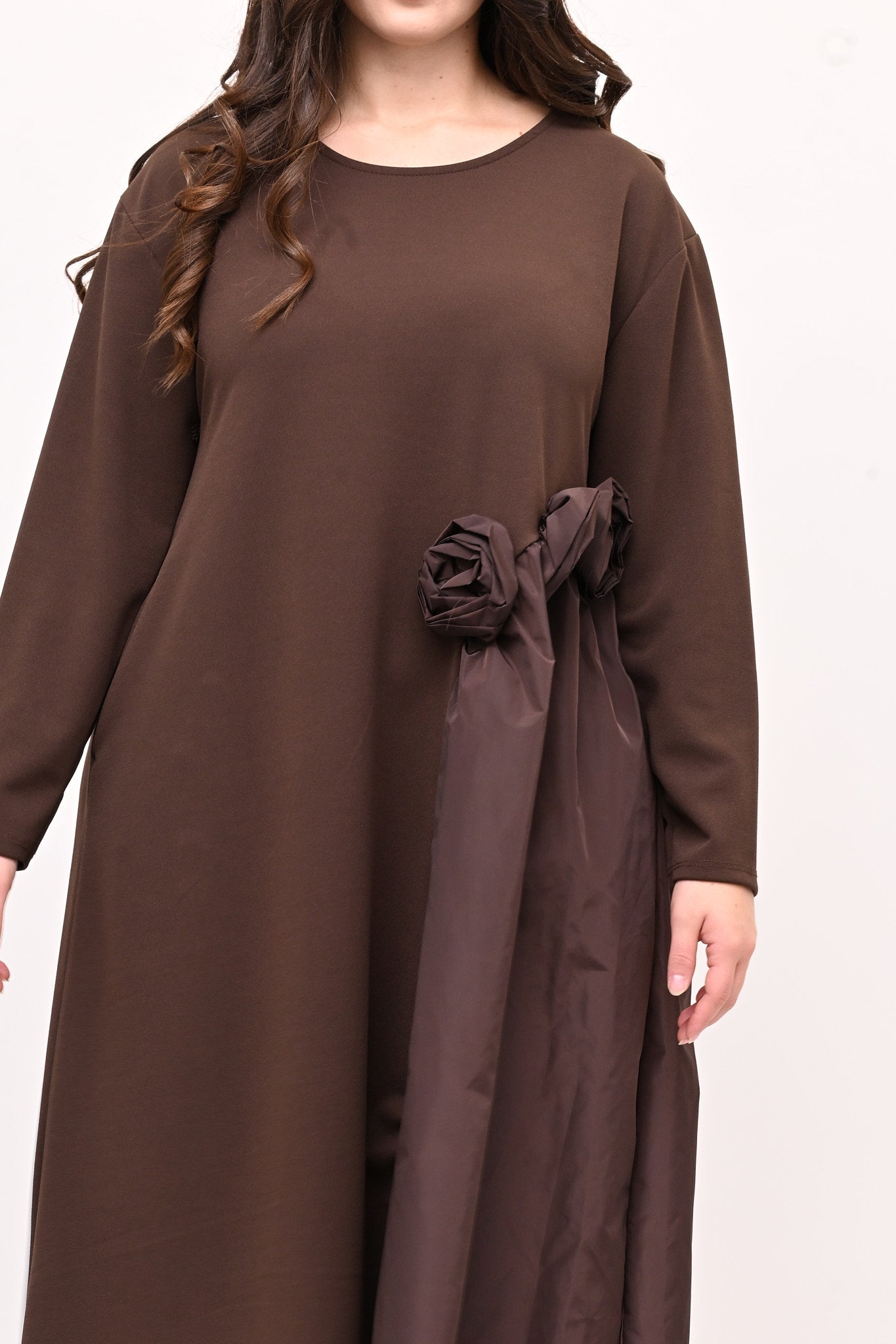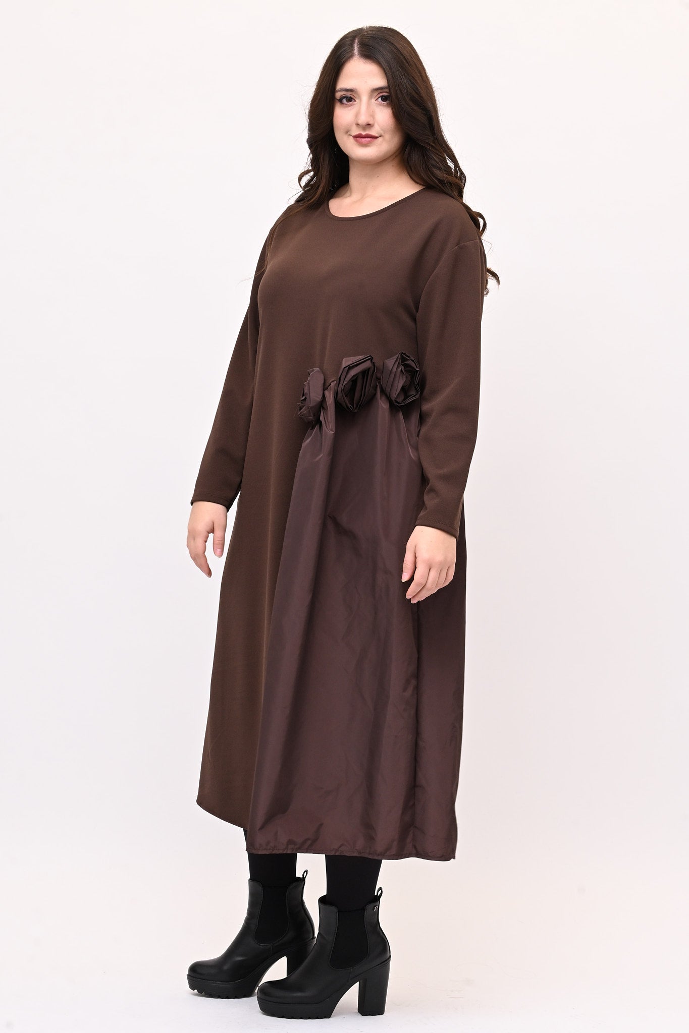 Abito girocollo, maniche lunghe e lunghezza al polpaccio. La gonna ha un inserto in tafta impreziosito da tre fiori applicati, che conferisce movimento e eleganza al capo. Sofisticato e femminile, è ideale per occasioni speciali e look ricercati.