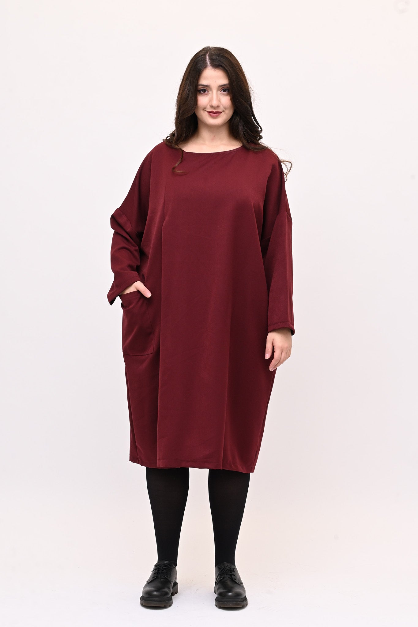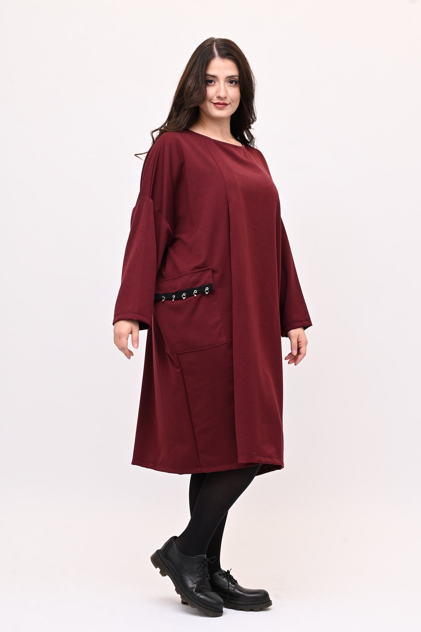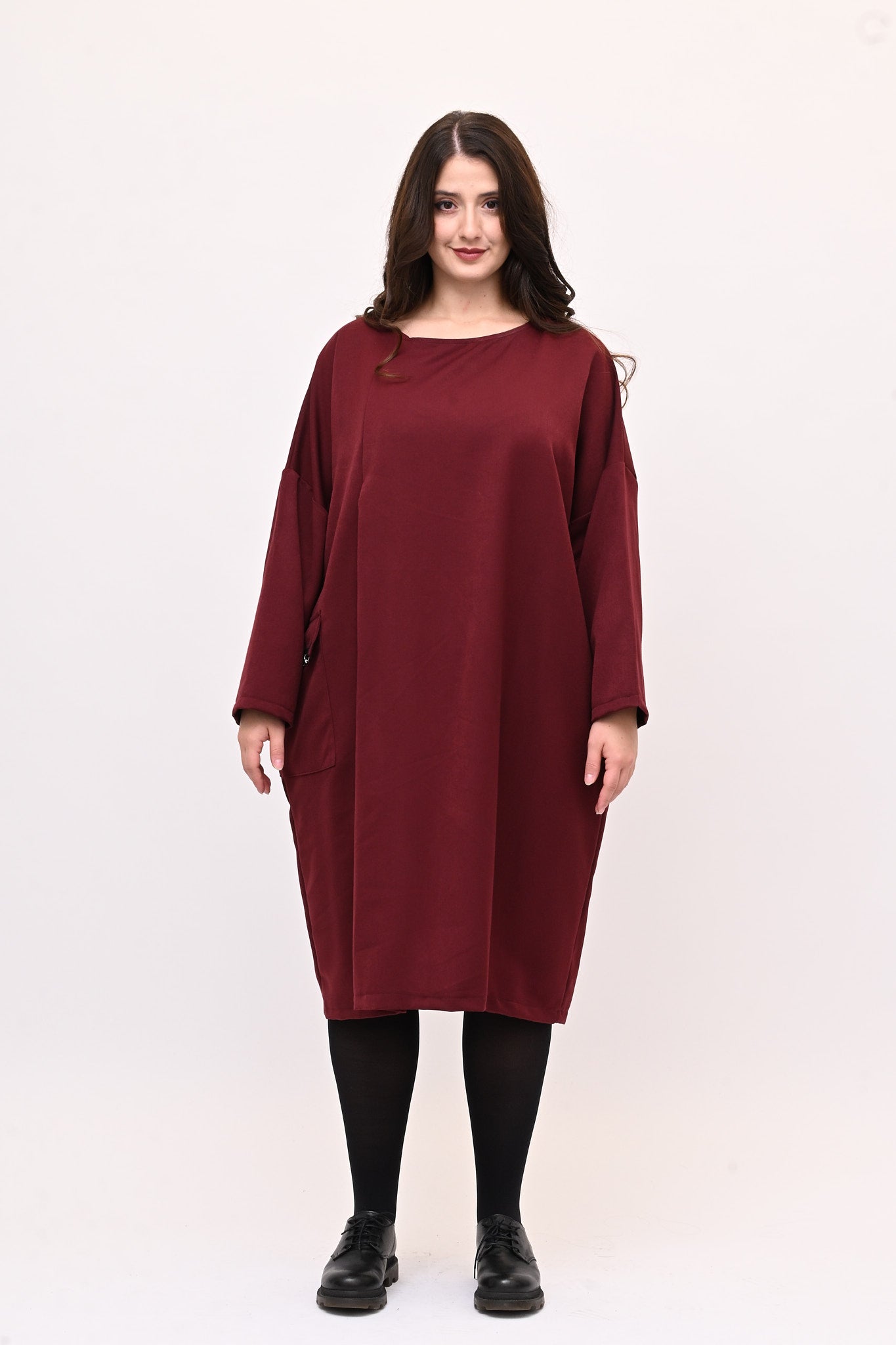 Abito a sacchetto con girocollo e maniche lunghe. La pince verticale crea movimento e morbidezza, mentre la tasca con i piercing aggiunge un dettaglio originale. Un capo versatile che unisce comodità e stile.