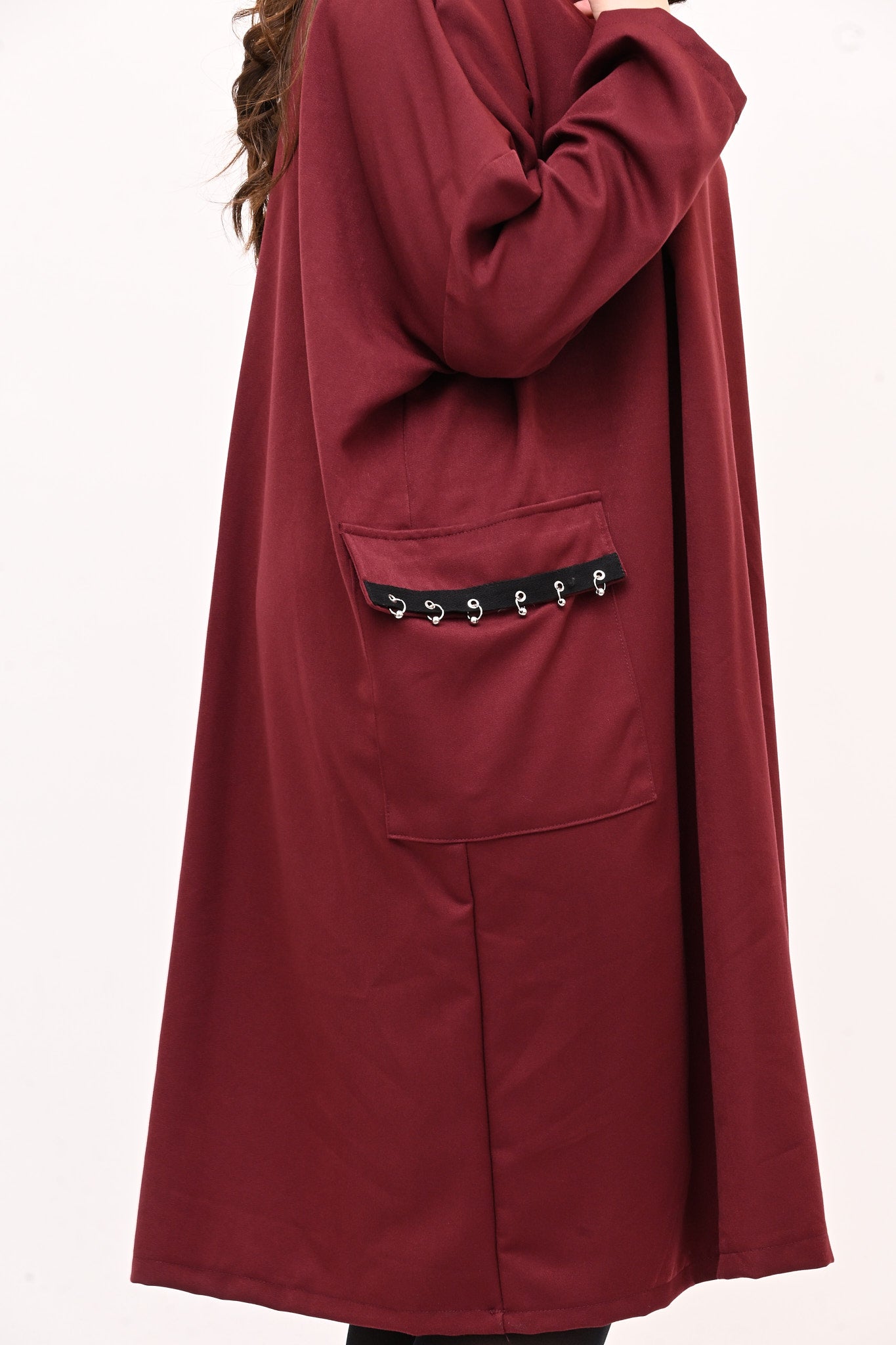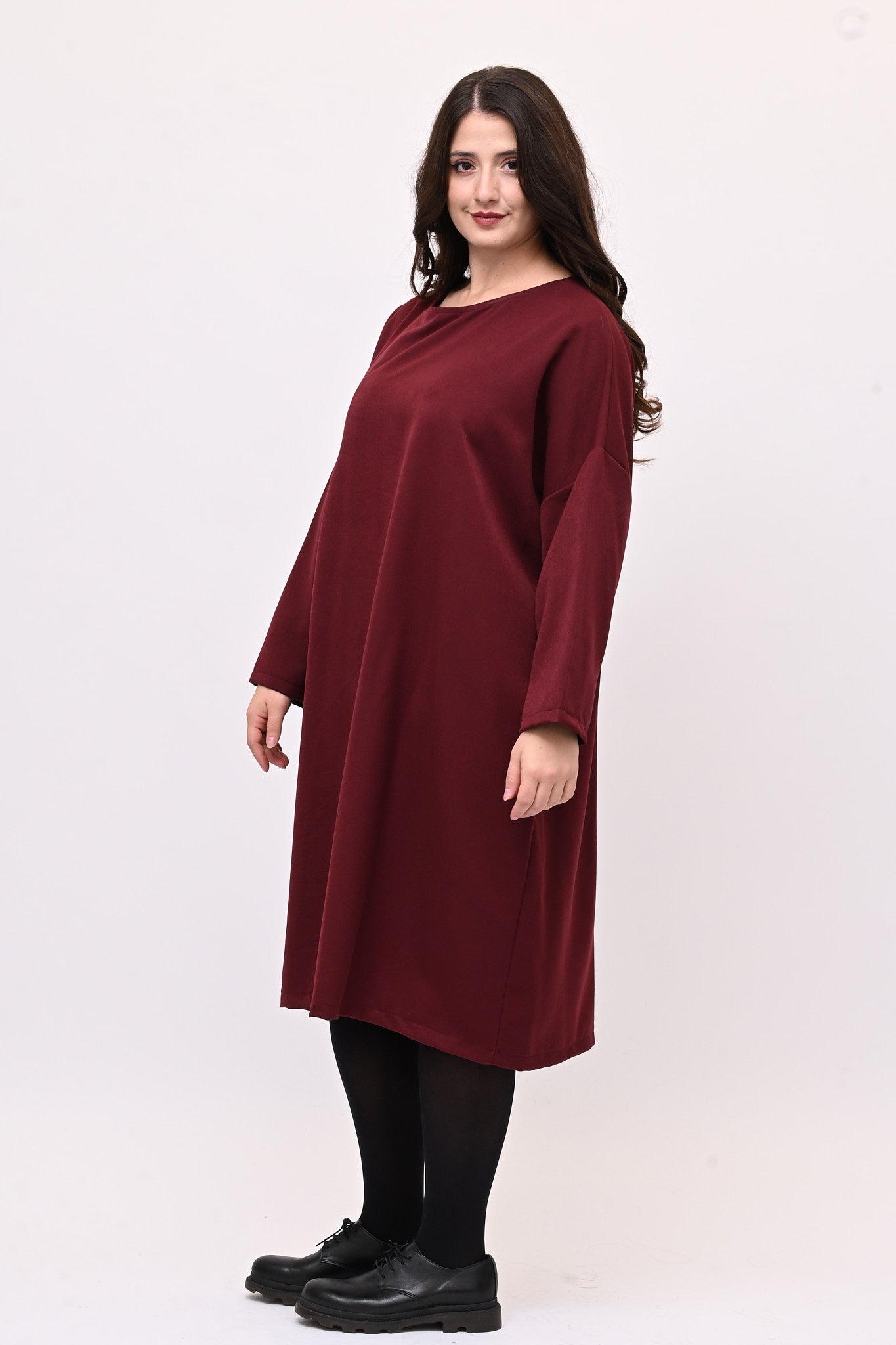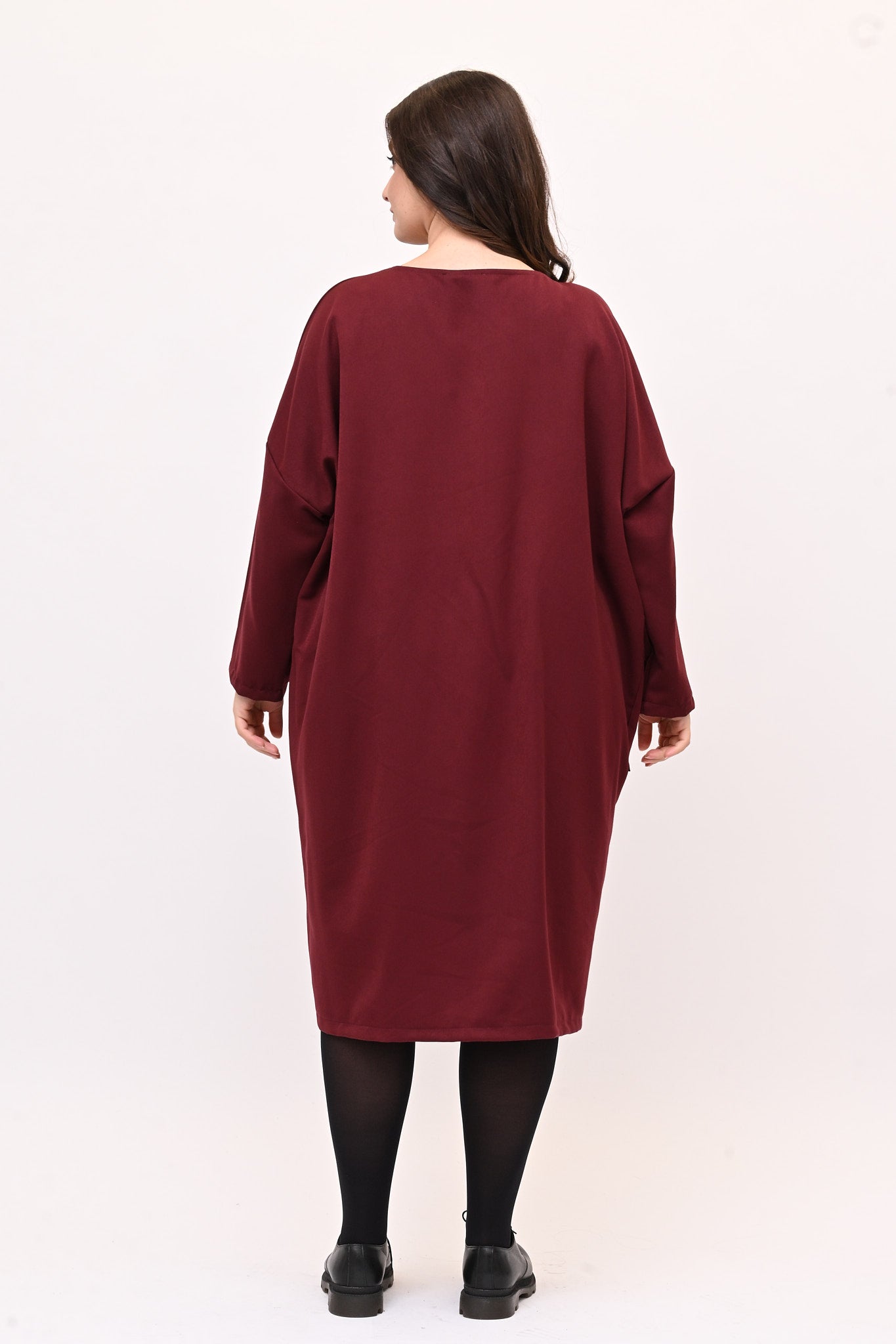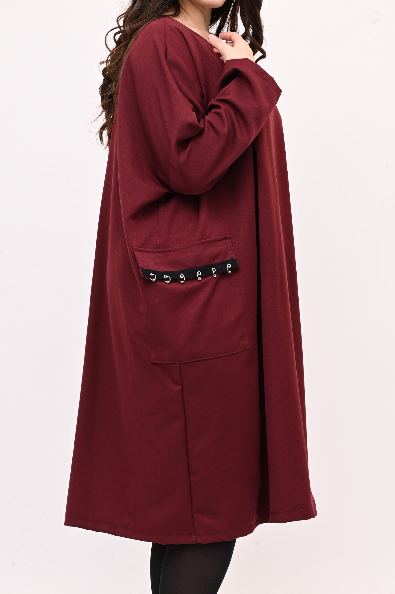 Abito a sacchetto con girocollo e maniche lunghe. La pince verticale crea movimento e morbidezza, mentre la tasca con i piercing aggiunge un dettaglio originale. Un capo versatile che unisce comodità e stile.