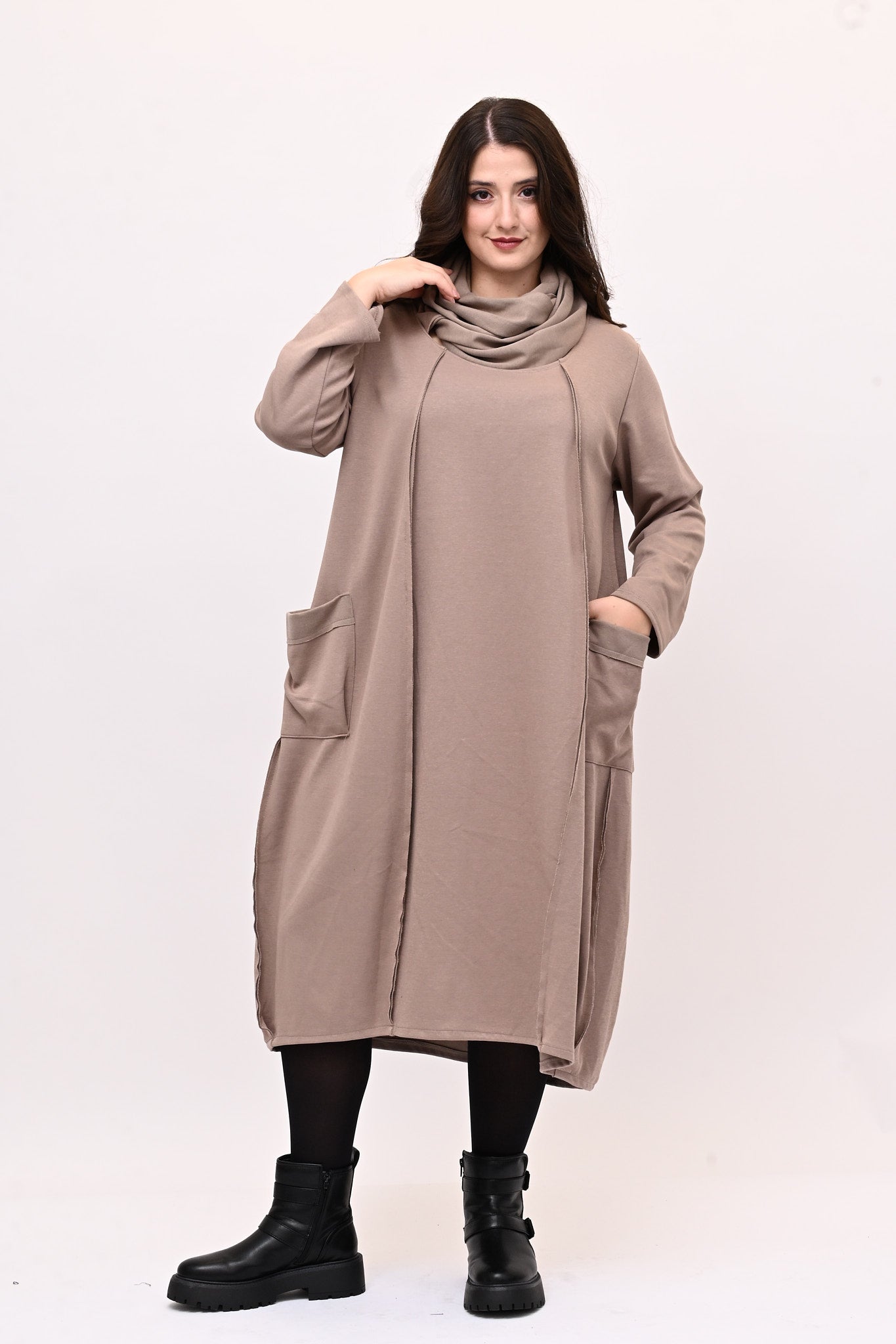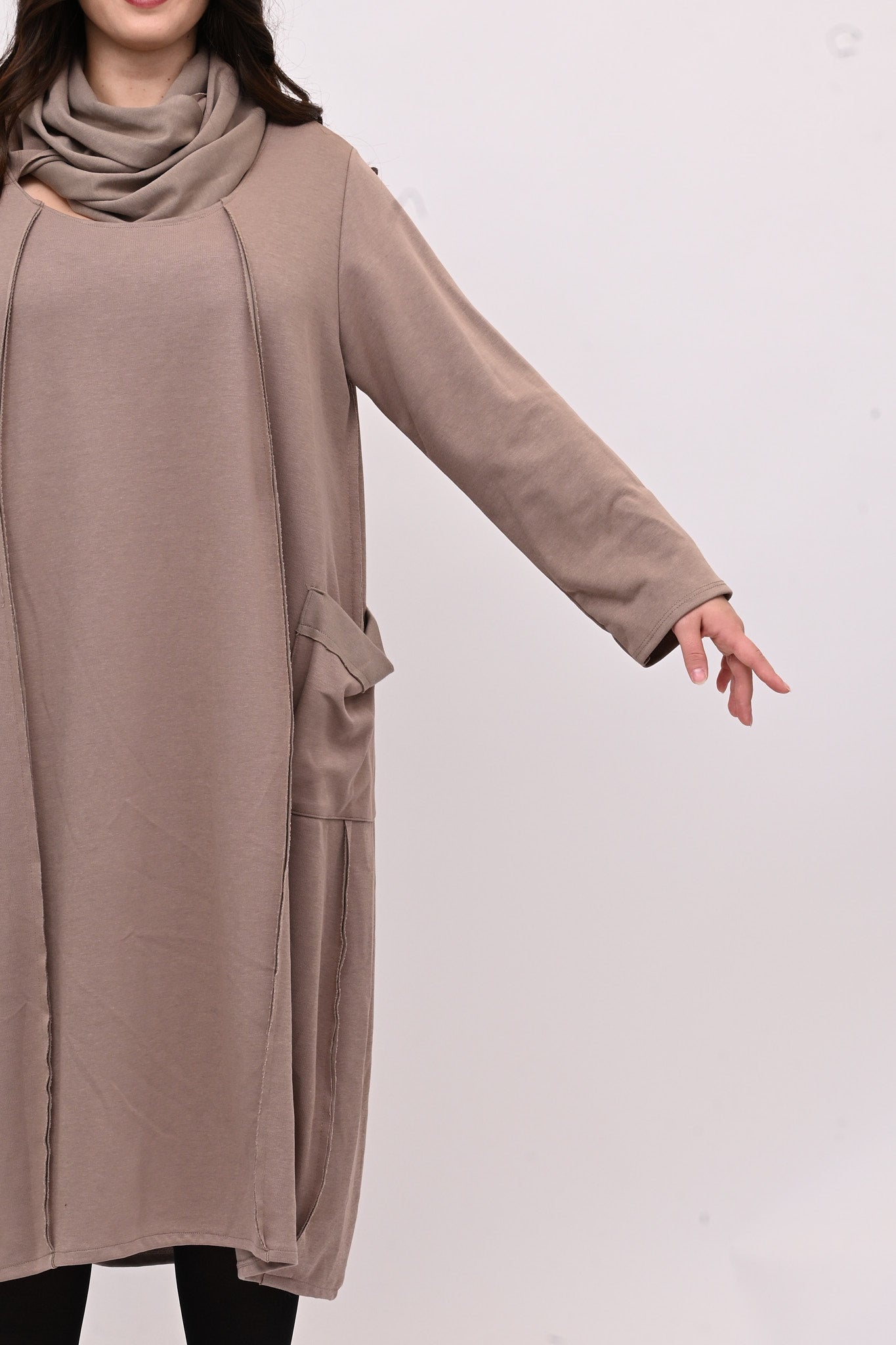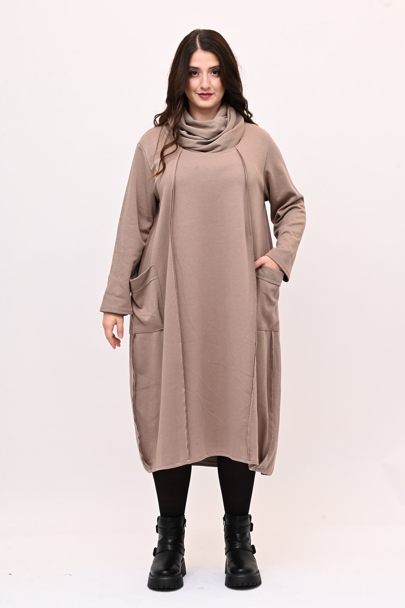 Abito in felpa al polpaccio, girocollo, manica lunga, cuciture e tasche frontali. Sciarpa integrata al collo da indossare lunga o risvoltata. Comfort e stile sporty chic in un'unica soluzione.