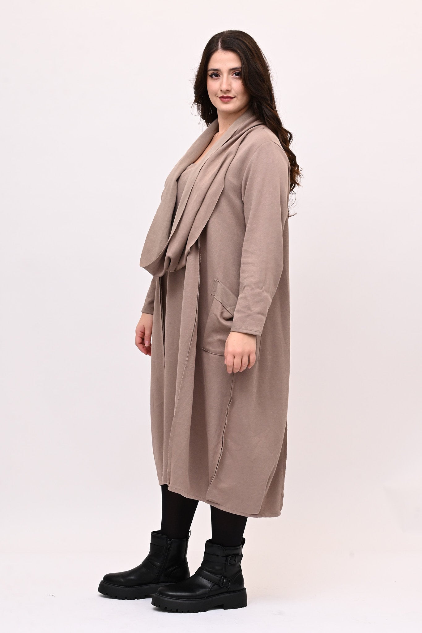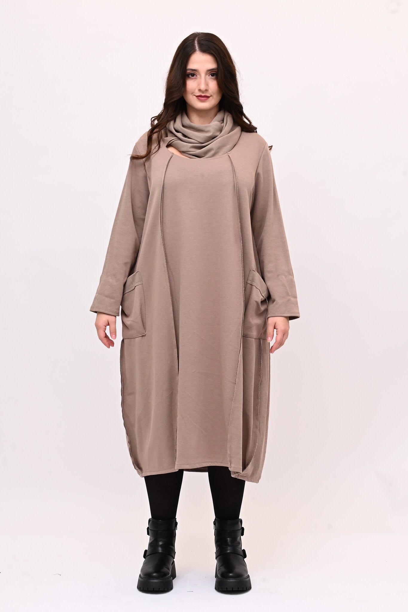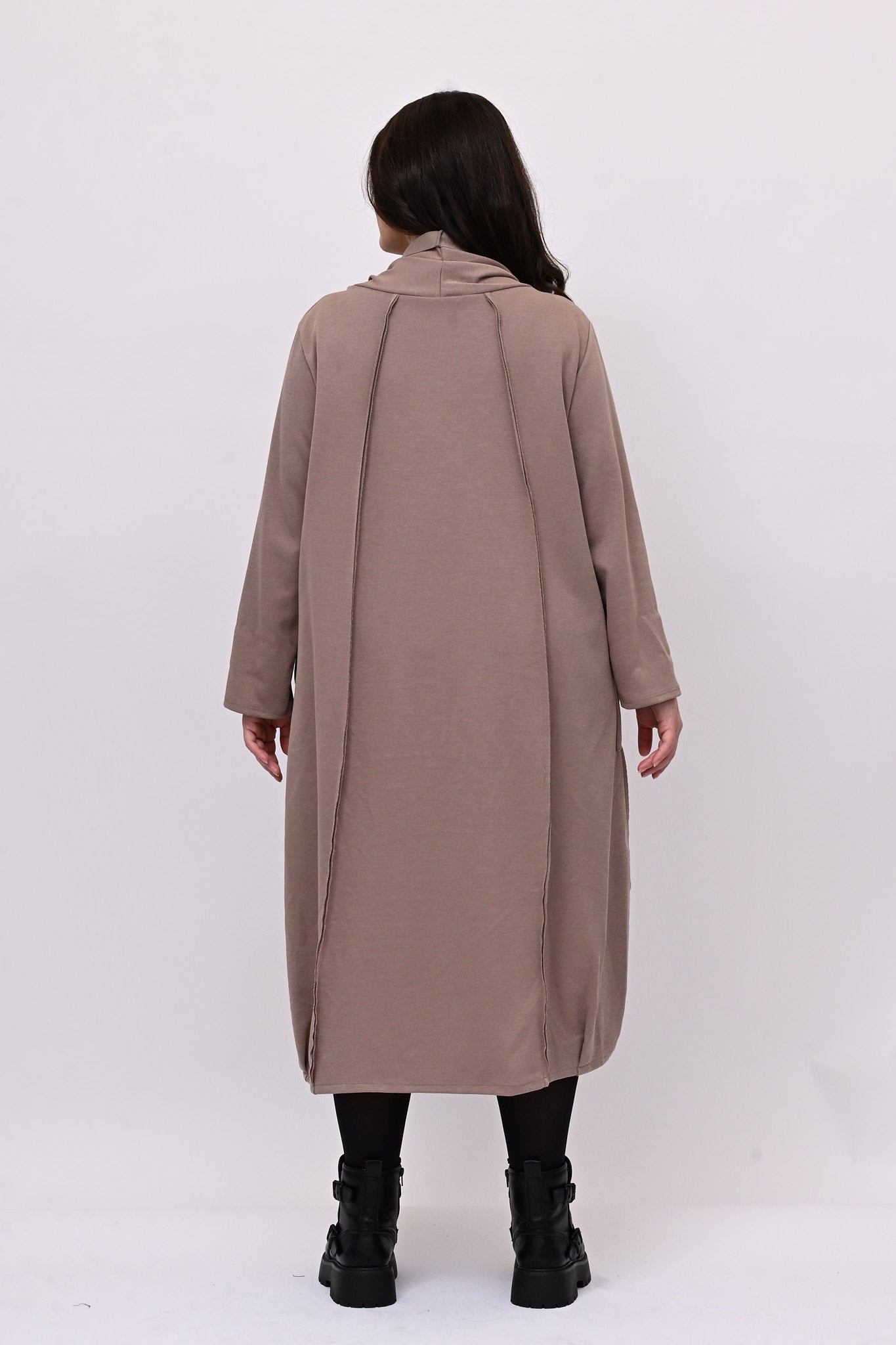 Abito in felpa al polpaccio, girocollo, manica lunga, cuciture e tasche frontali. Sciarpa integrata al collo da indossare lunga o risvoltata. Comfort e stile sporty chic in un'unica soluzione.