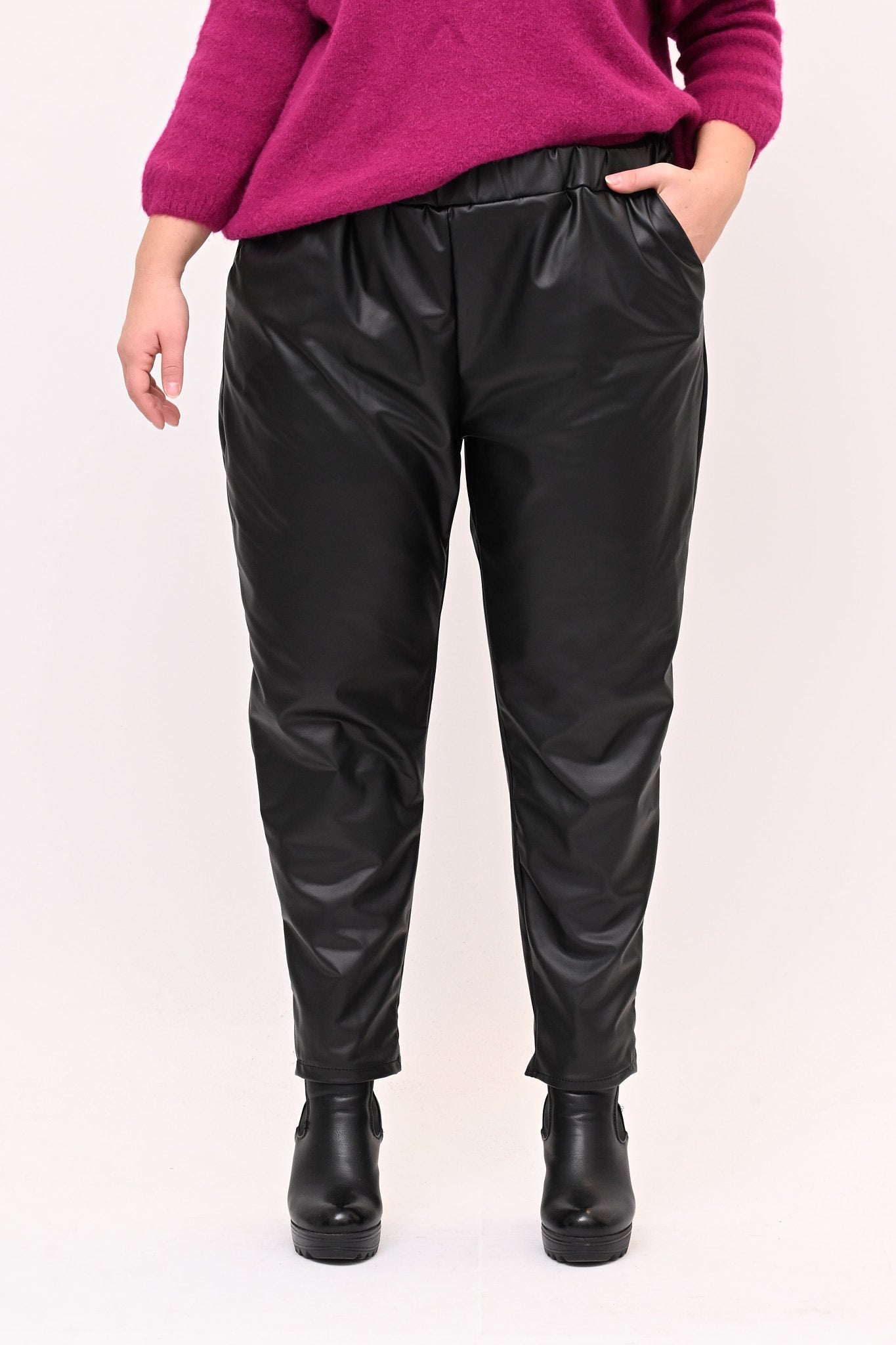 Pantaleggins in ecopelle elasticizzata, con elastico in vita e tasche. Combinano comfort e stile contemporaneo e assicurano una vestibilità aderente ma flessibile. Ideali un look moderno e versatile e per completare outfit dal carattere deciso e grintoso.