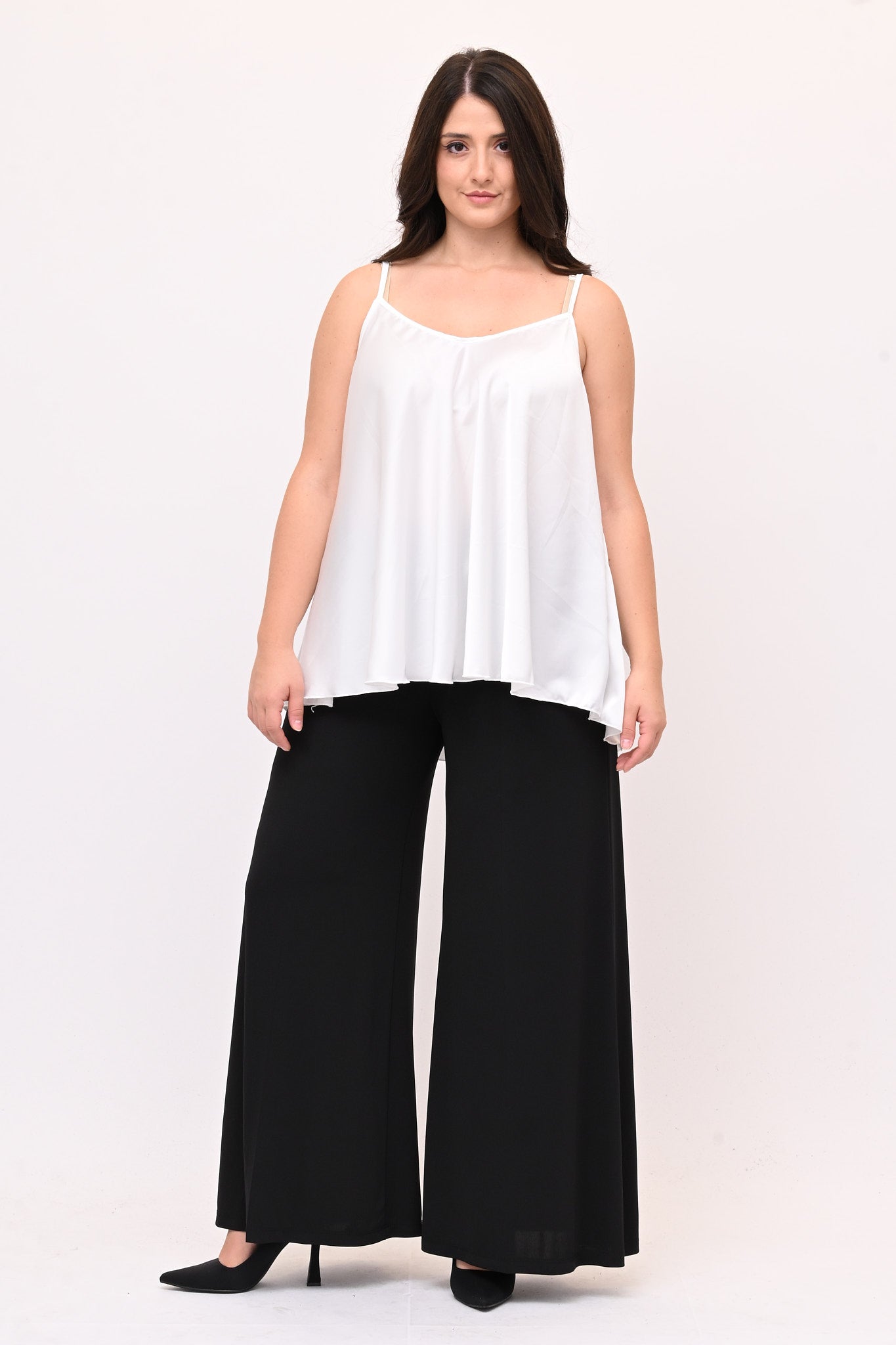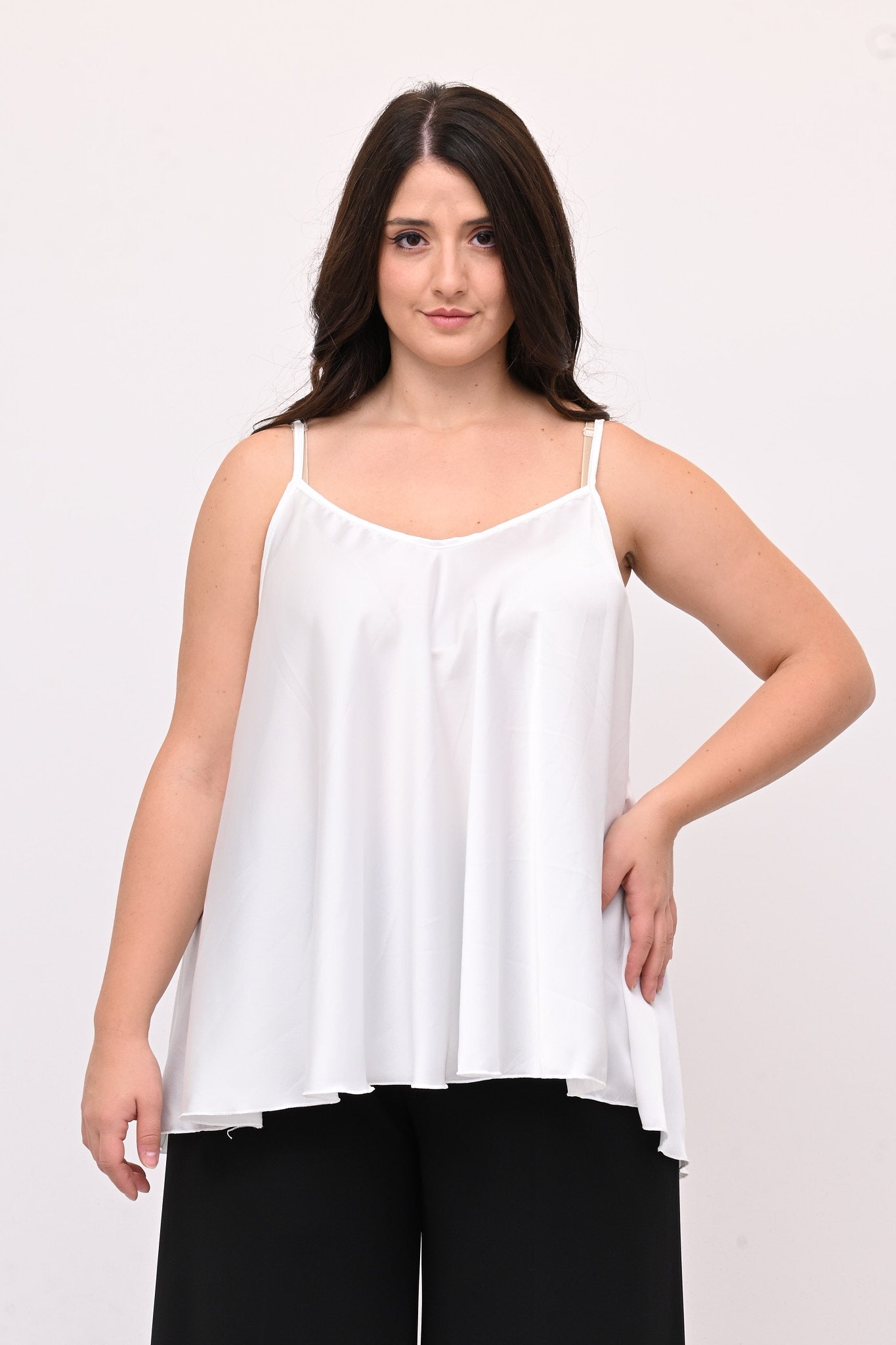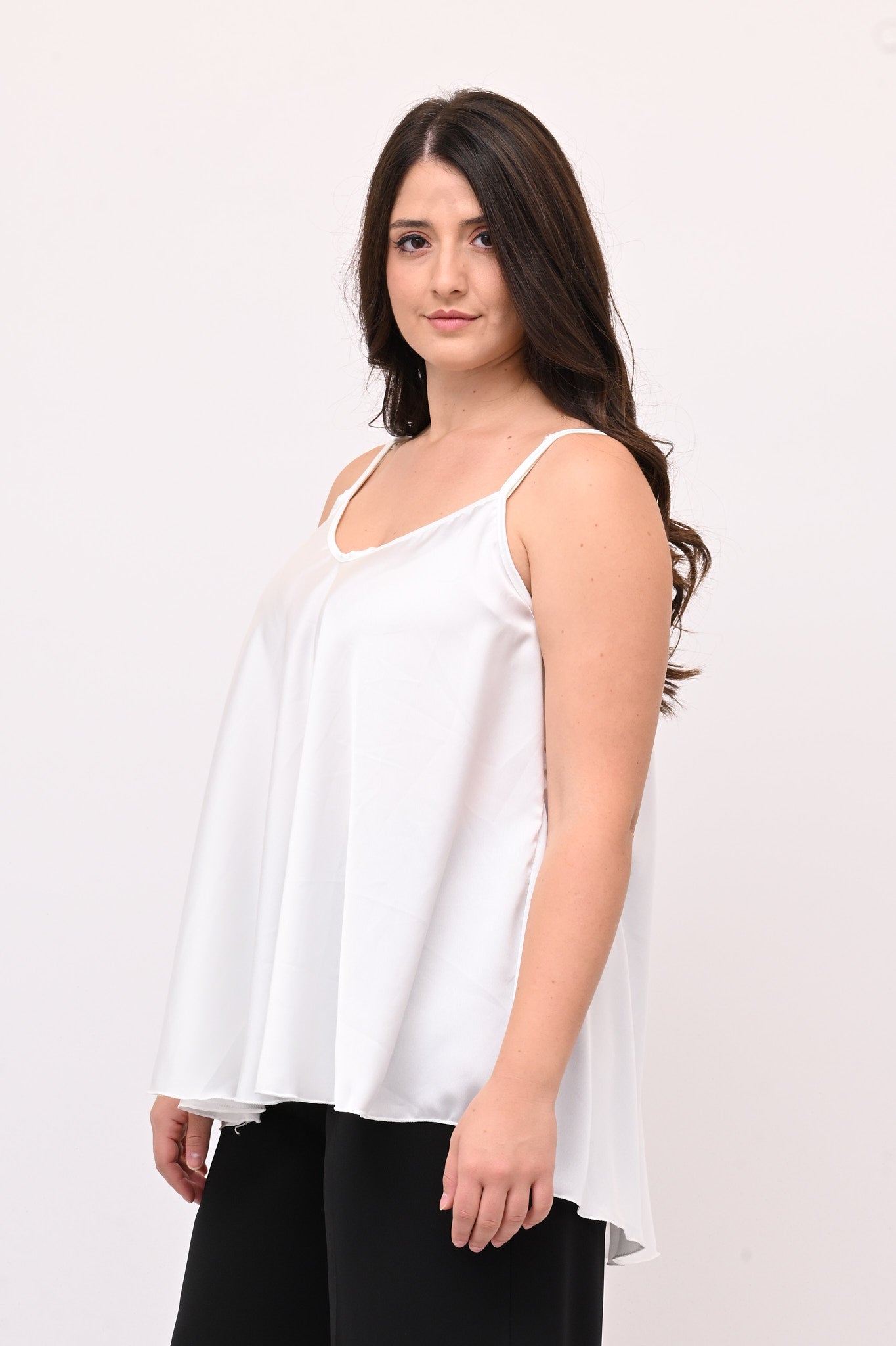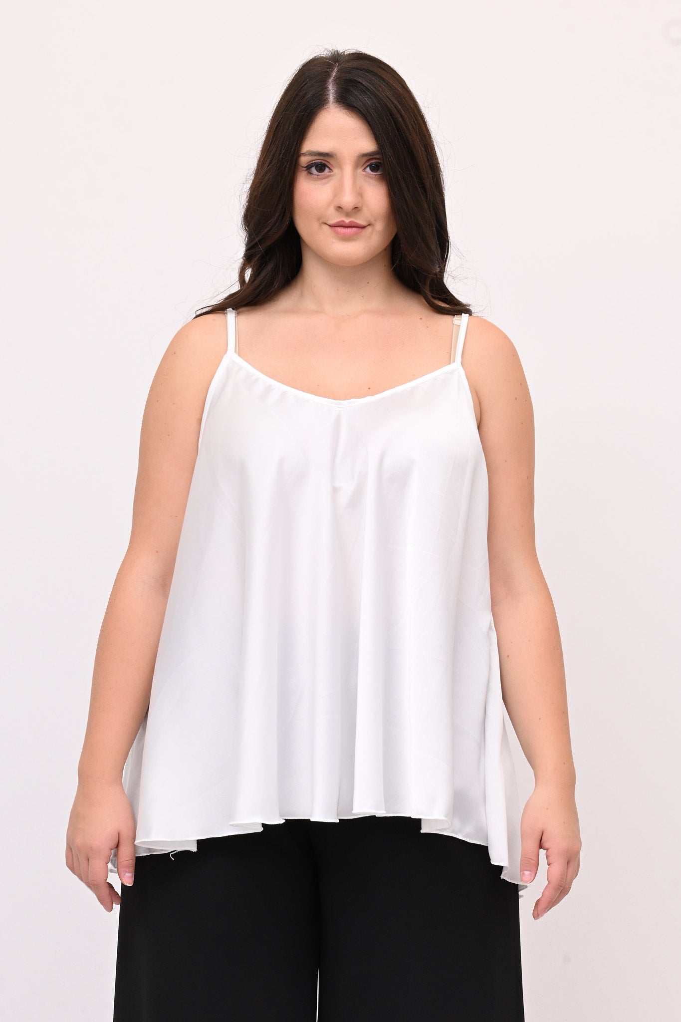 Top in raso, con bretelle sottili, scollatura a V, modello a ruota. Un top femminile, dalla vestibilità fluida, che può essere indossato per look quotidiani di tendenza, ma anche per eventi più eleganti. Un must have cool e senza tempo.