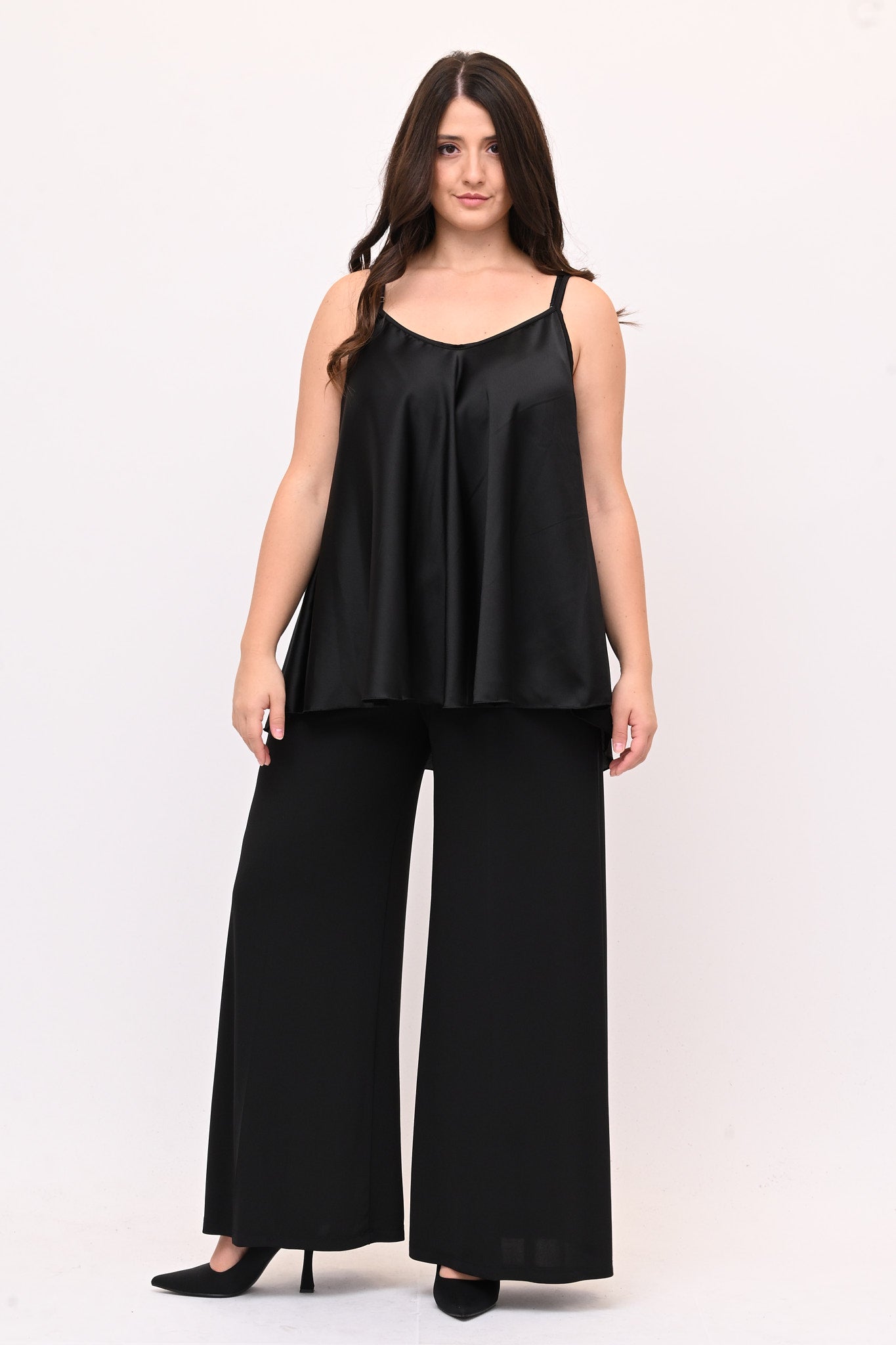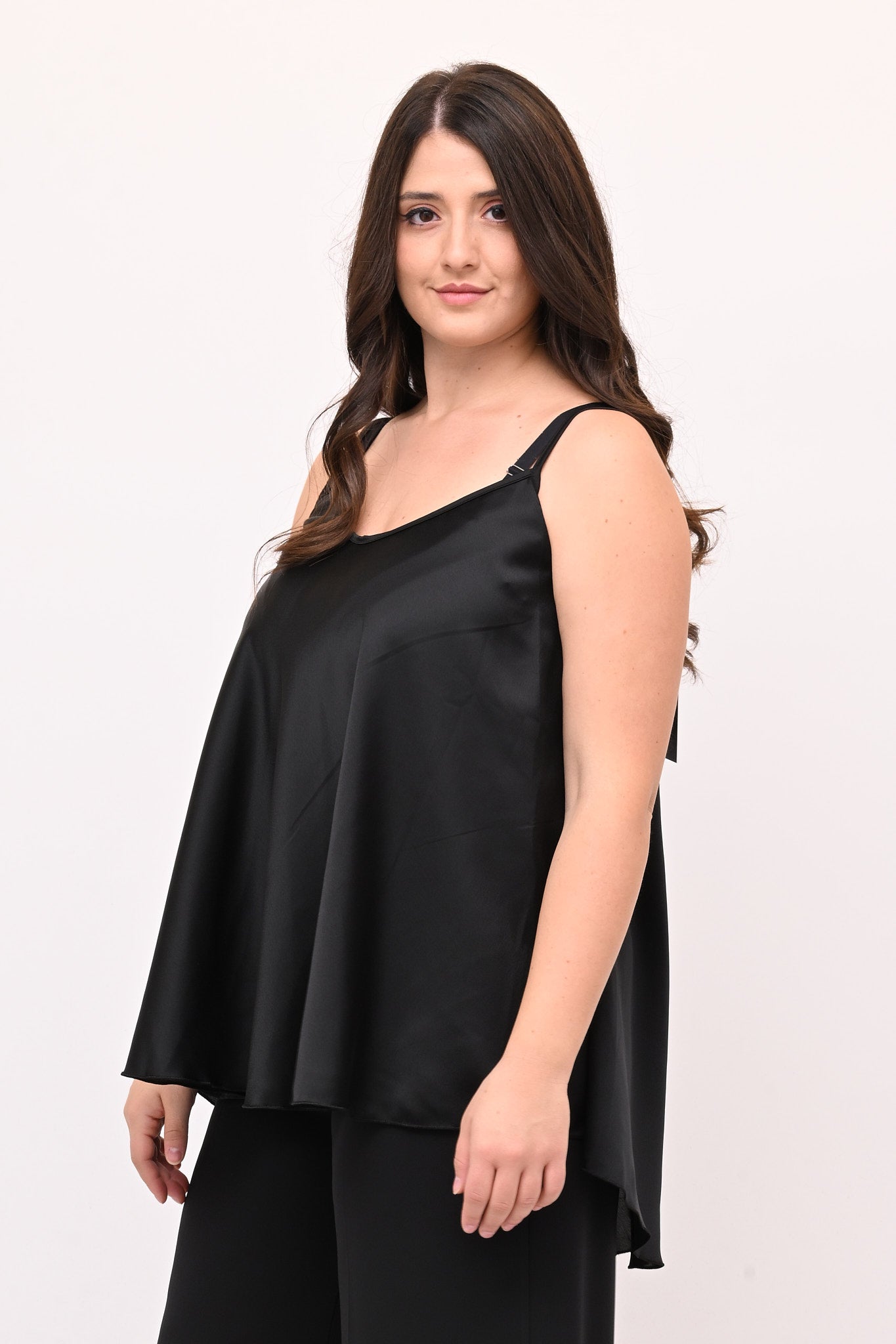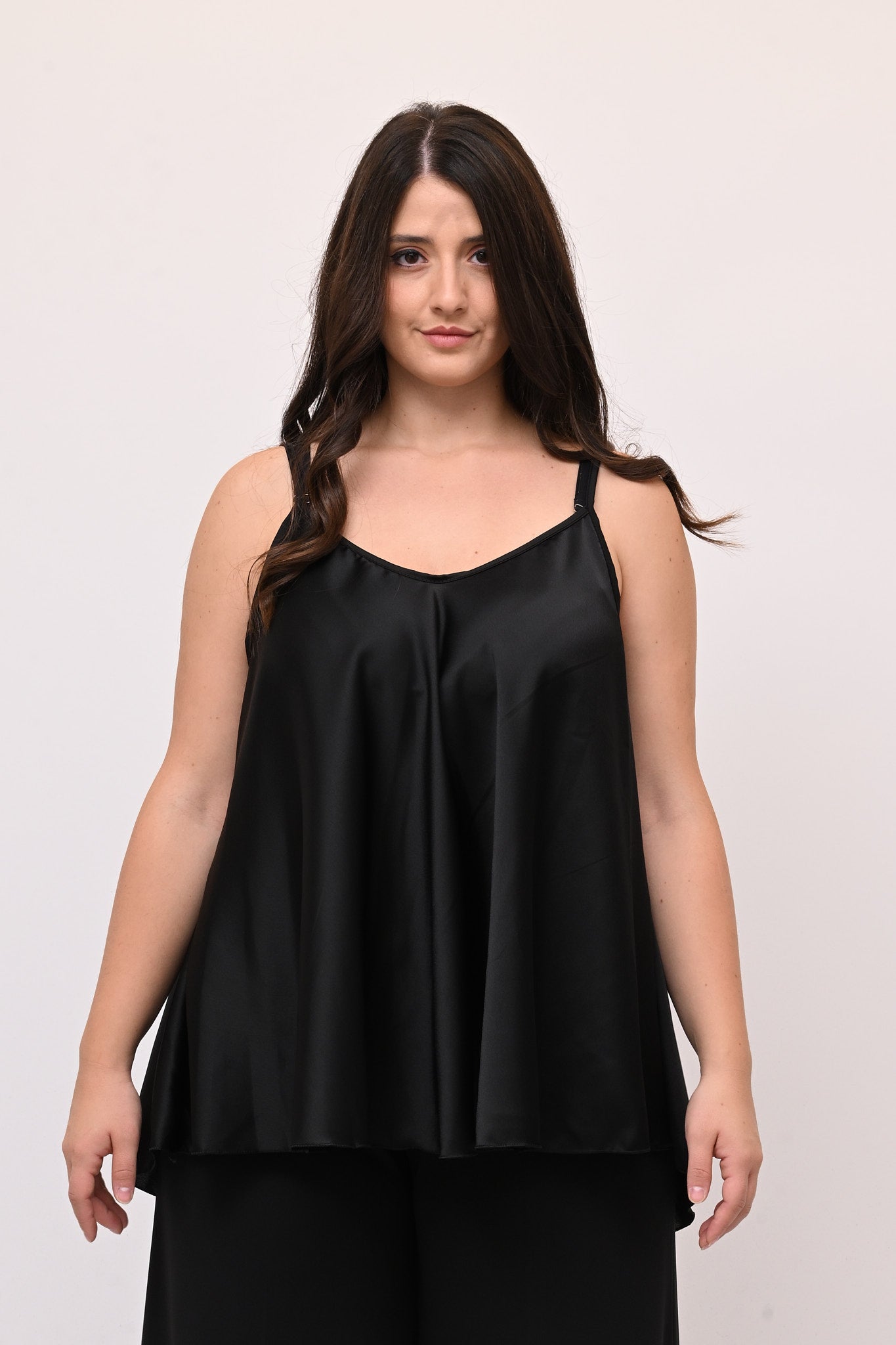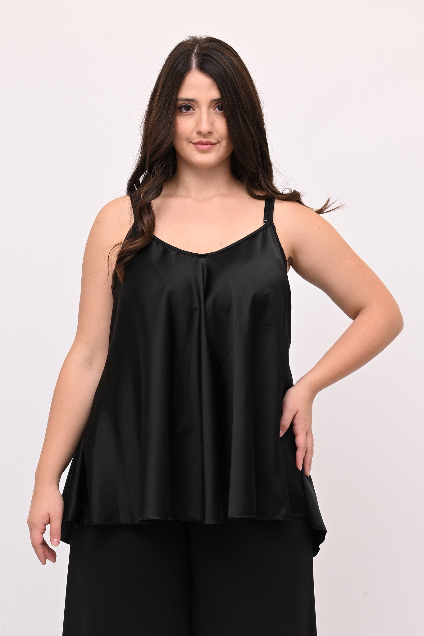 Top in raso, con bretelle sottili, scollatura a V, modello a ruota. Un top femminile, dalla vestibilità fluida, che può essere indossato per look quotidiani di tendenza, ma anche per eventi più eleganti. Un must have cool e senza tempo.
