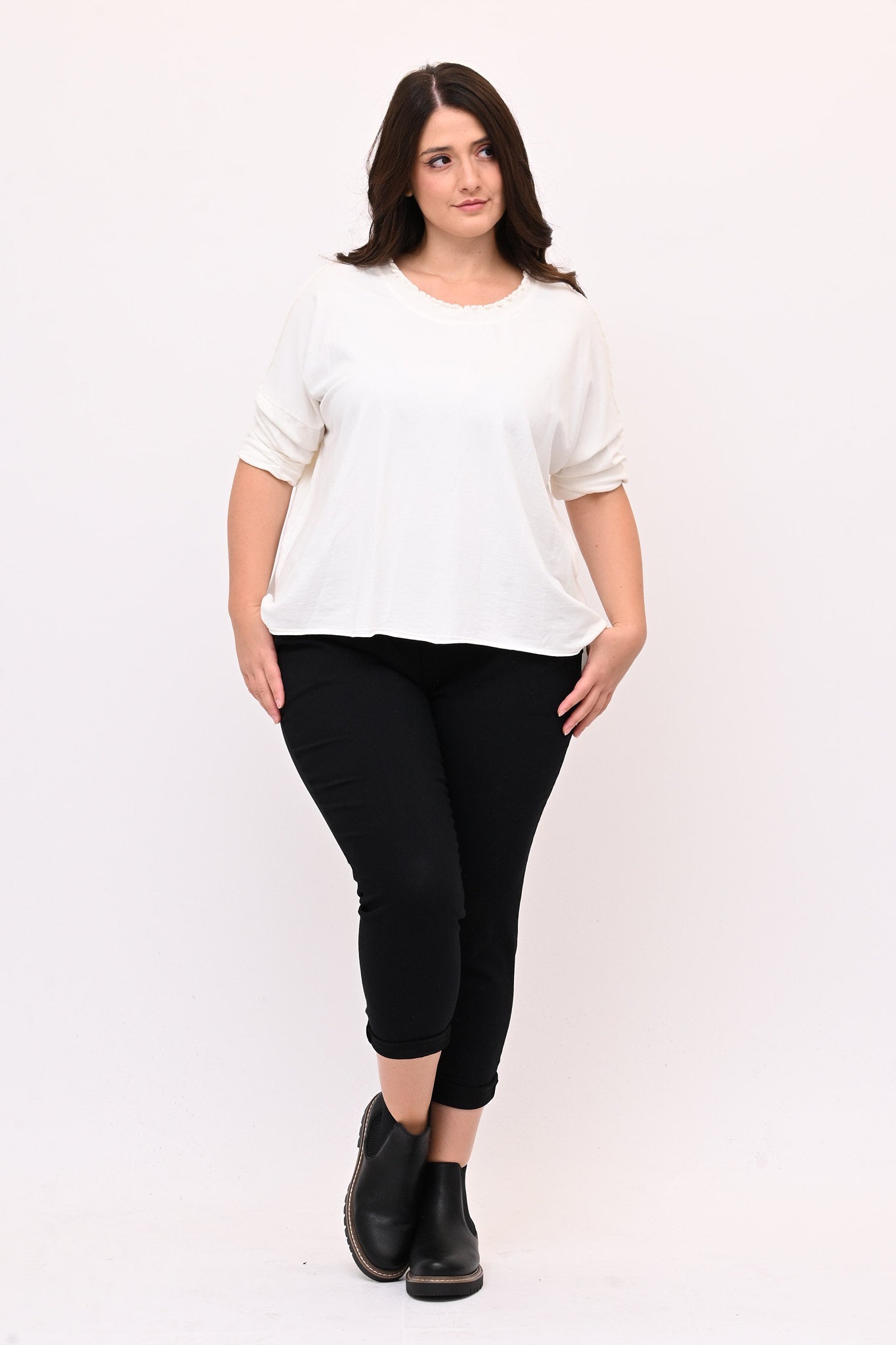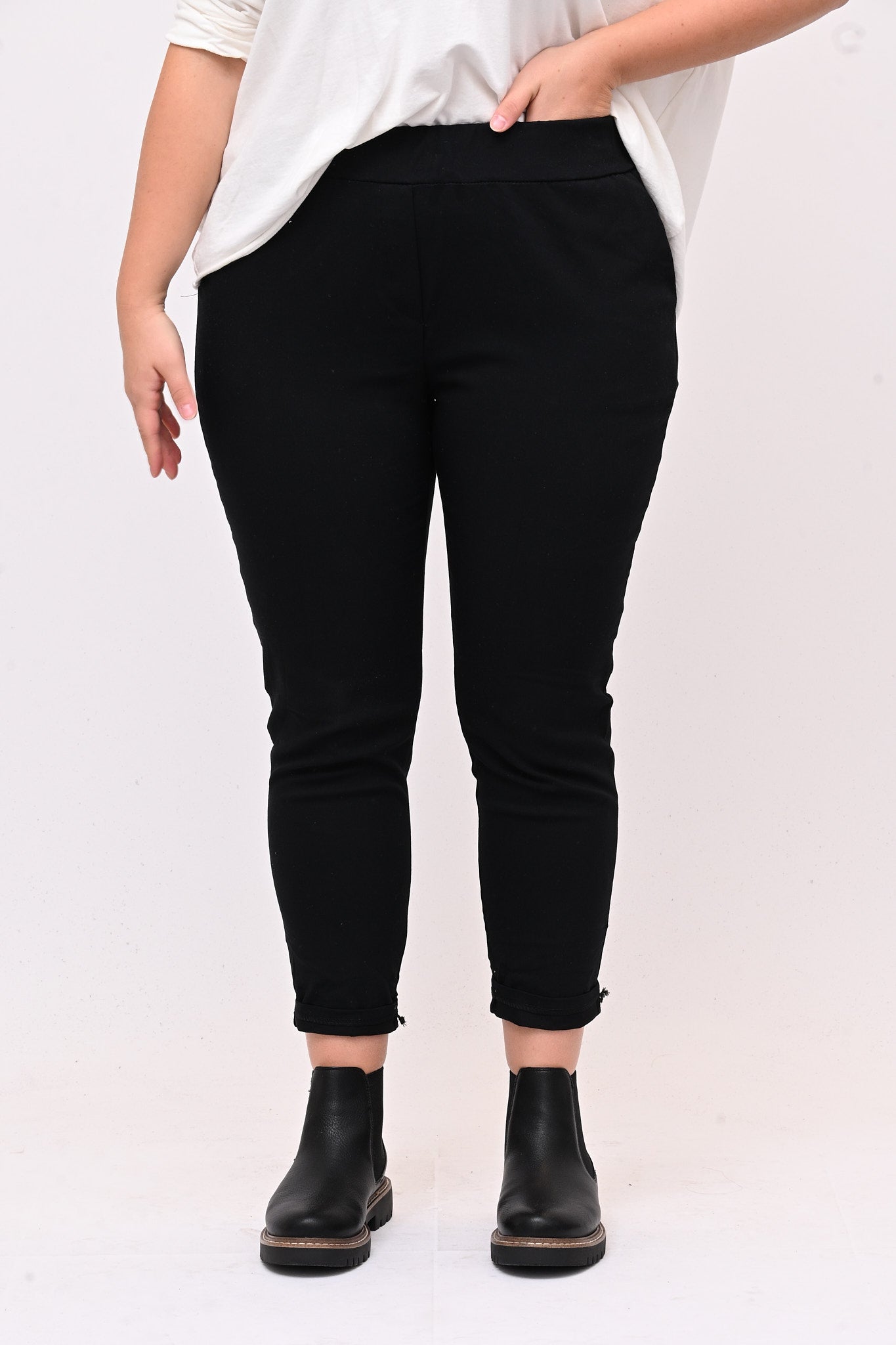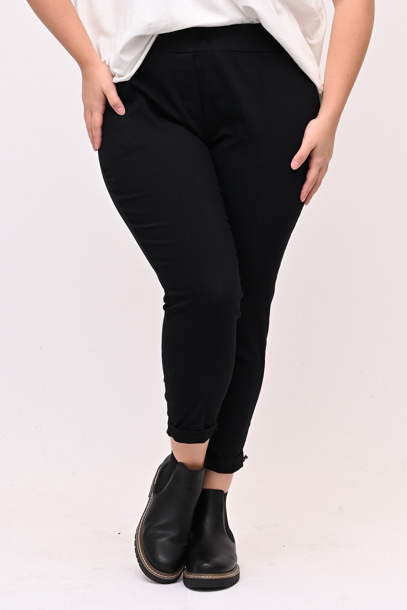 Pantaleggins in bengalina elasticizzata, con tasche. Il taglio aderente definisce la figura e l'elastico in vita assicura una vestibilità comoda e perfetta, garantendo comfort senza sacrificare lo stile. E' un pantalone 4 stagioni ideale per look casual e formali. Abbinato con top, camicie o giacche è versatile e adatto a chi cerca un equilibrio tra praticità e stile.