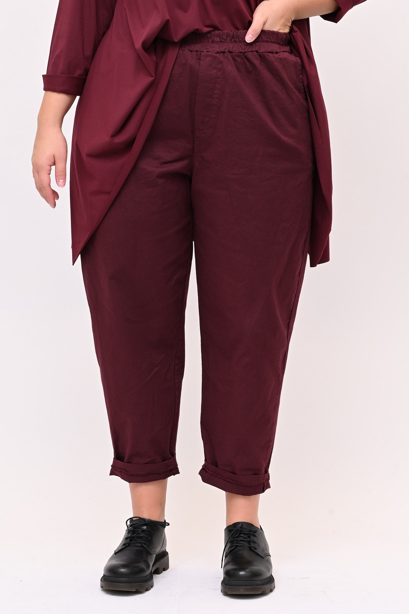 Pantalone in cotone elasticizzato, modello baggy, con elastico in vita, tasche a vista sul davanti e a toppa nel retro. La vestibilità rilassata lo rende ideale per outfit giornalieri e trendy.