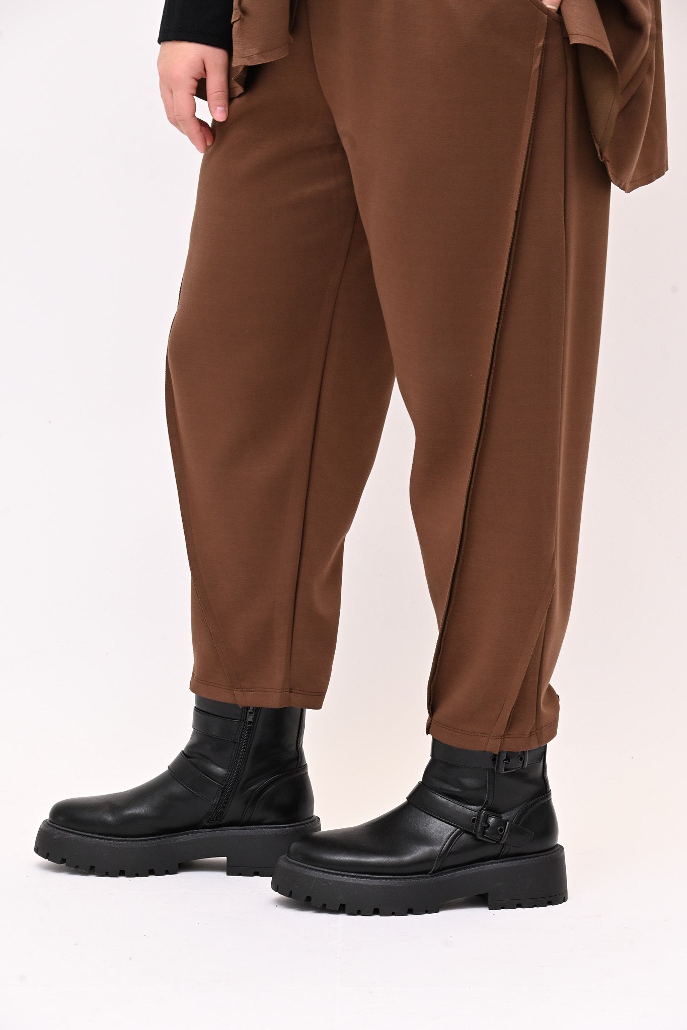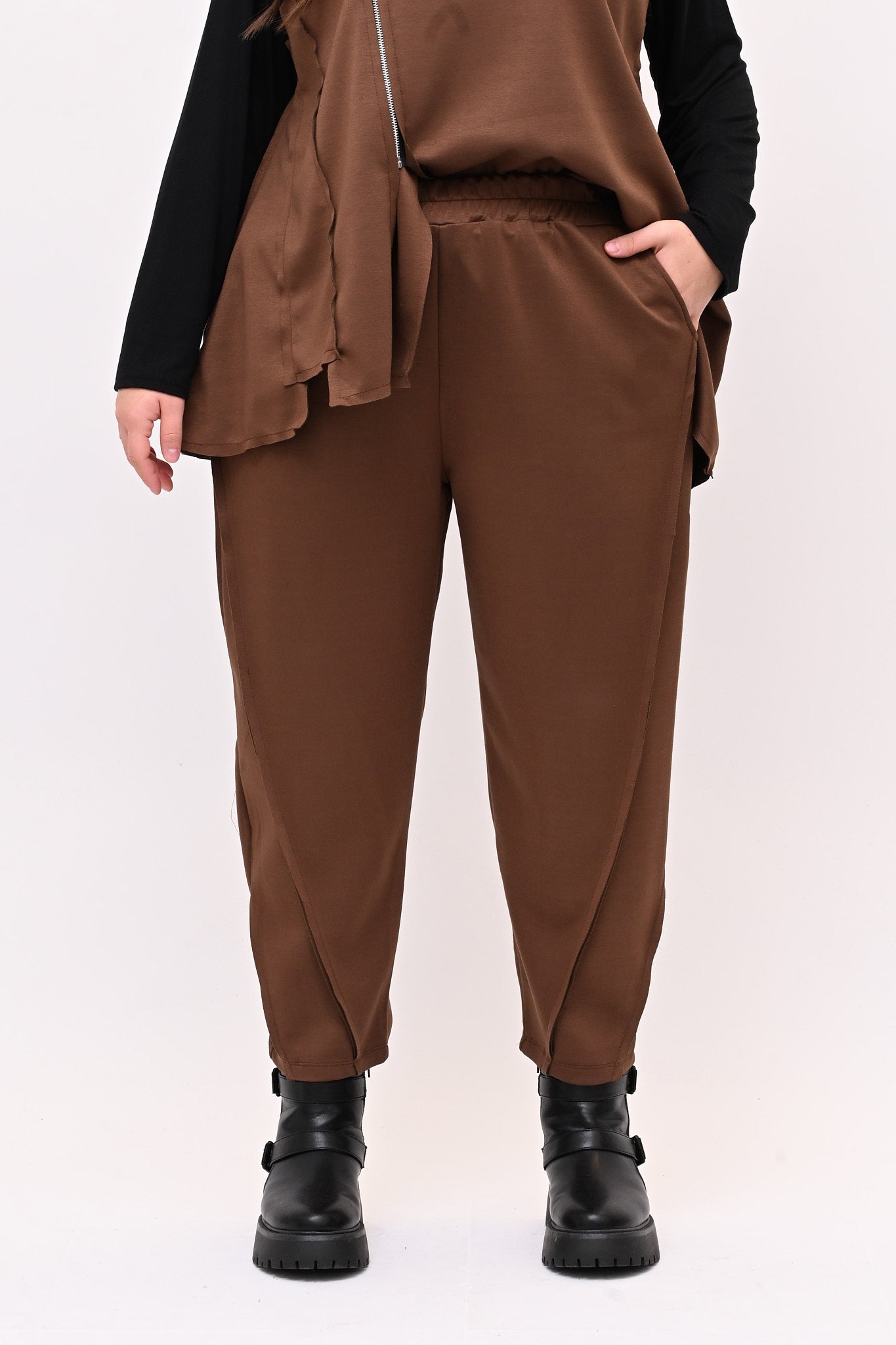 Pantalone modello carota, con elastico in vita, tasche e cuciture a vista per un design semplice ma distintivo. Perfetto per chi cerca comodità e stile quotidiano.