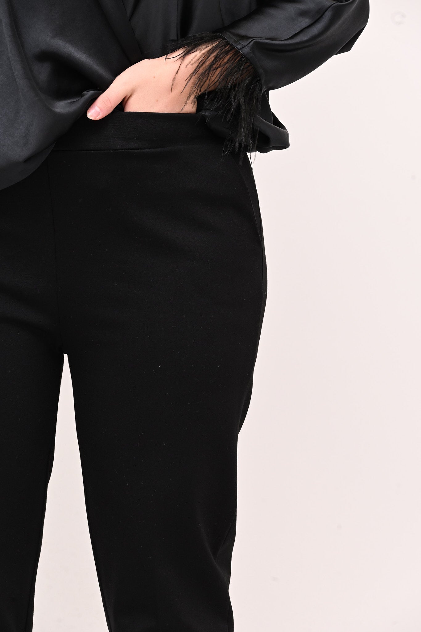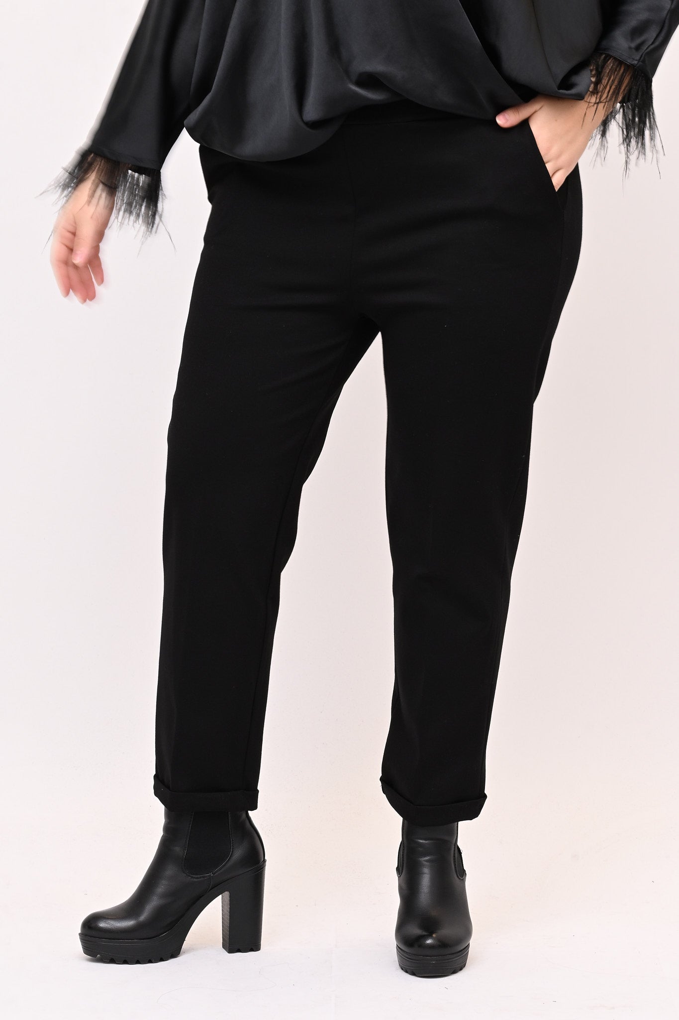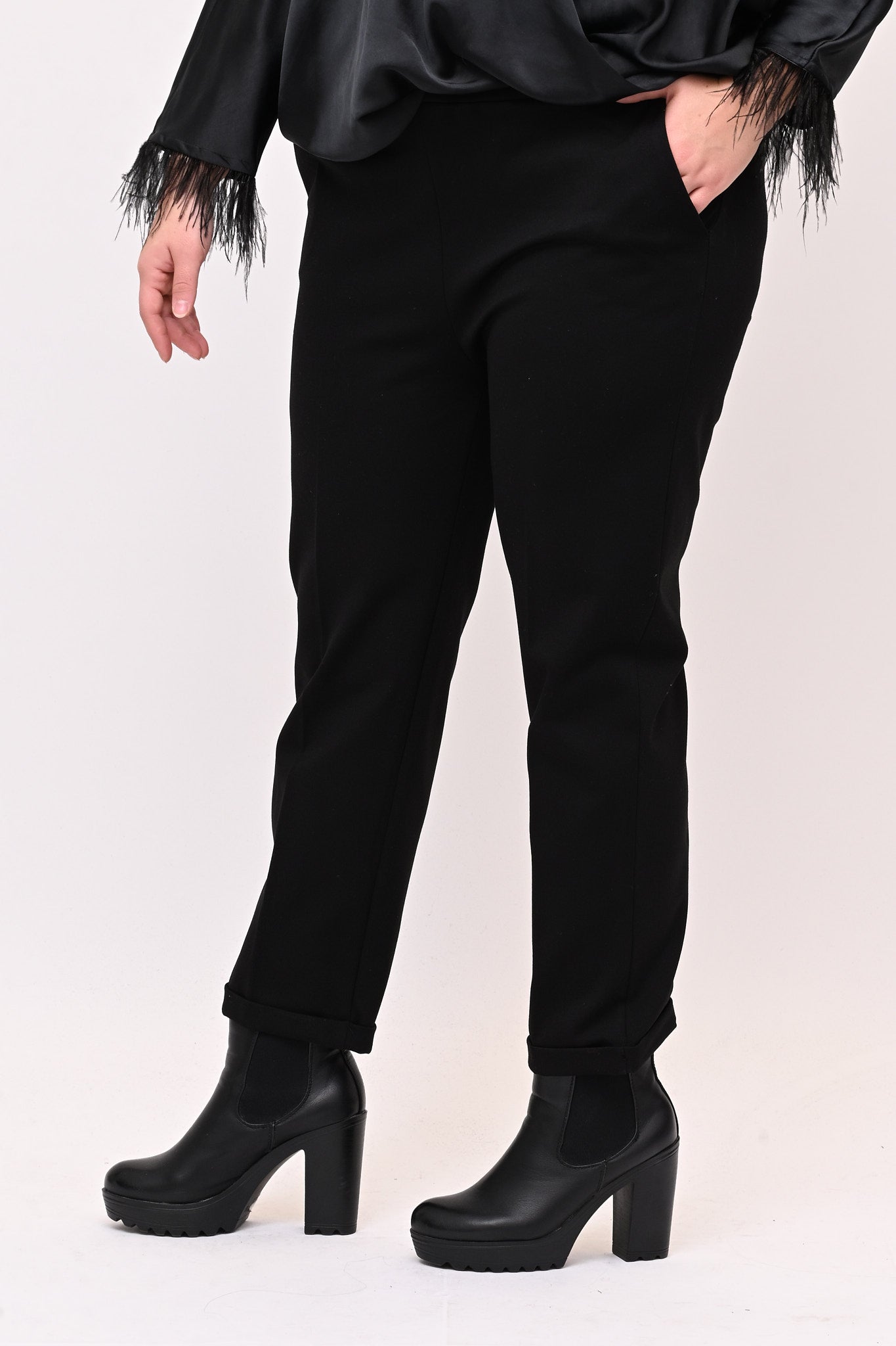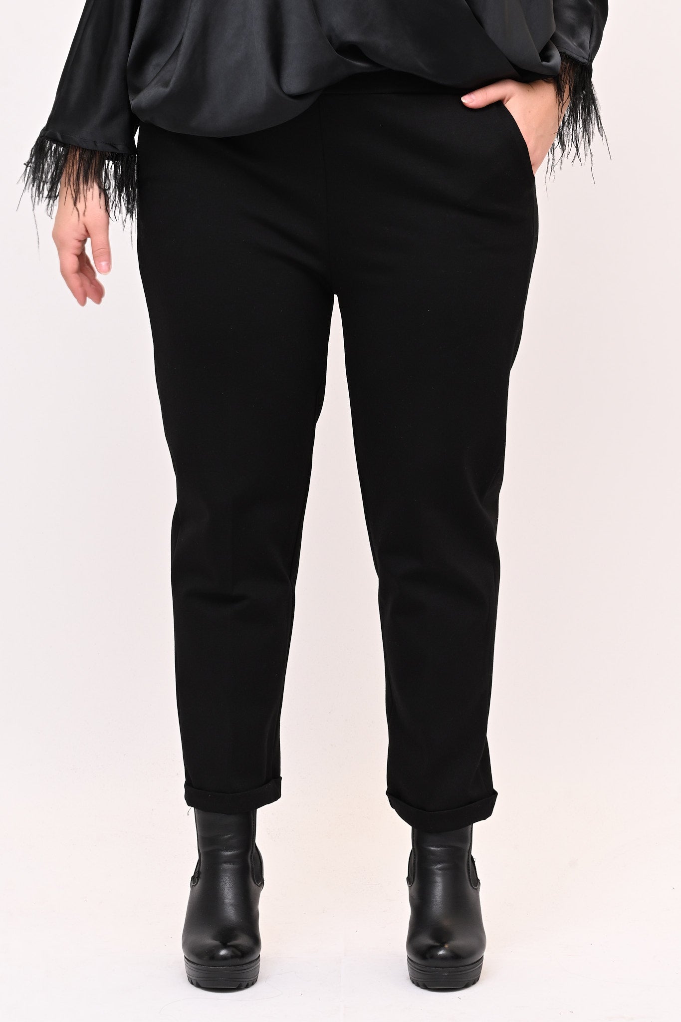 Pantaleggins in punto Milano elasticizzato, con risvolto e tasche a filo. Un capo versatile, confortevole ed essenziale, da utilizzare come base per ogni tipo di outfit. Un must have da acquistare in tutti i colori.