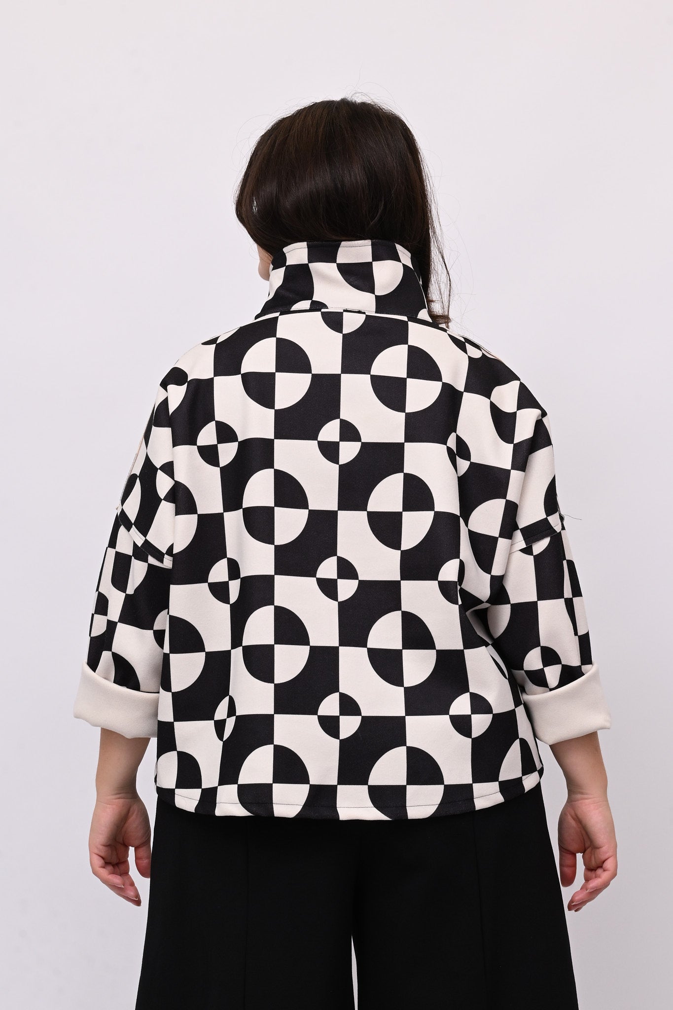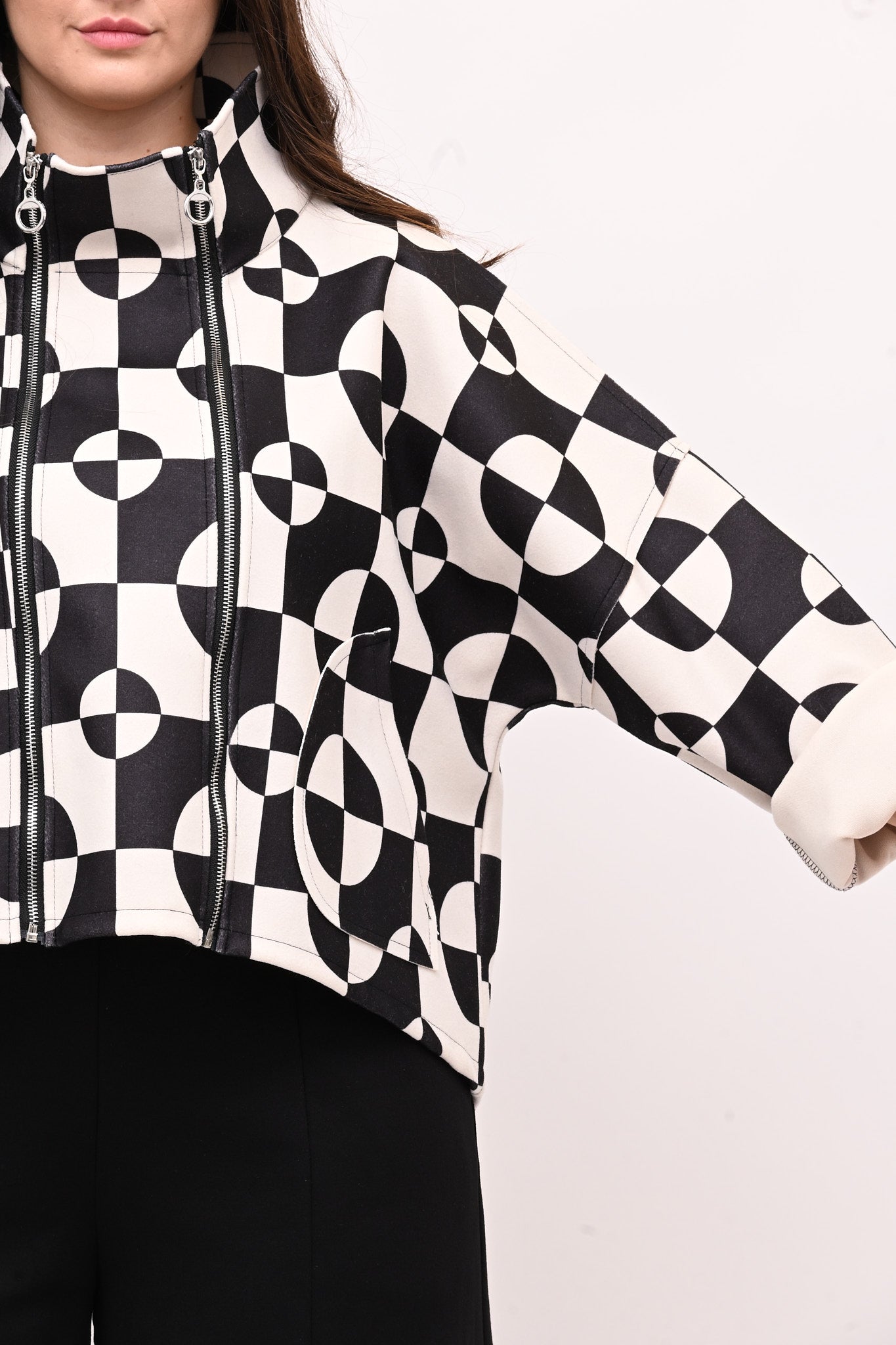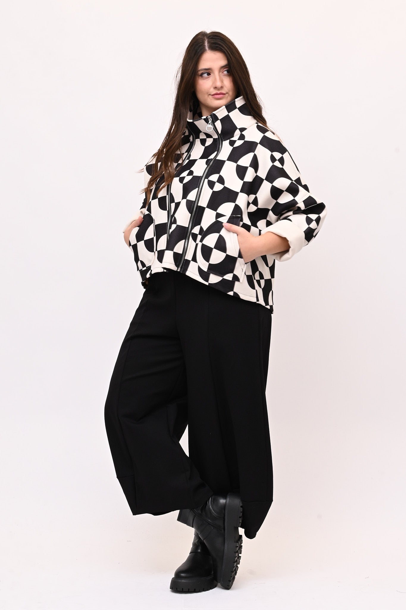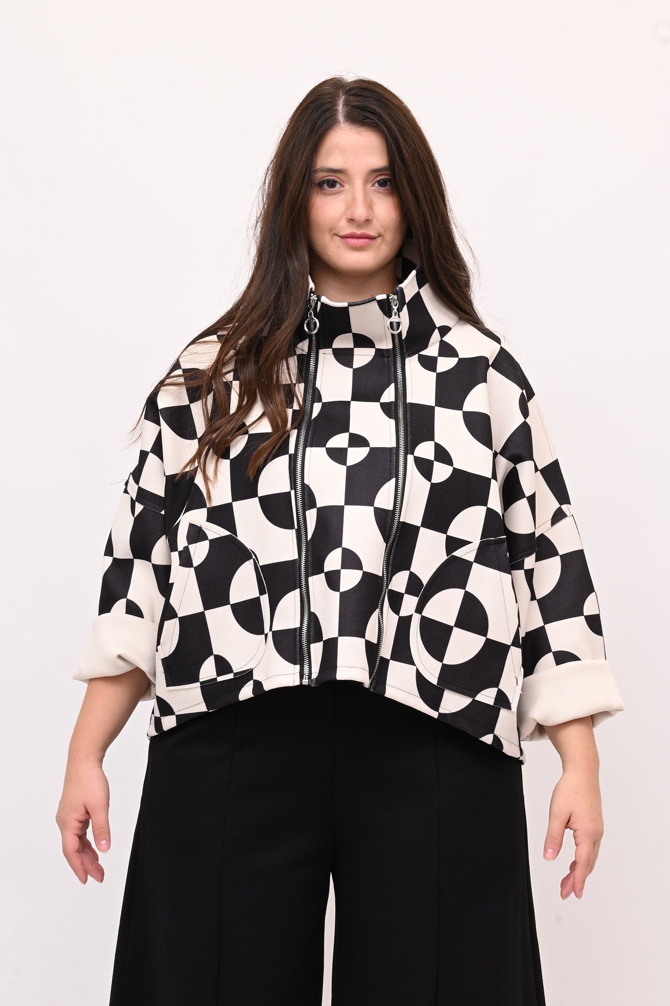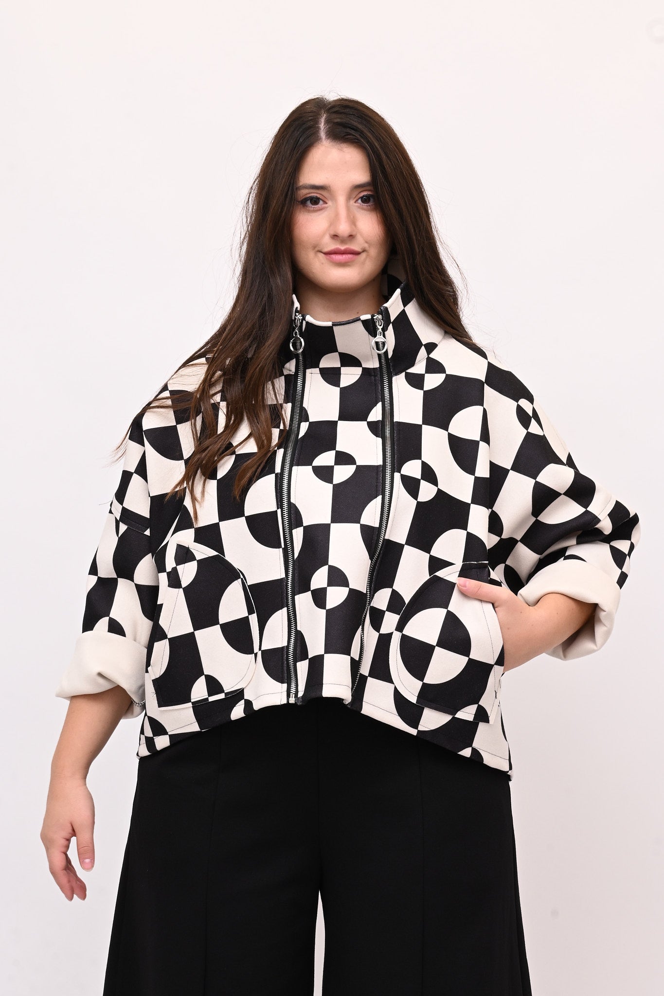 Cappottino a fantasia con doppia zip frontale, maniche lunghe e tasche a toppa. Versatile e pratico nell’uso quotidiano, è ideale per chi cerca un capo distintivo senza rinunciare allo stile.