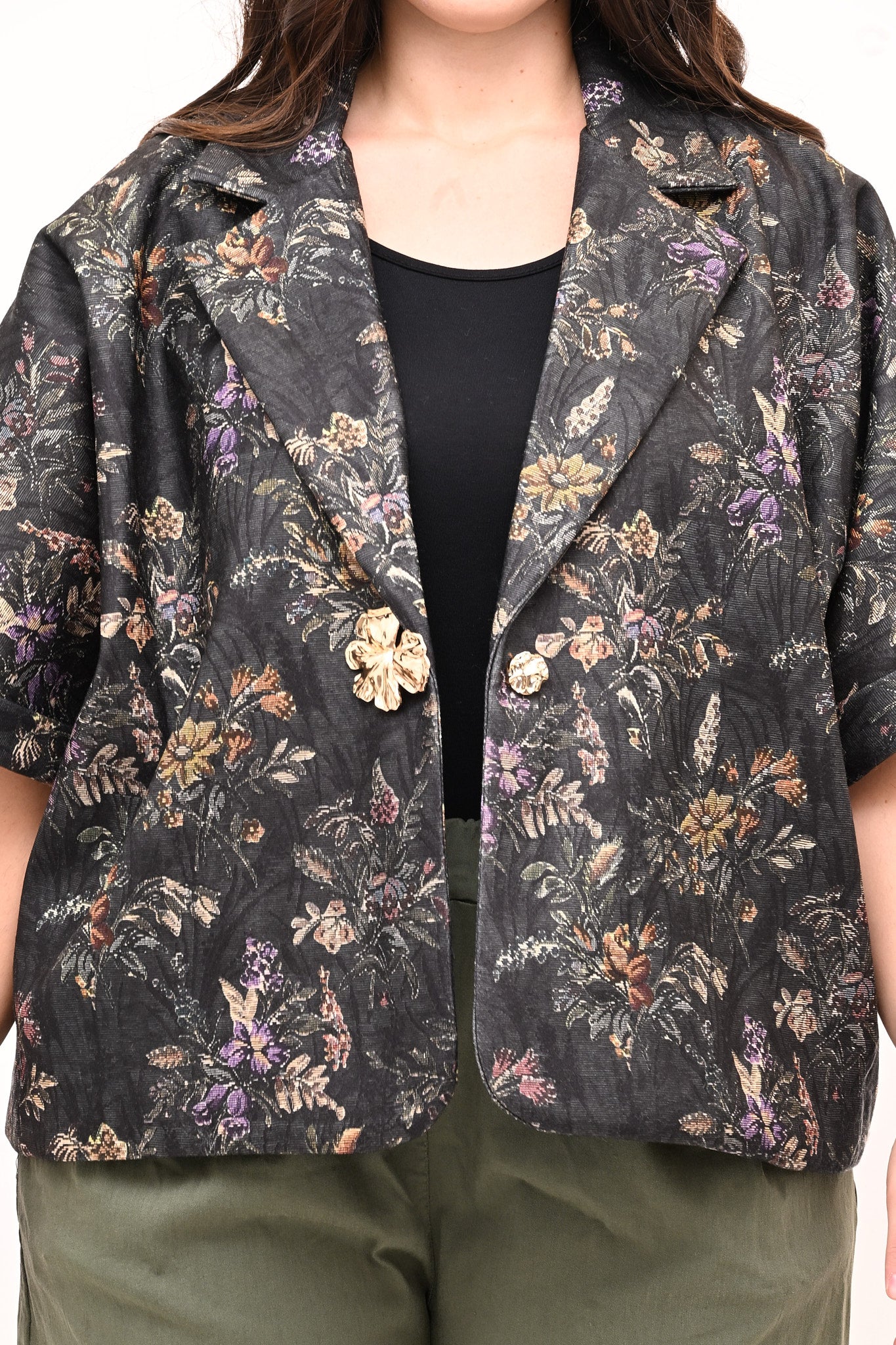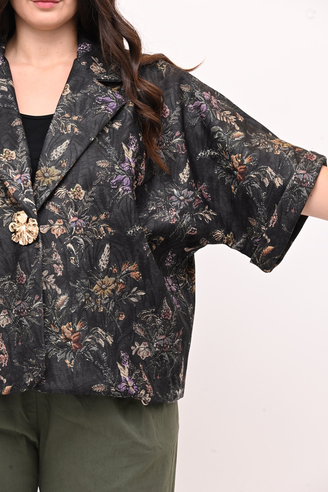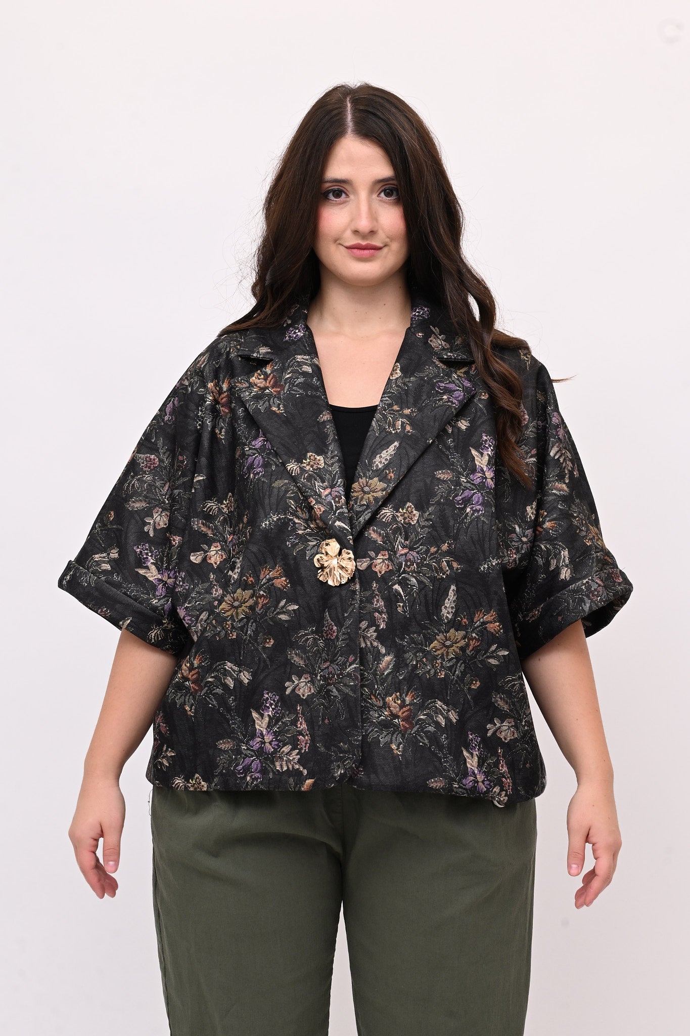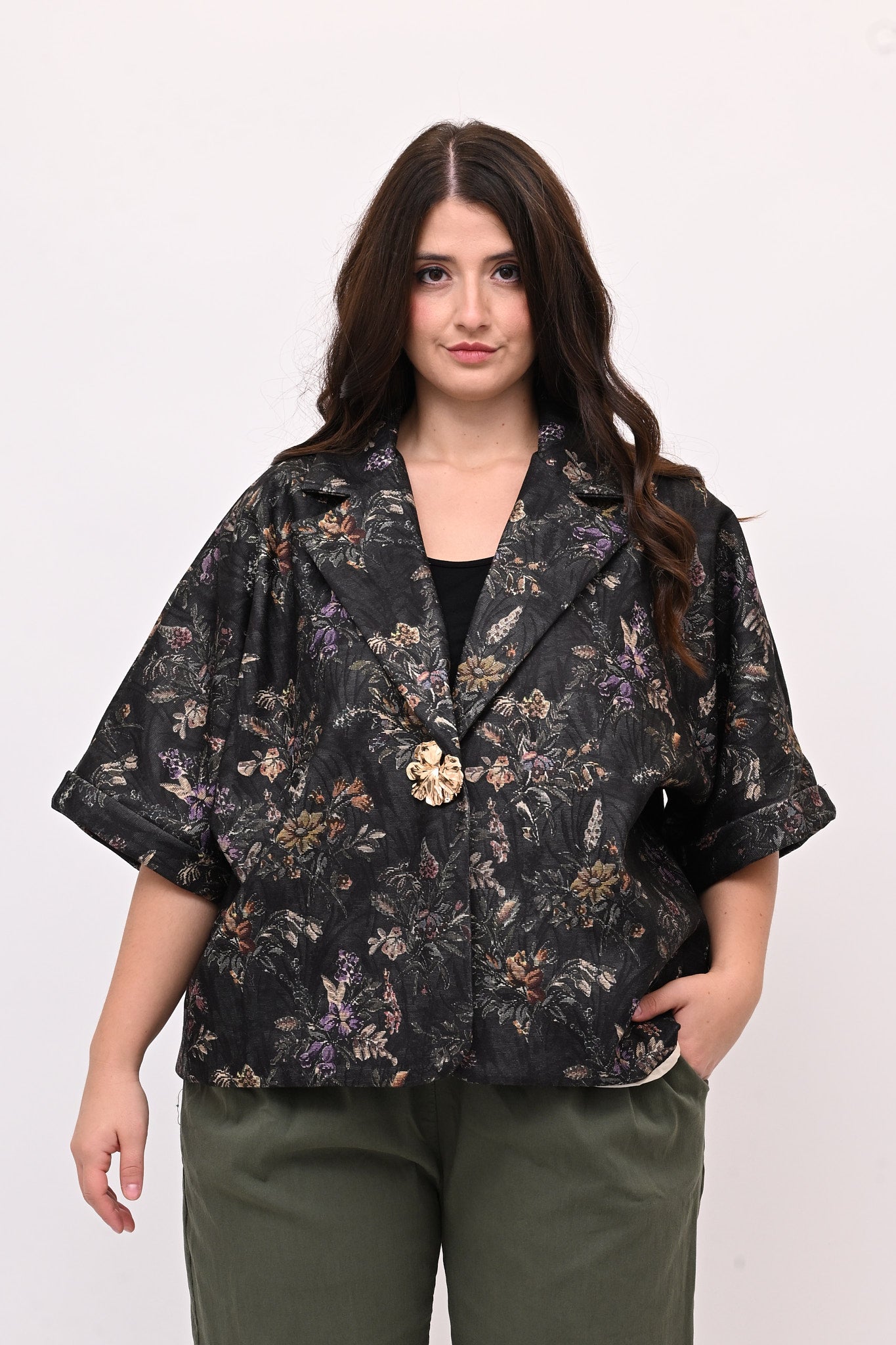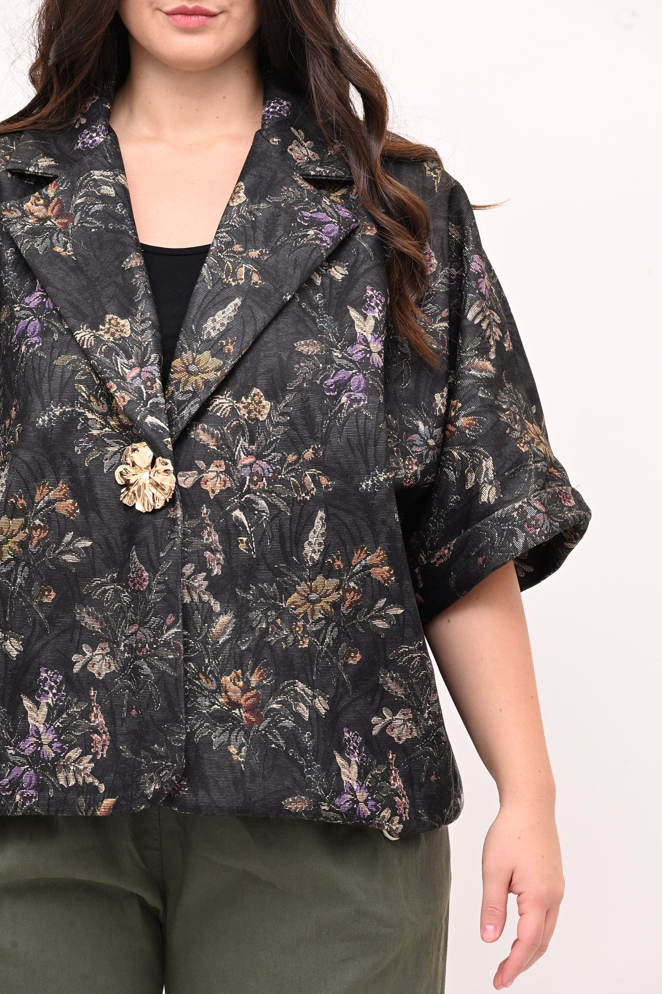 Giacca crop in tessuto broccato, maniche corte, fodera interna, bottone oro e spilla coordinata. Un capo elegante e distintivo, ideale per chi cerca stile e comfort. Per outfit easy chic distintivi.