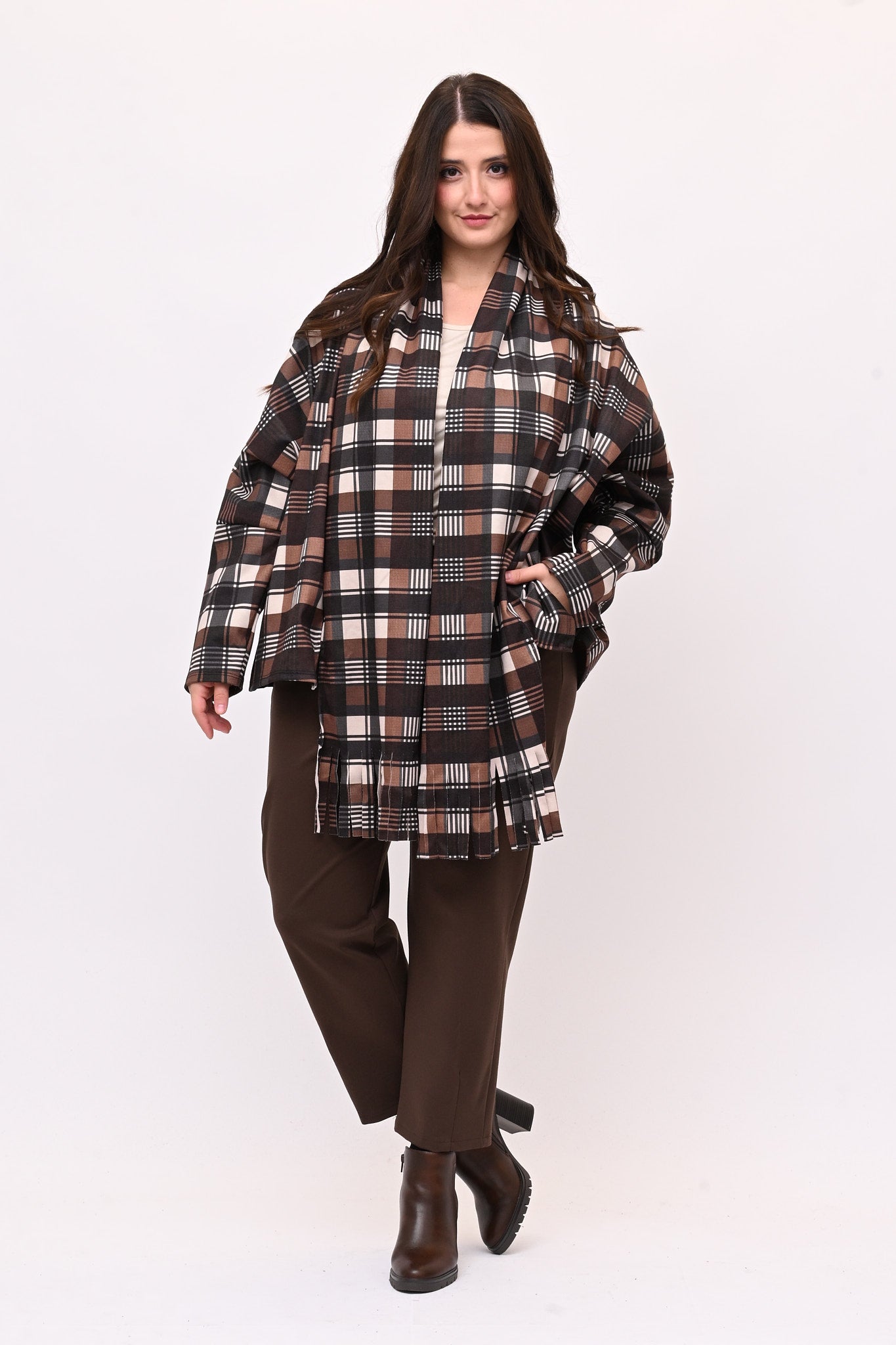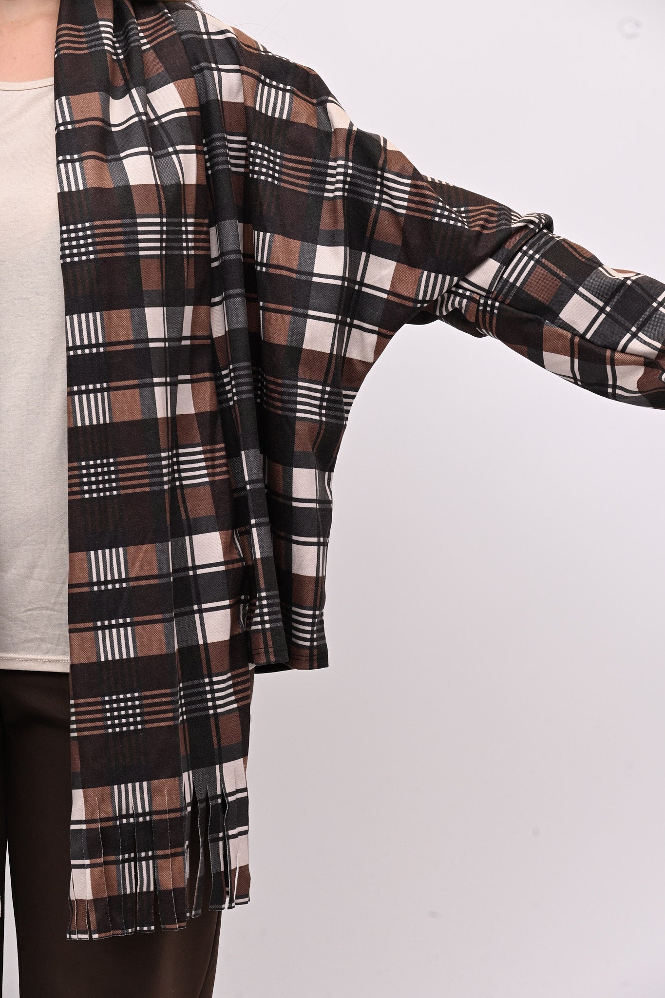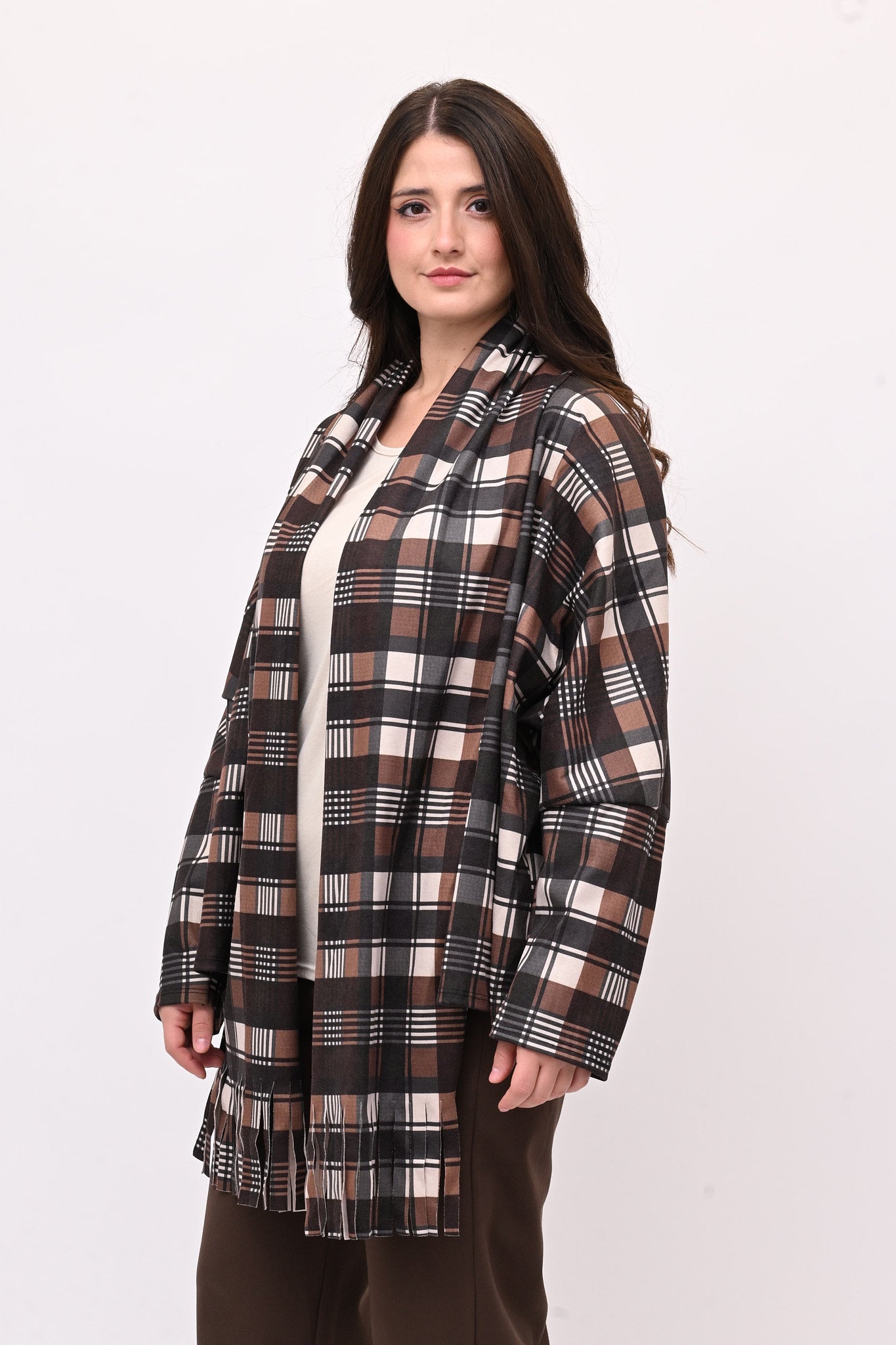 Giacca in tessuto tartan, spalla scesa e rever a sciarpa con frange. Un capo stiloso e alternativo, che combina comfort e originalità. Perfetta per abbinamenti casual e di tendenza.