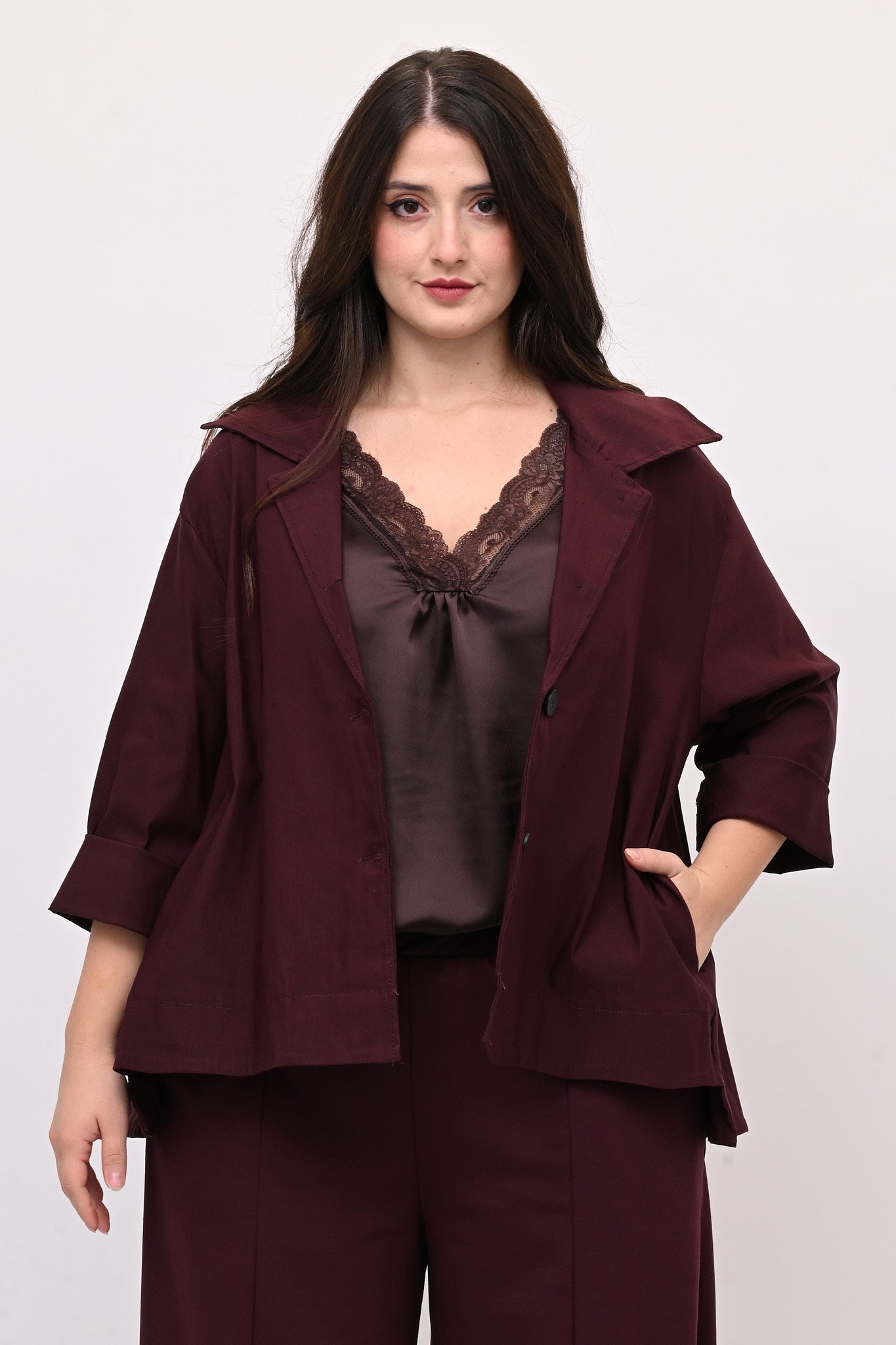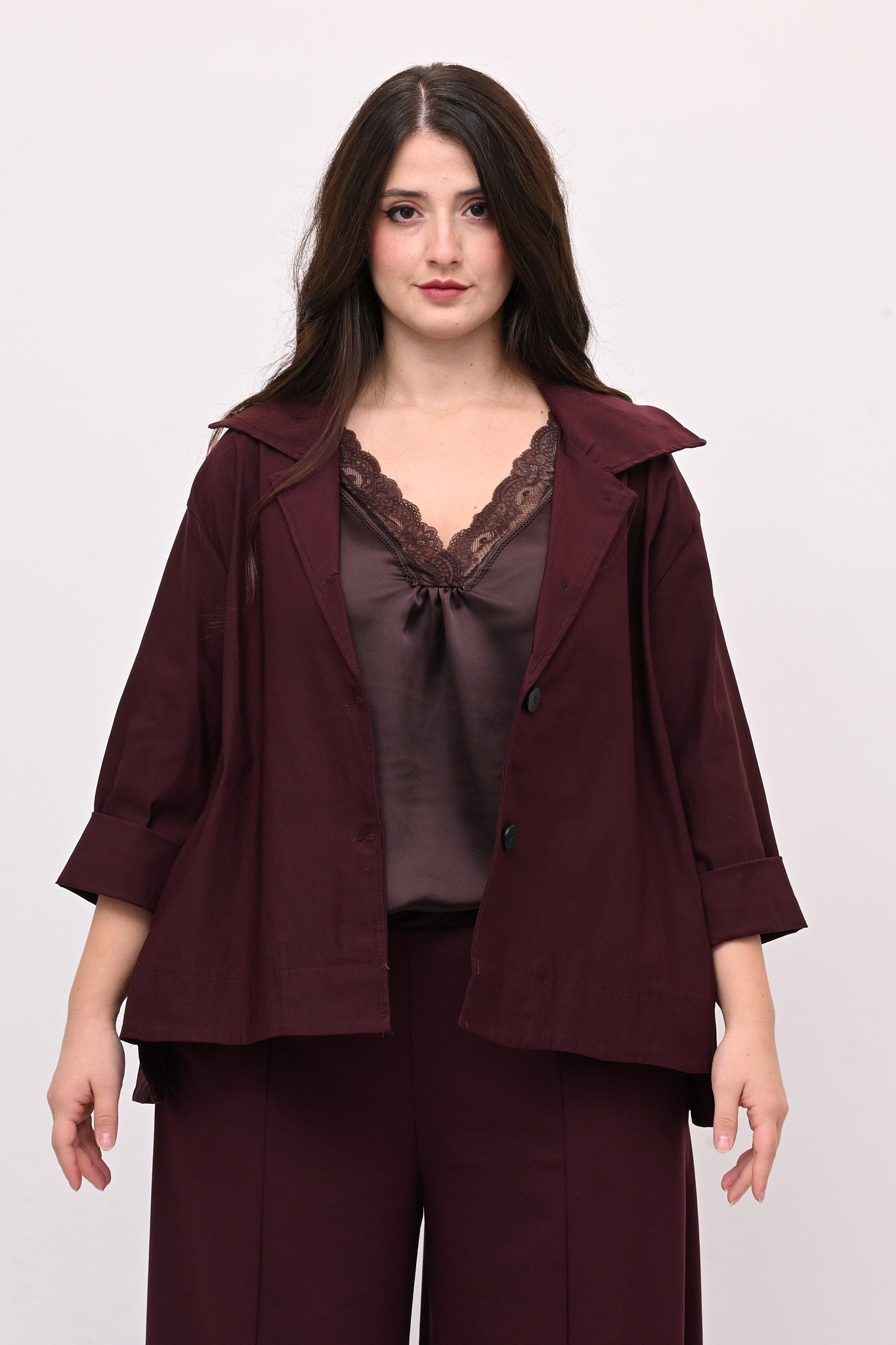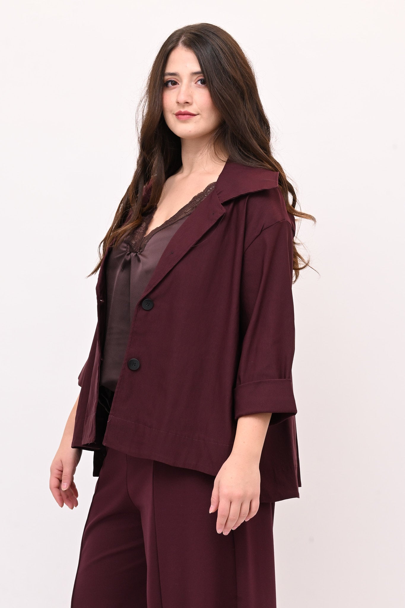 Giacca in bengalina elasticizzata, con colletto e bottoni, tasche laterali e pince sul retro. La vestibilità over e il taglio ad A la rendono versatile e confortevole, perfetta per uno stile urbano contemporaneo e femminile.