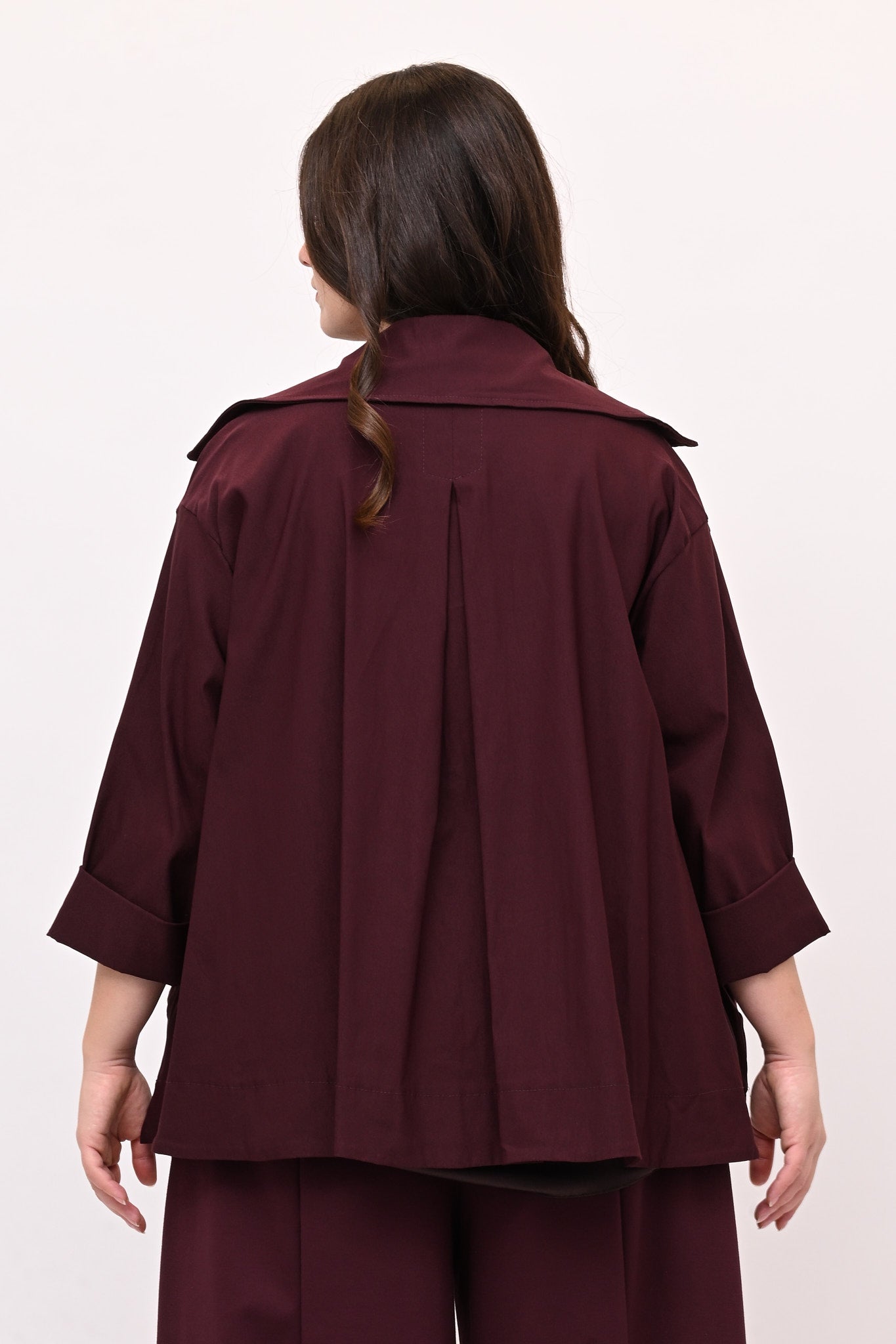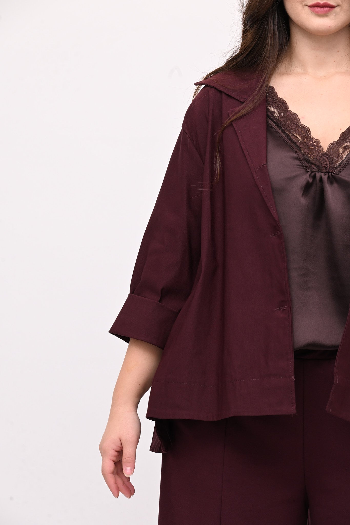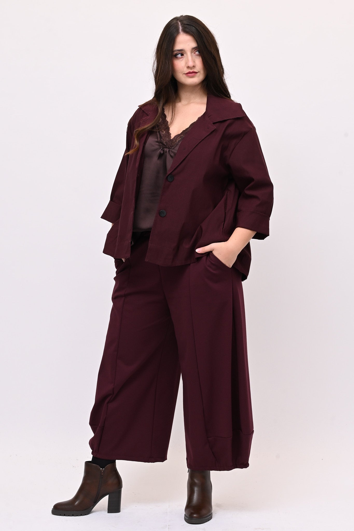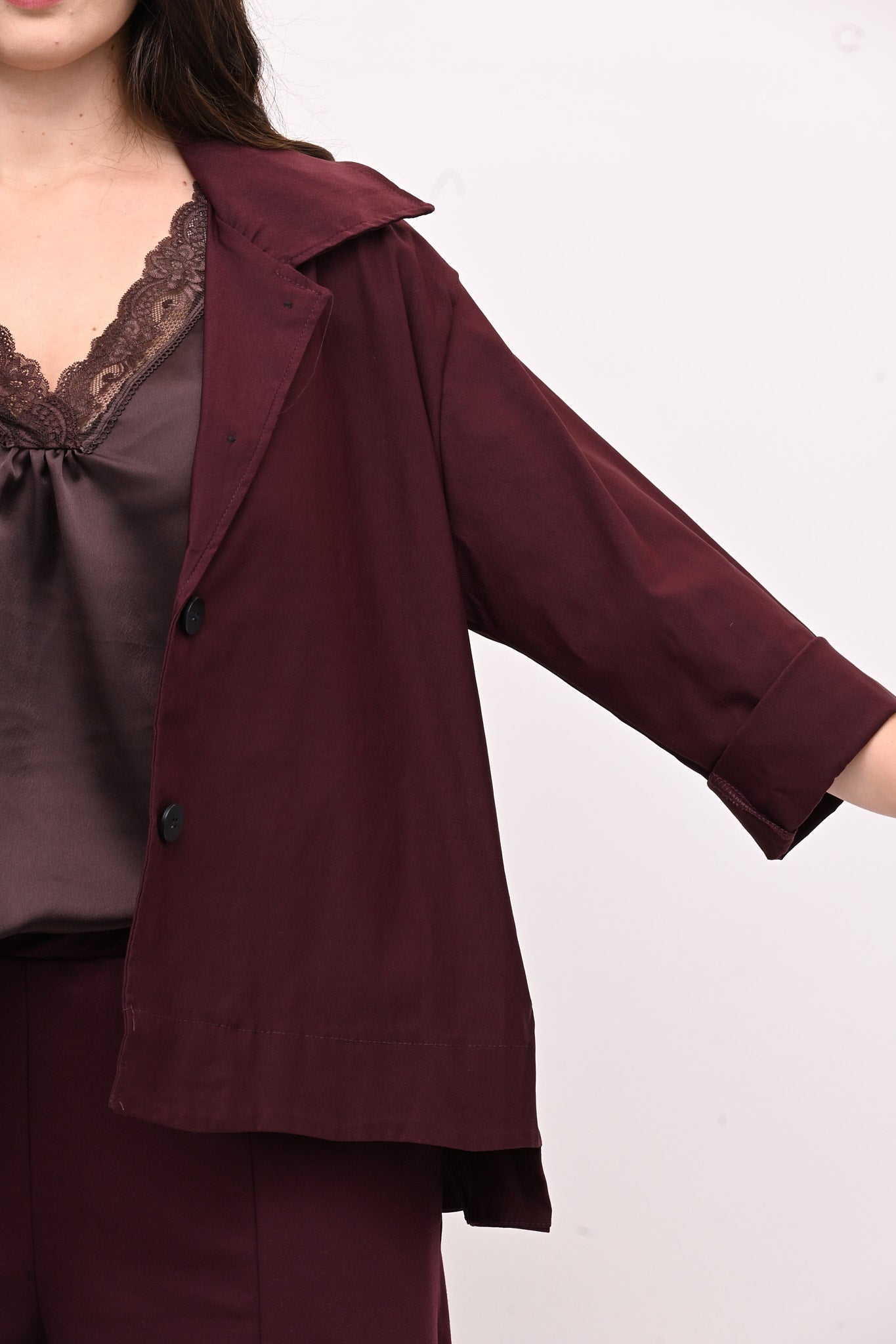 Giacca in bengalina elasticizzata, con colletto e bottoni, tasche laterali e pince sul retro. La vestibilità over e il taglio ad A la rendono versatile e confortevole, perfetta per uno stile urbano contemporaneo e femminile.