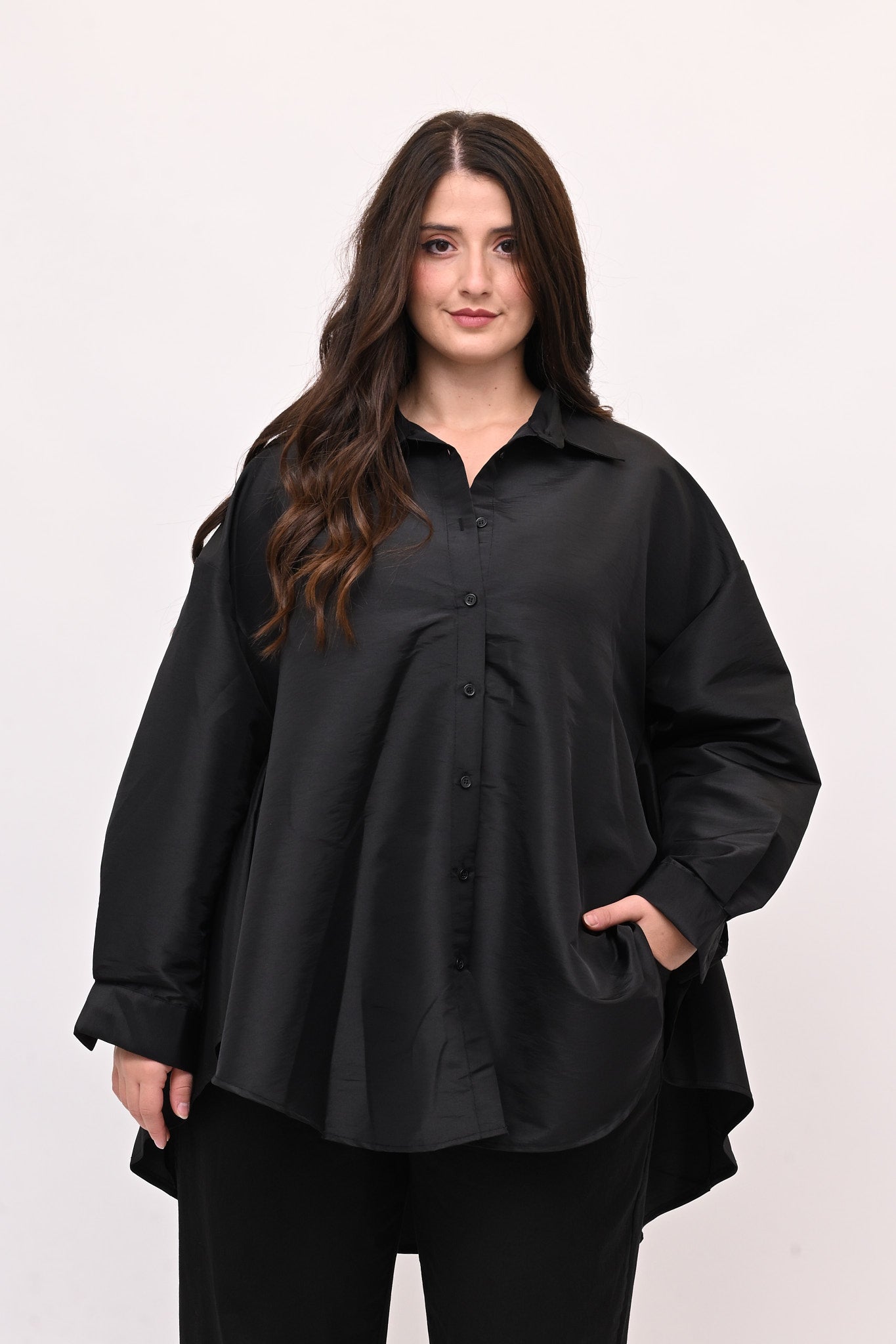 Camicia in taffetà con taglio svasato ed effetto cangiante. Ideale per chi cerca un capo sofisticato, che combina stile e unicità in un design versatile, perfetto per occasioni formali o serate speciali.