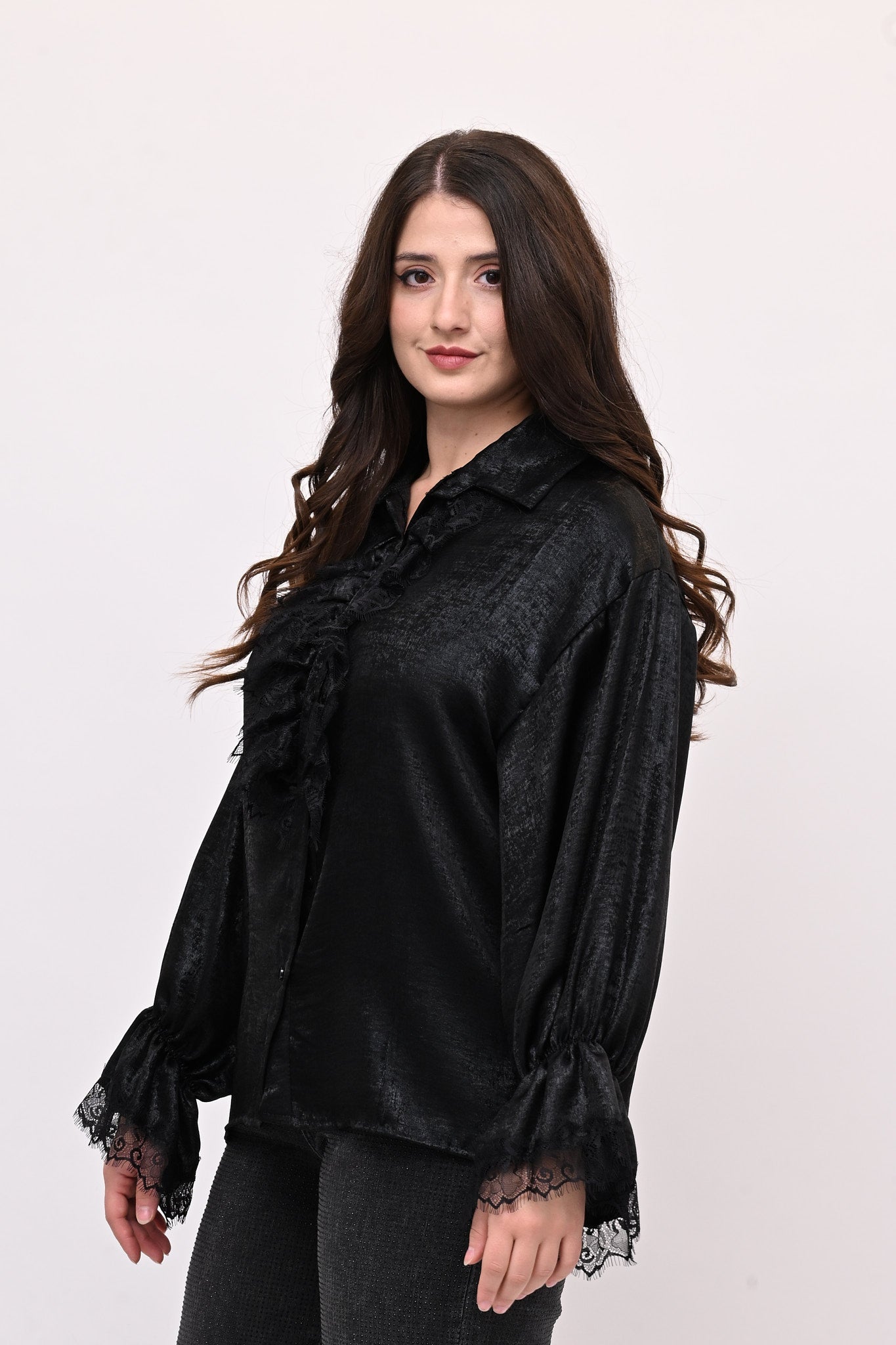 Camicia in tessuto effetto spalmato, con rouches sul collo e sui polsini. Le maniche sono lunghe con elastico finale. Perfetta per chi desidera eleganza e femminilità nei dettagli.