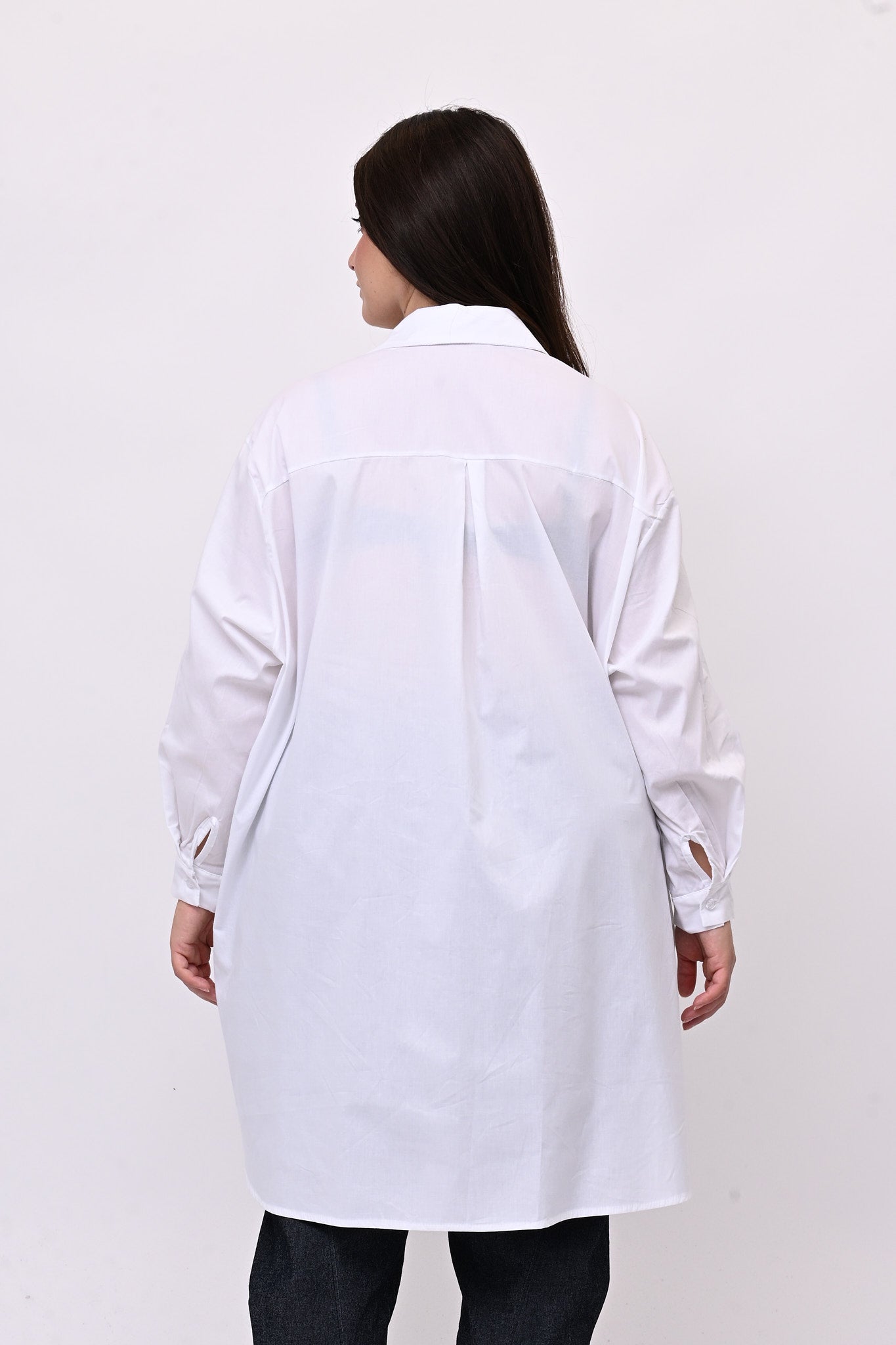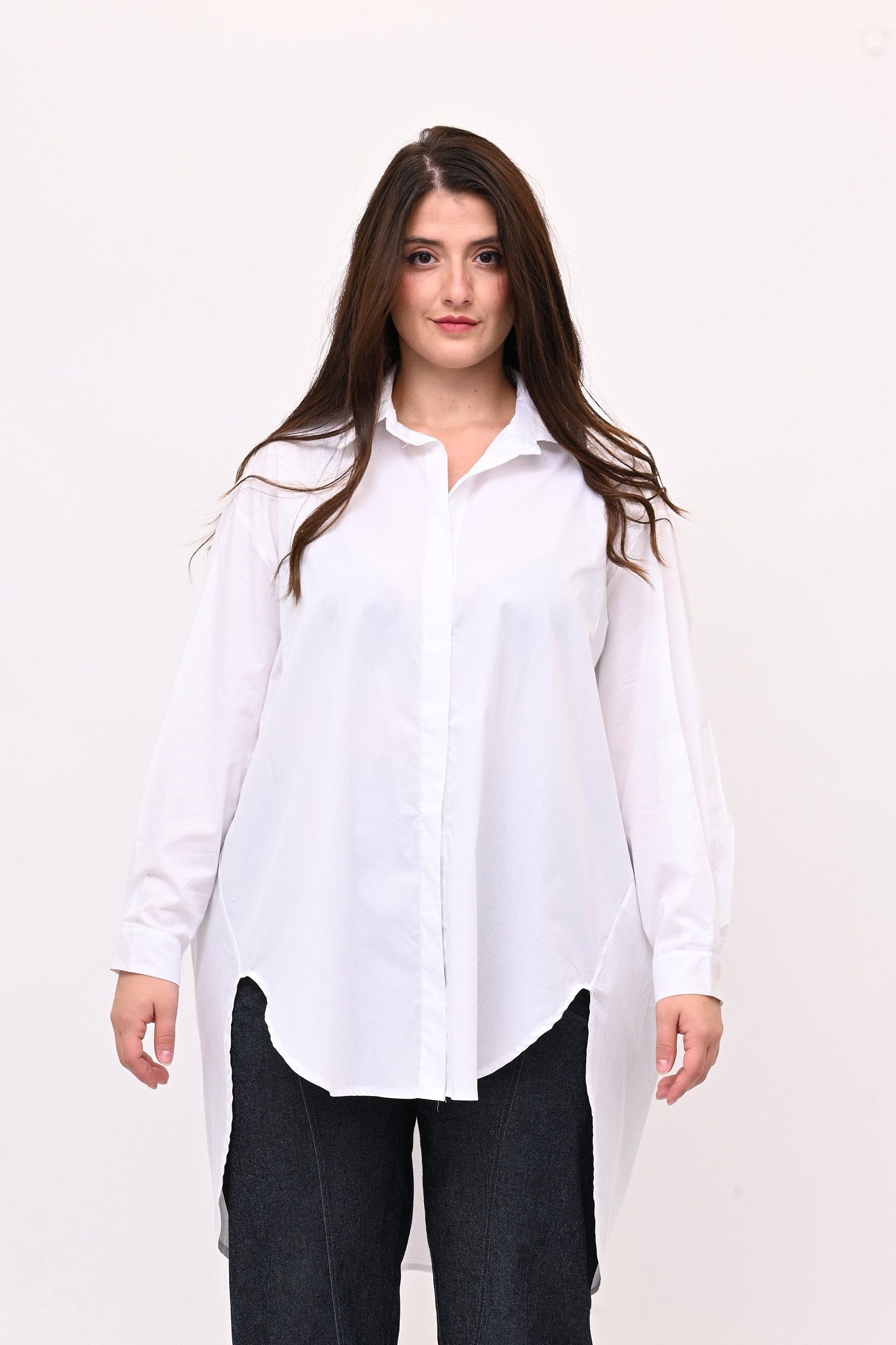 Maxi camicia in cotone, con fondo stondato e più lunga dietro. Questo capo dal taglio classico e pulito è reso speciale dalla vestibilità over. Può essere indossato per outfit giornalieri o più formali per creare look pratici, ma eleganti. Può essere portato anche come un abito, con una cinta in vita per renderlo stiloso.