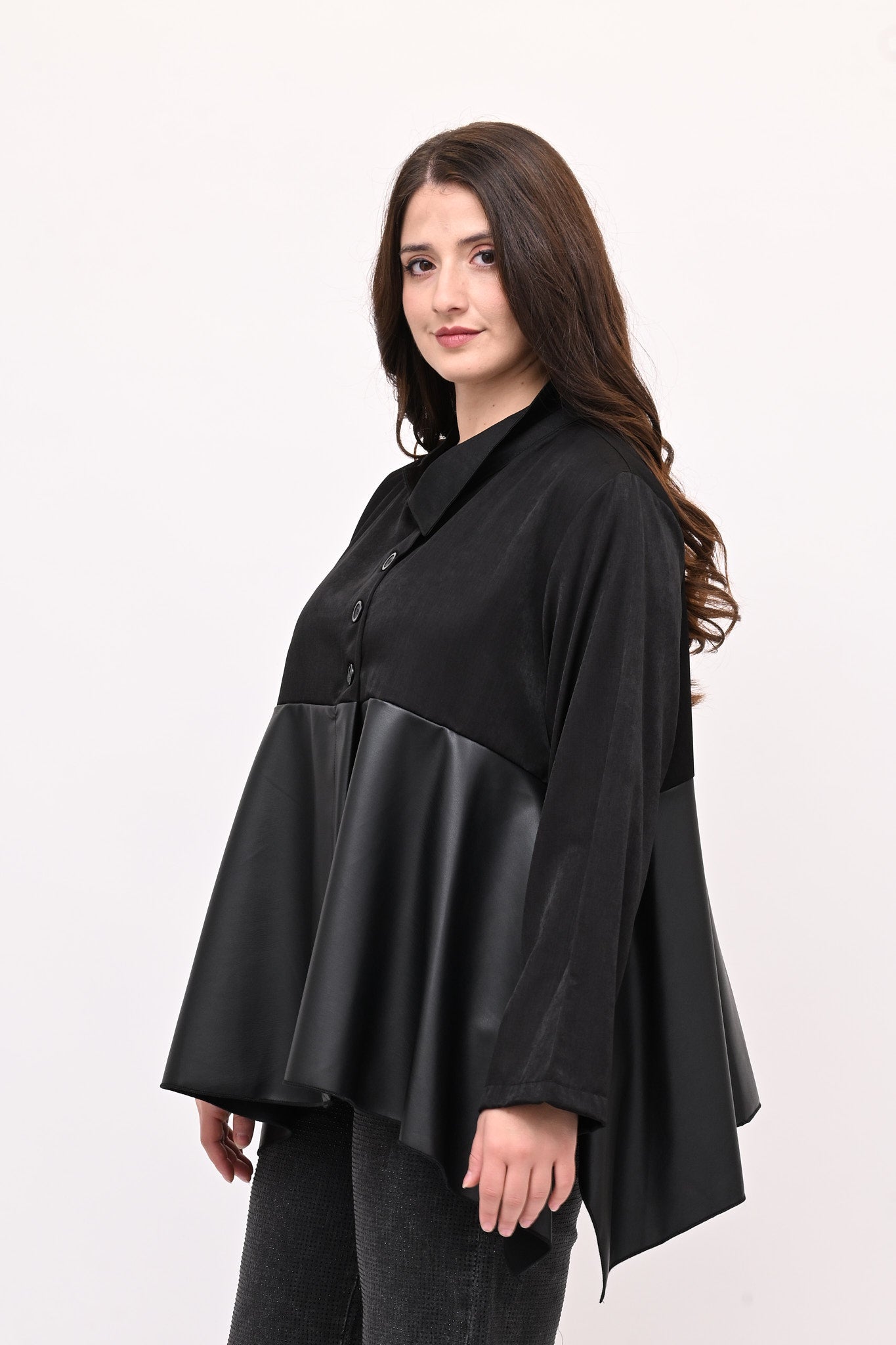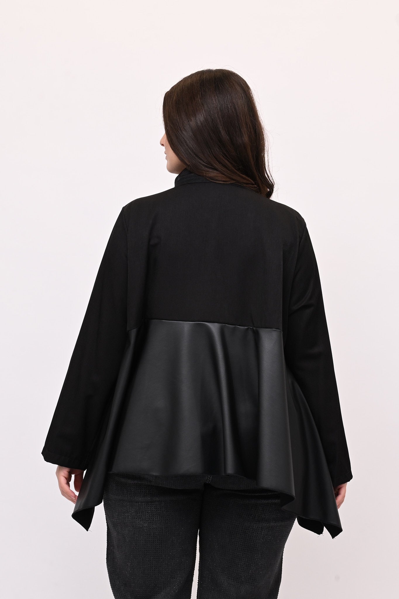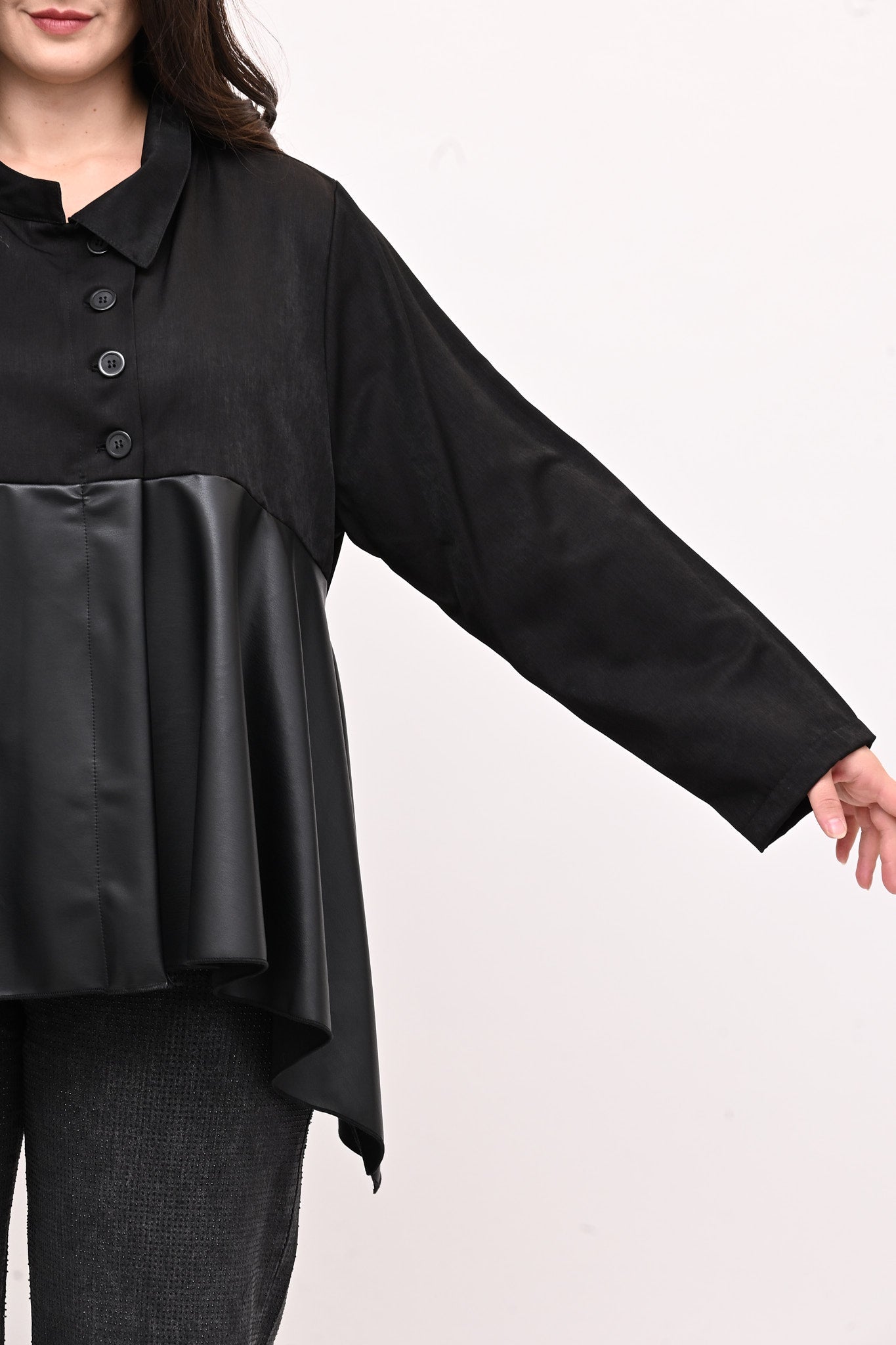 Camicia dal design contemporaneo che unisce cotone effetto jeans nella parte superiore a ecopelle nella sezione inferiore. Bottoni asimmetrici e un colletto alla coreana unito a un classico risvolto e silhouette svasata con spacchi laterali e punte, creano un capo ricercato e originale. Ideale per chi desidera un pezzo unico e speciale.