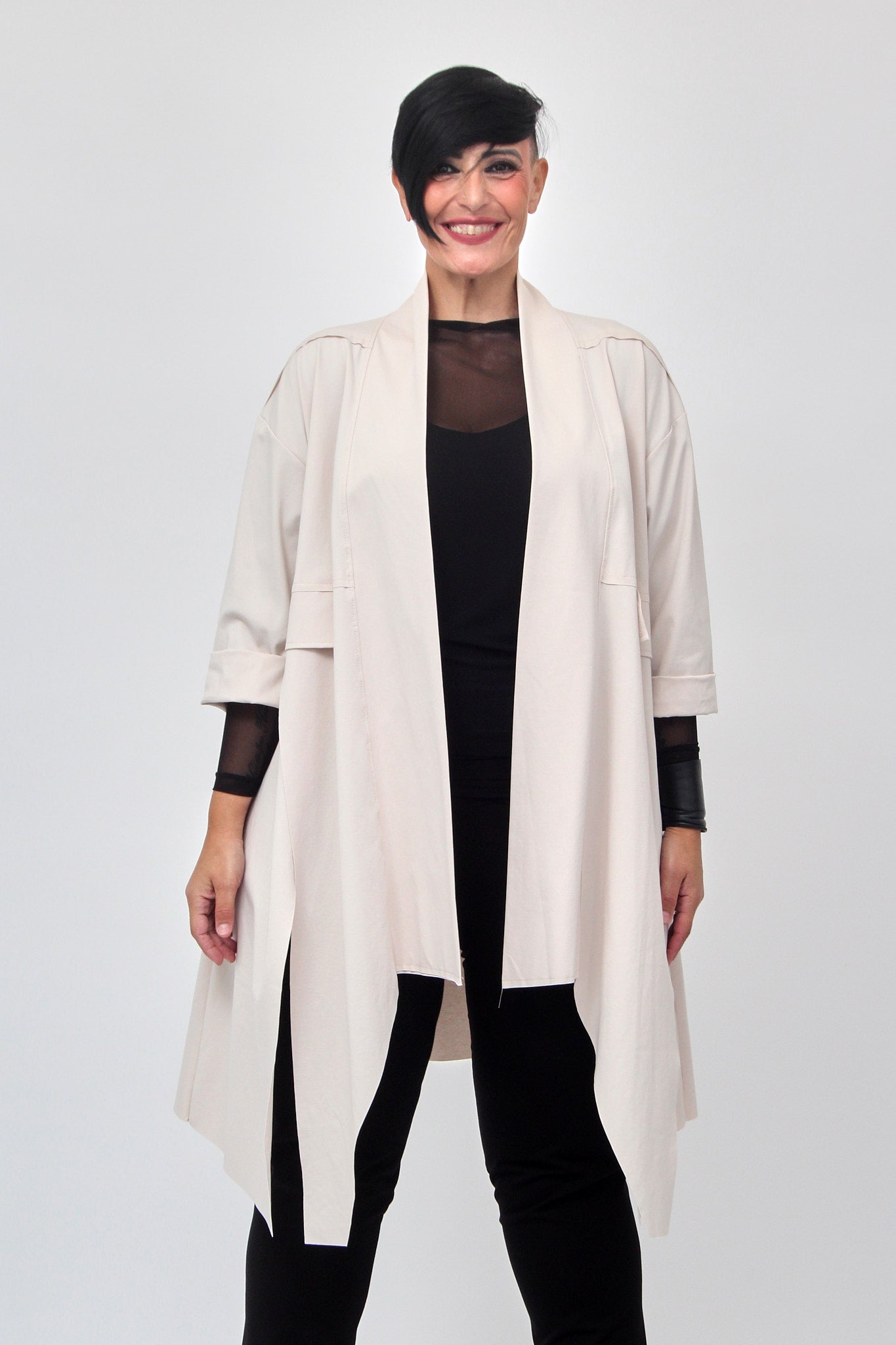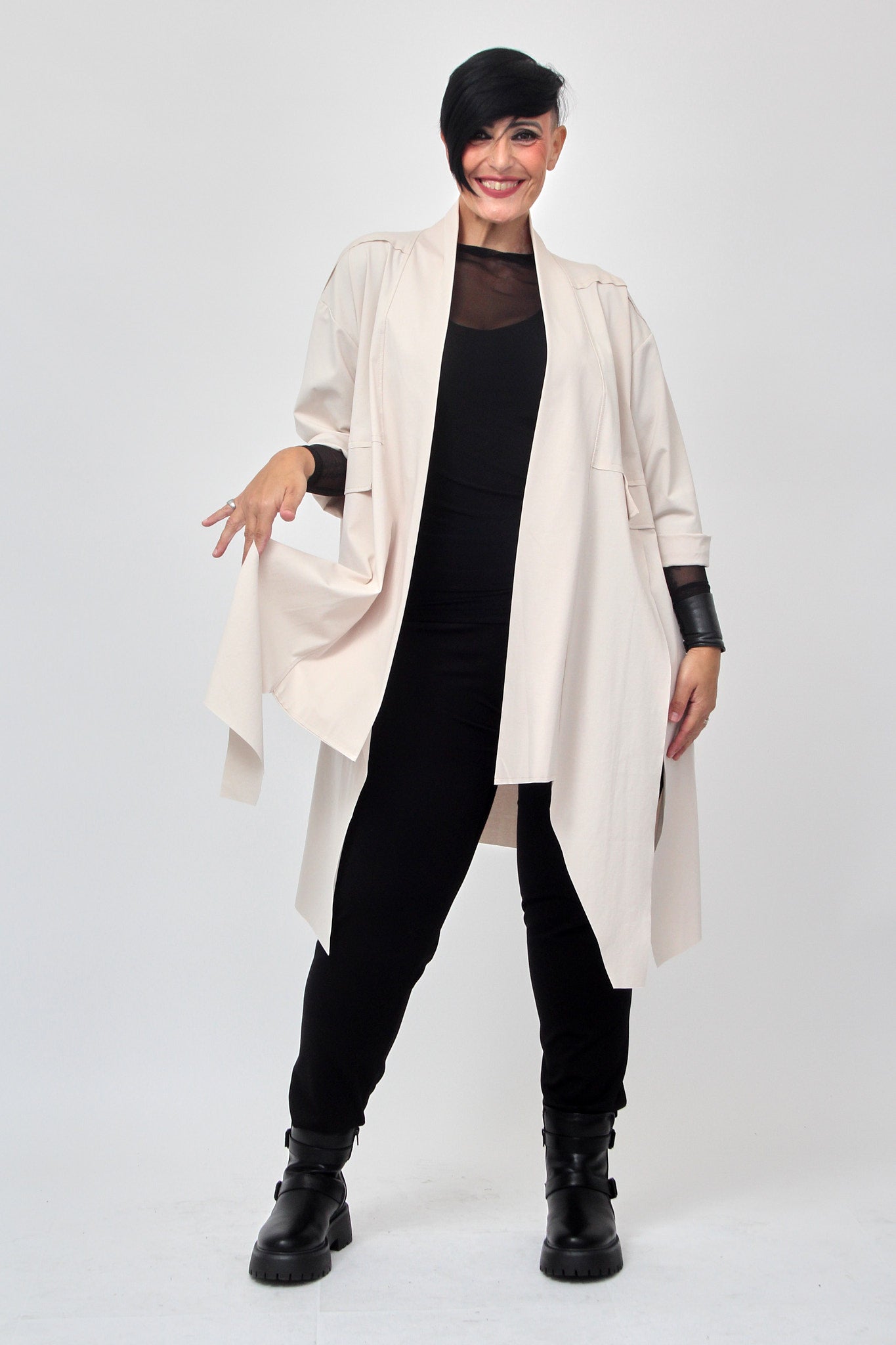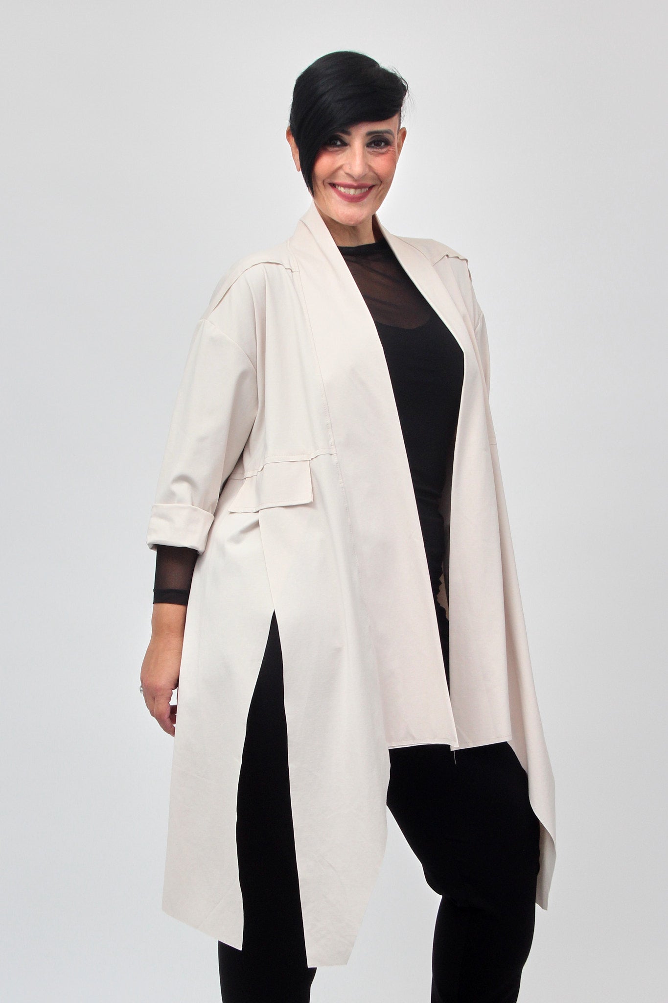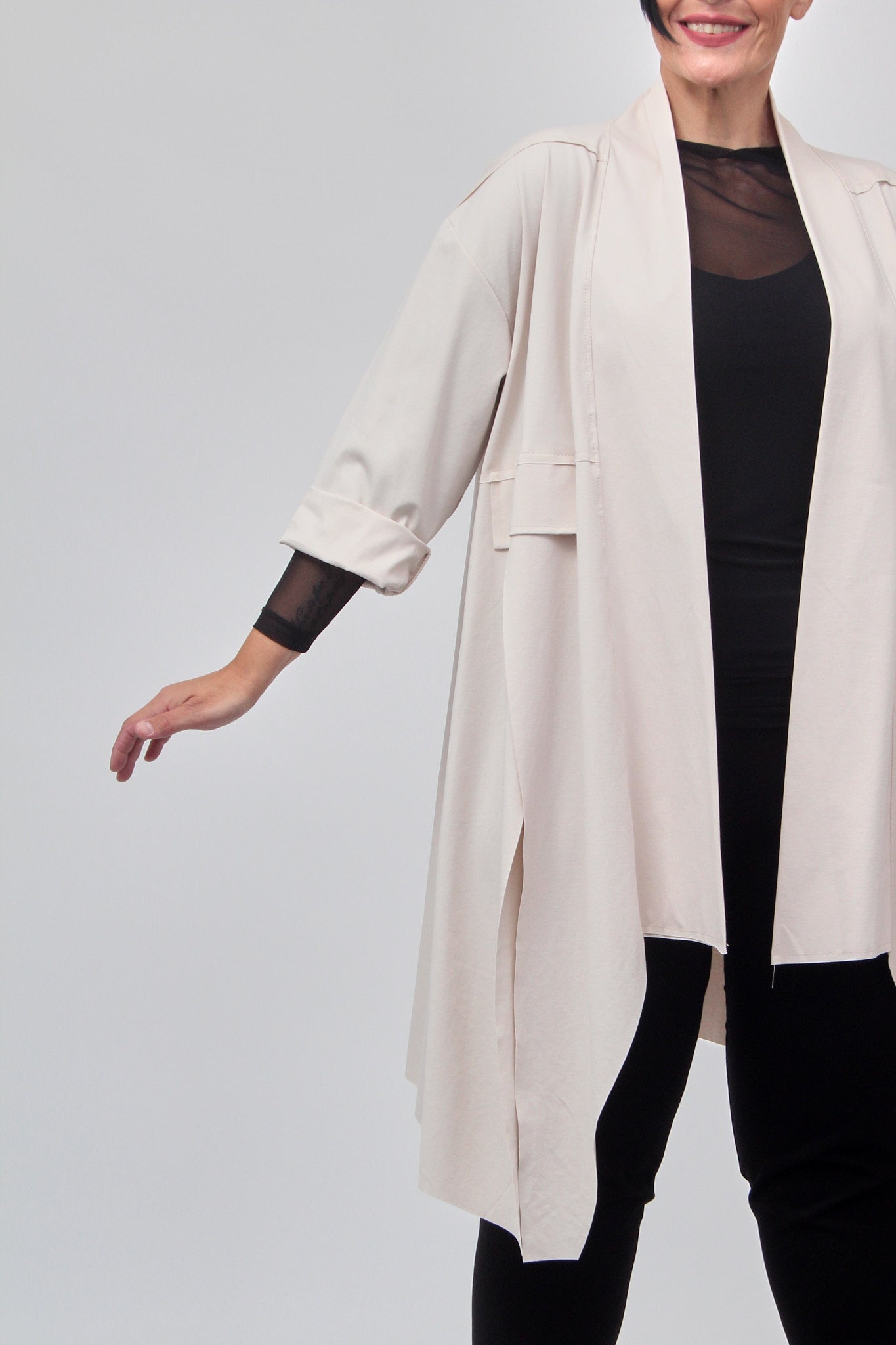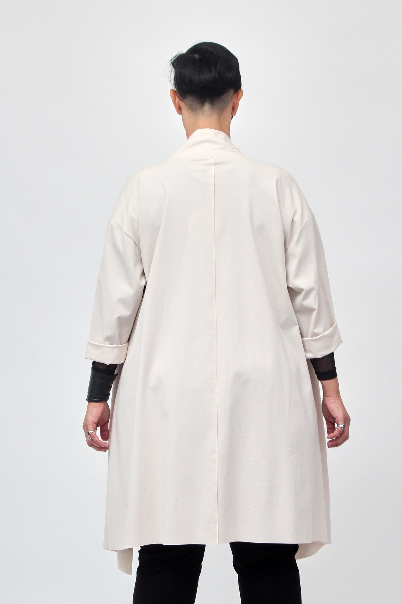 Questo spolverino presenta una silhouette over con cuciture esterne che ne definiscono la struttura. Il taglio asimmetrico e gli spacchi laterali assicurano una maggiore libertà di movimento e una vestibilità confortevole. Il bordo lungo il collo aggiunge un dettaglio distintivo, rendendo questo capo ideale per un look contemporaneo e versatile.