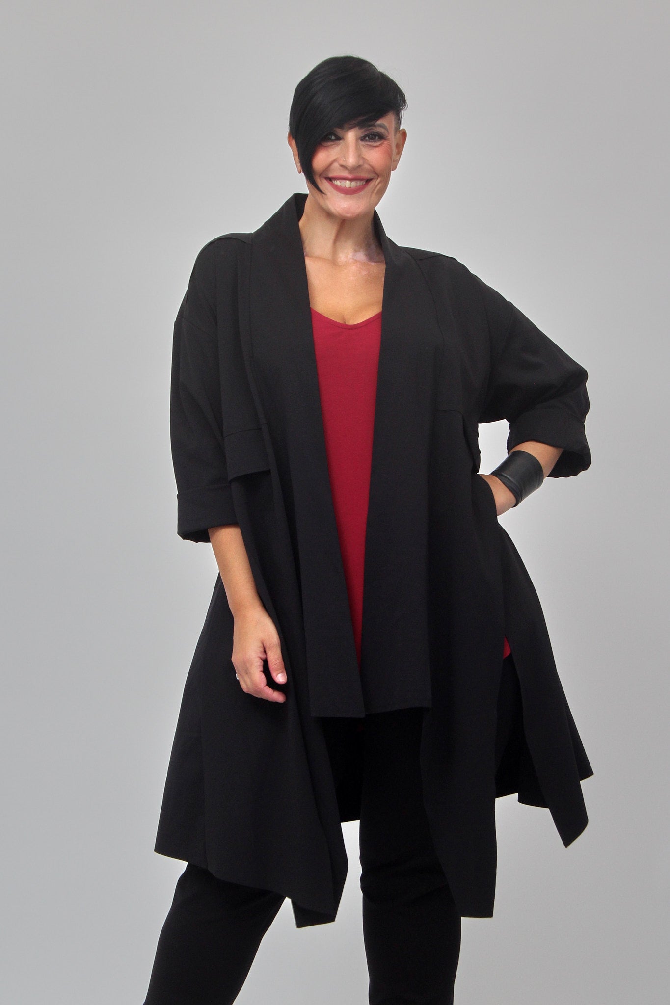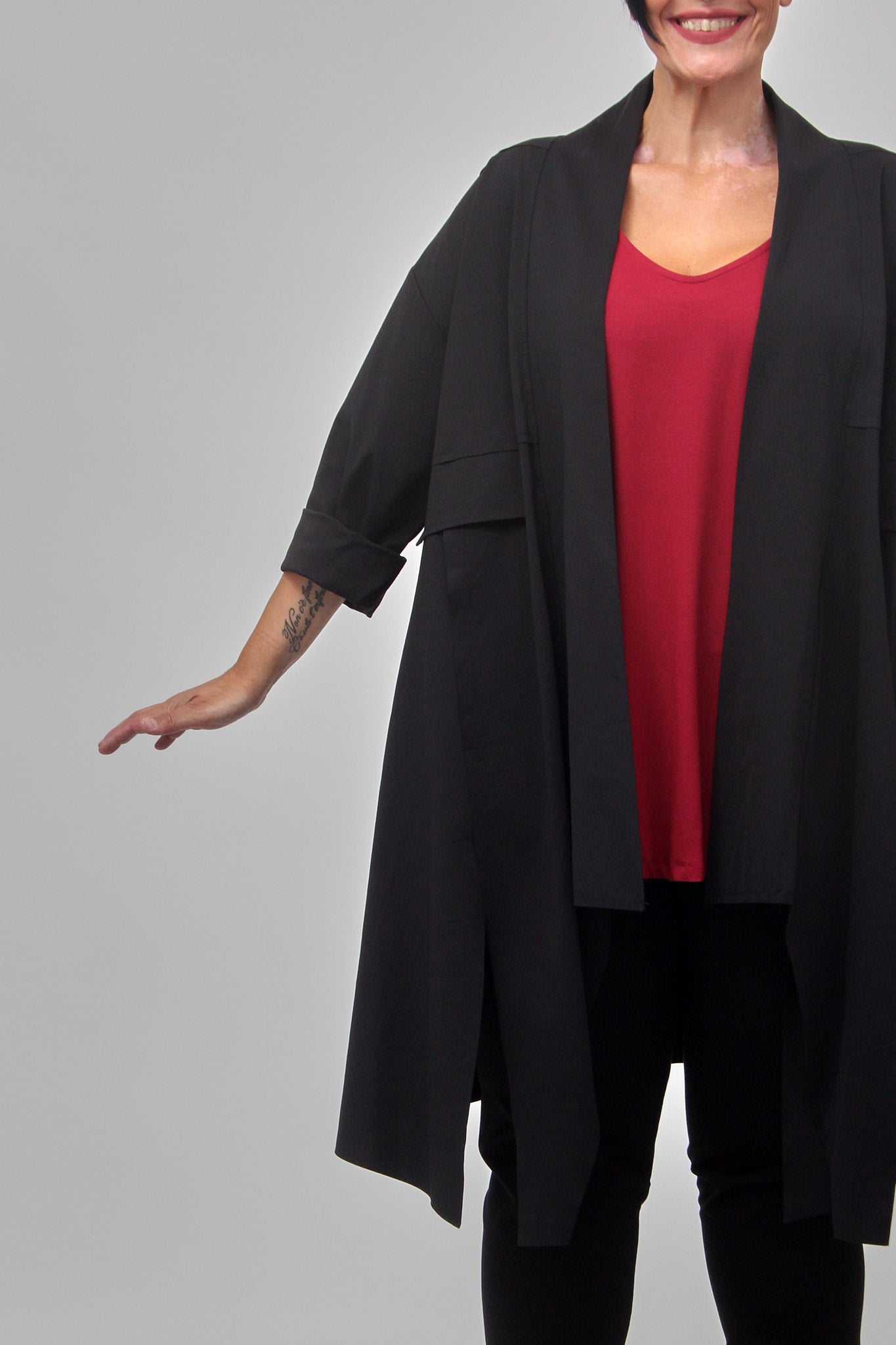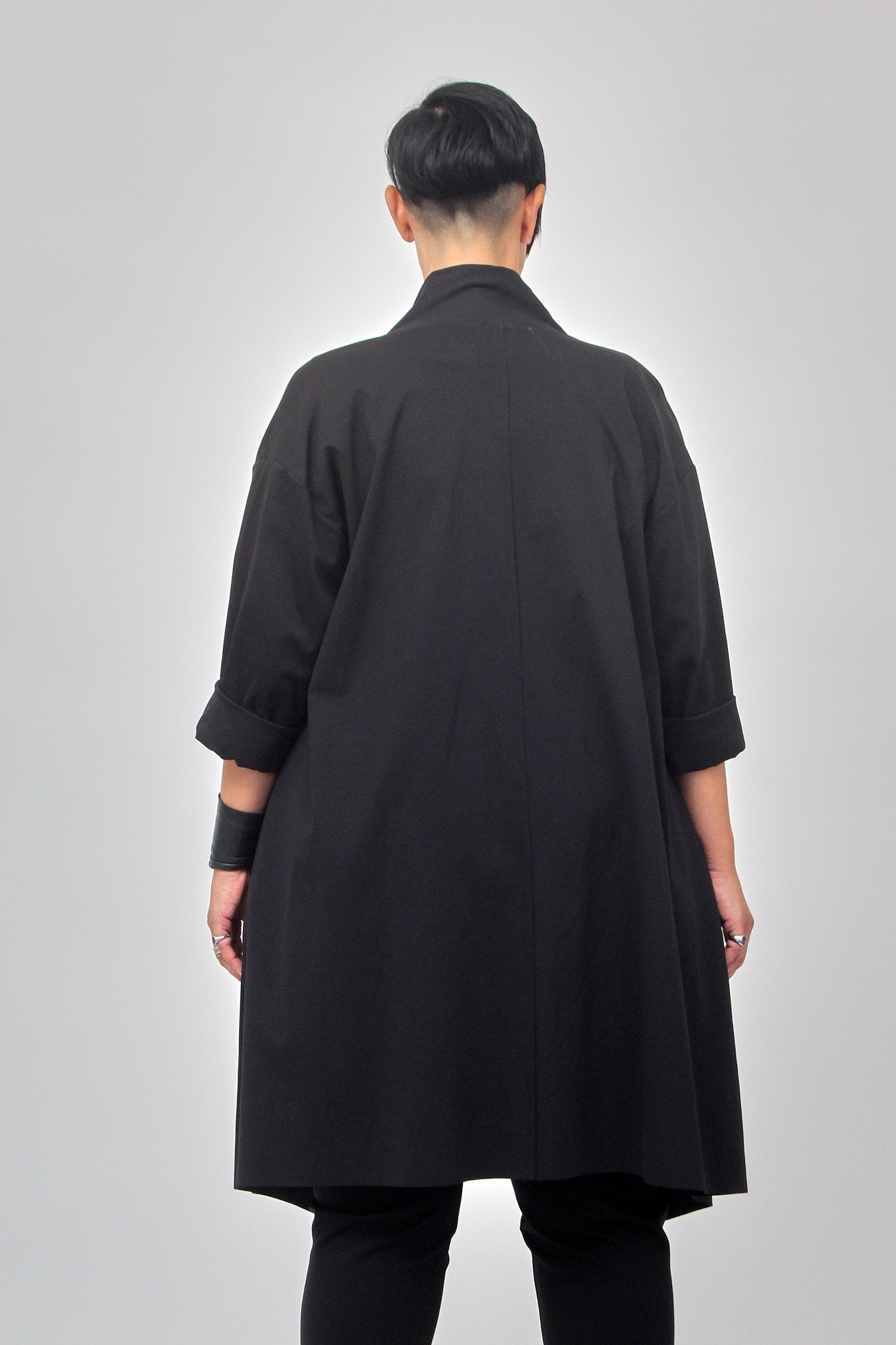 Questo spolverino presenta una silhouette over con cuciture esterne che ne definiscono la struttura. Il taglio asimmetrico e gli spacchi laterali assicurano una maggiore libertà di movimento e una vestibilità confortevole. Il bordo lungo il collo aggiunge un dettaglio distintivo, rendendo questo capo ideale per un look contemporaneo e versatile.