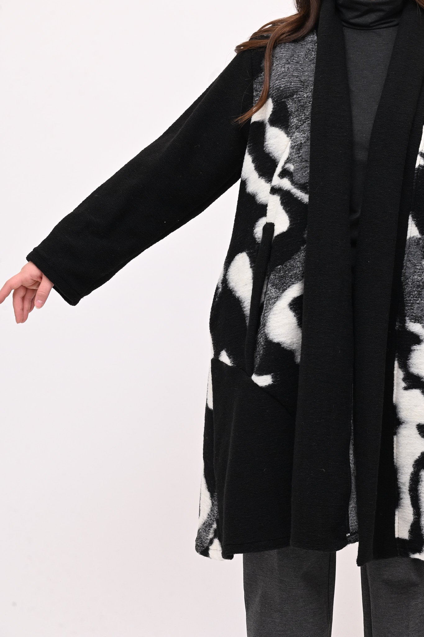 Cappotto in lana cotta, silhouette a ovetto, rever risvoltato e tasche laterali. La base nera con inserti fantasia crea un contrasto raffinato. Dal design moderno e versatile è ideale per chi ricerca calore, stile ed eleganza.