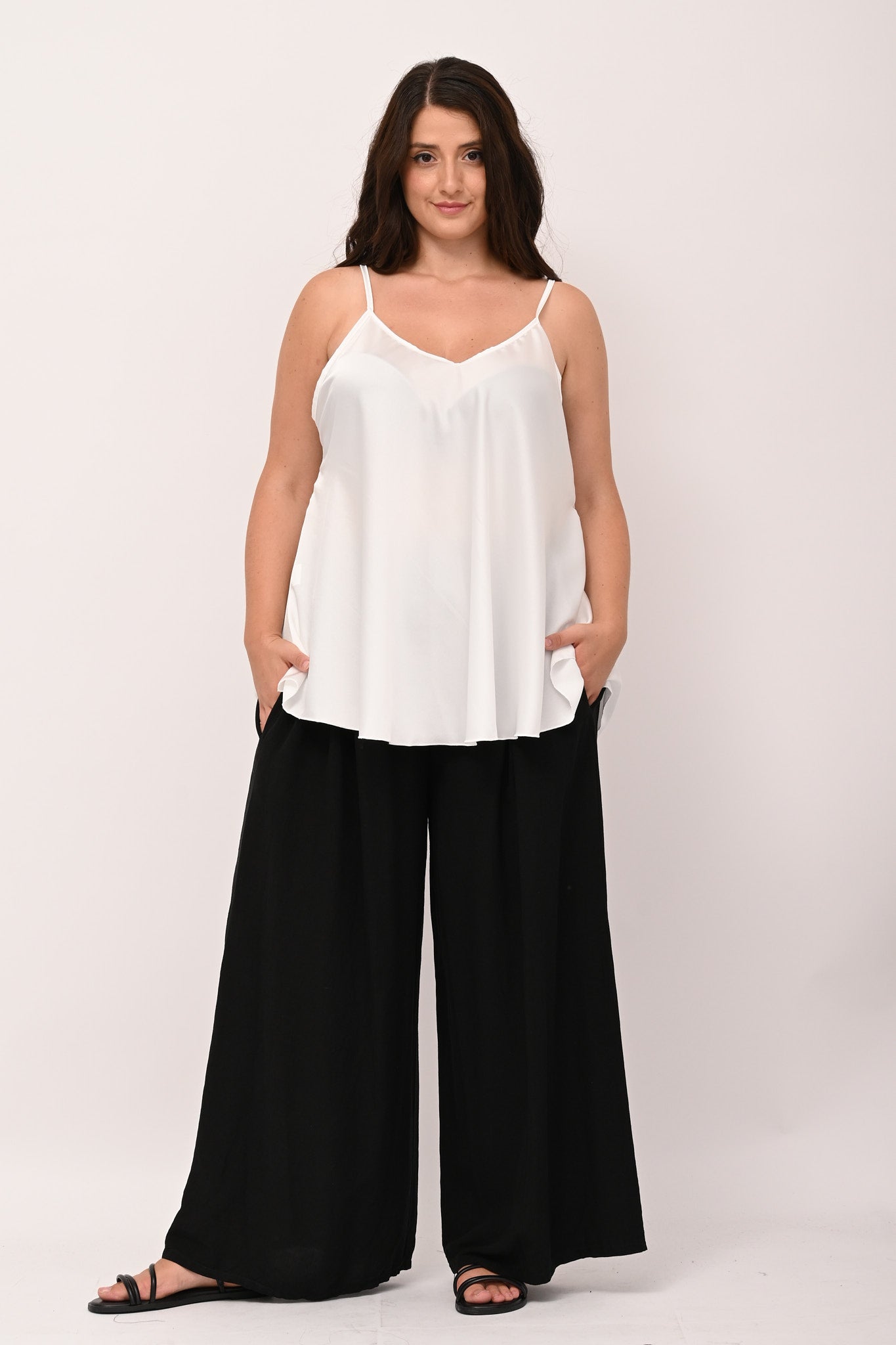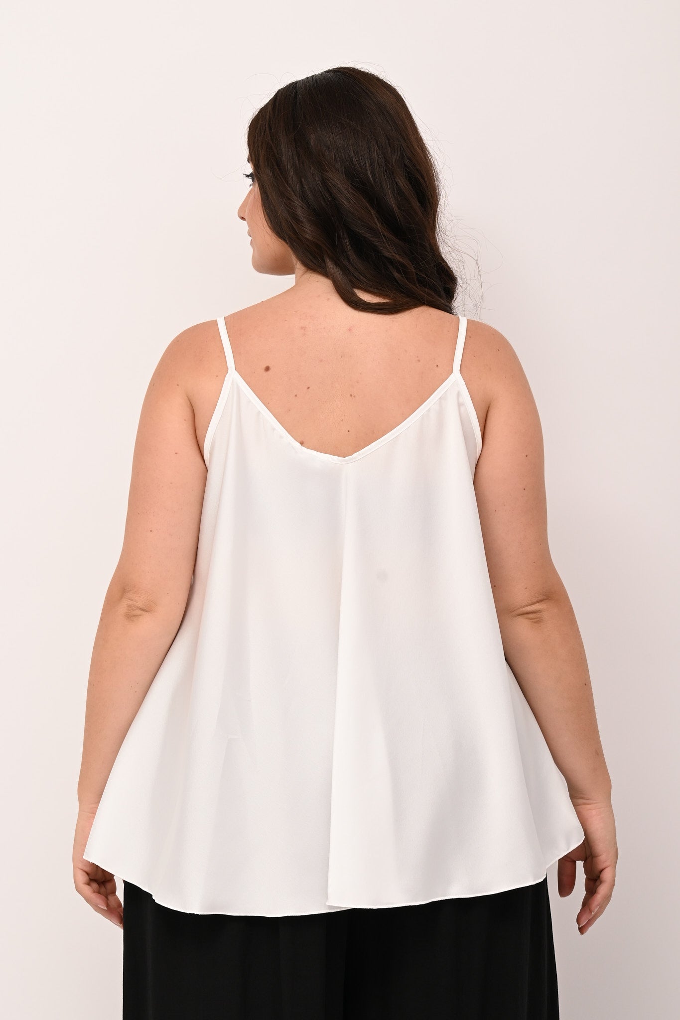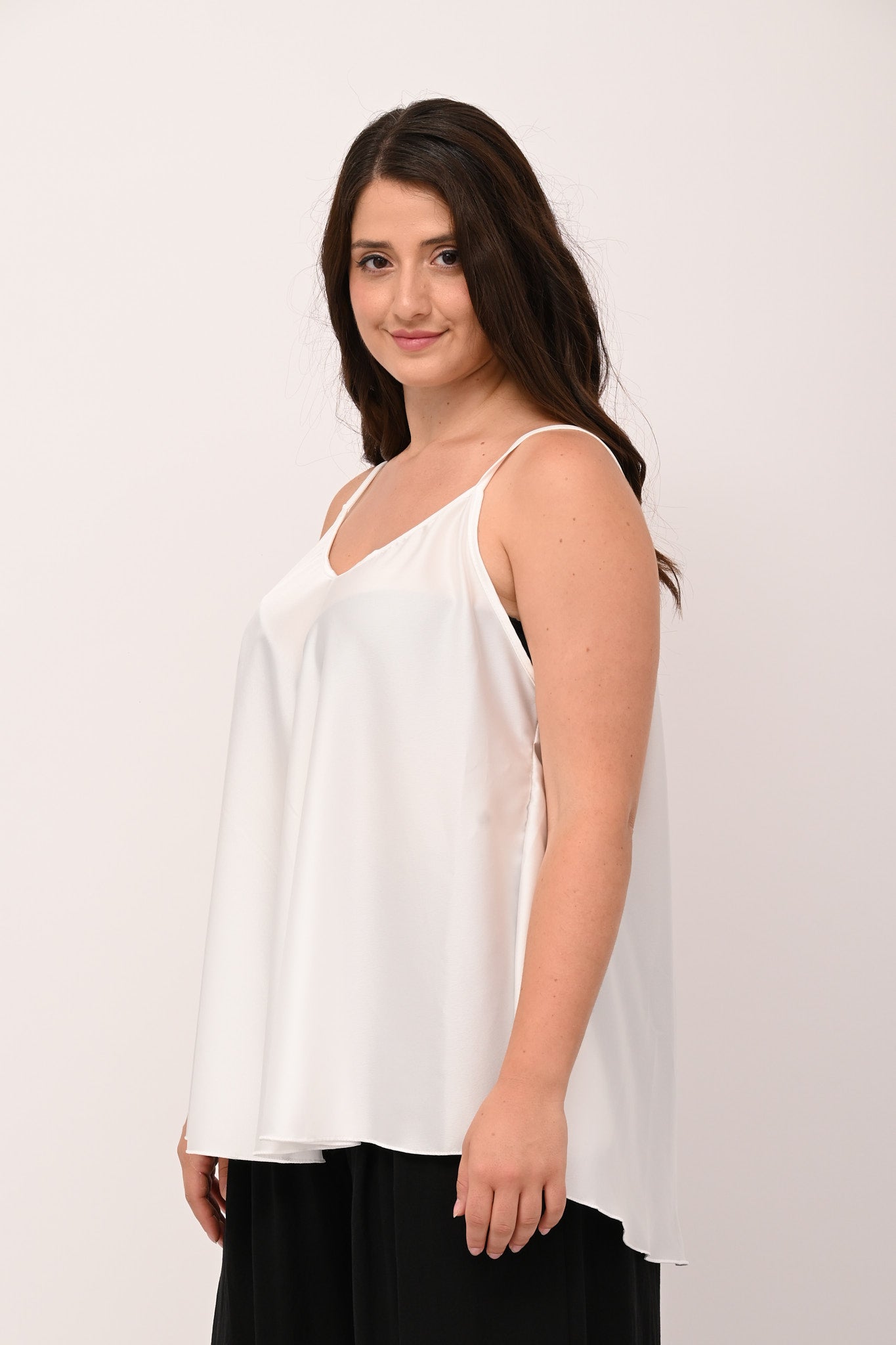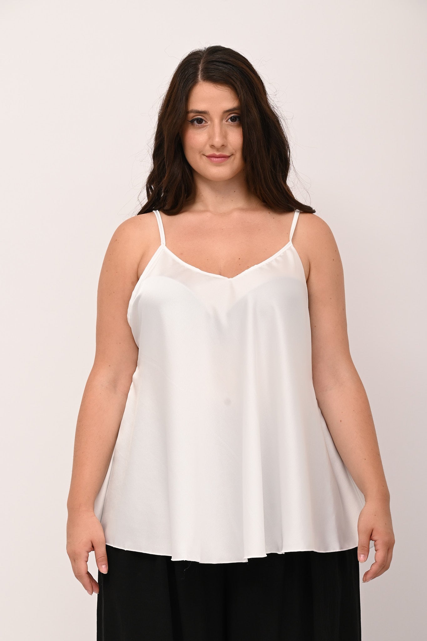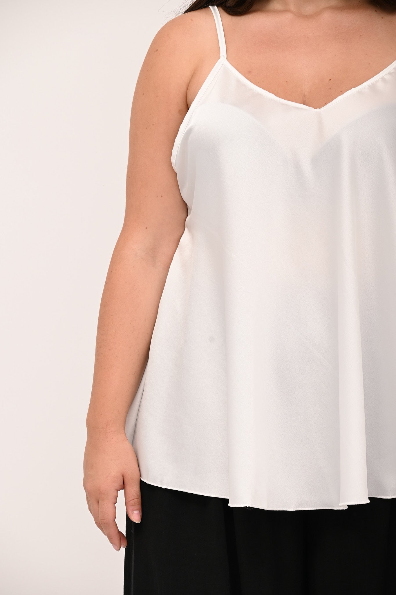 Top in raso, con bretelle sottili, scollatura a V, modello a ruota. Un top femminile, dalla vestibilità fluida, che può essere indossato per look quotidiani di tendenza, ma anche per eventi più eleganti. Un must have cool e senza tempo.