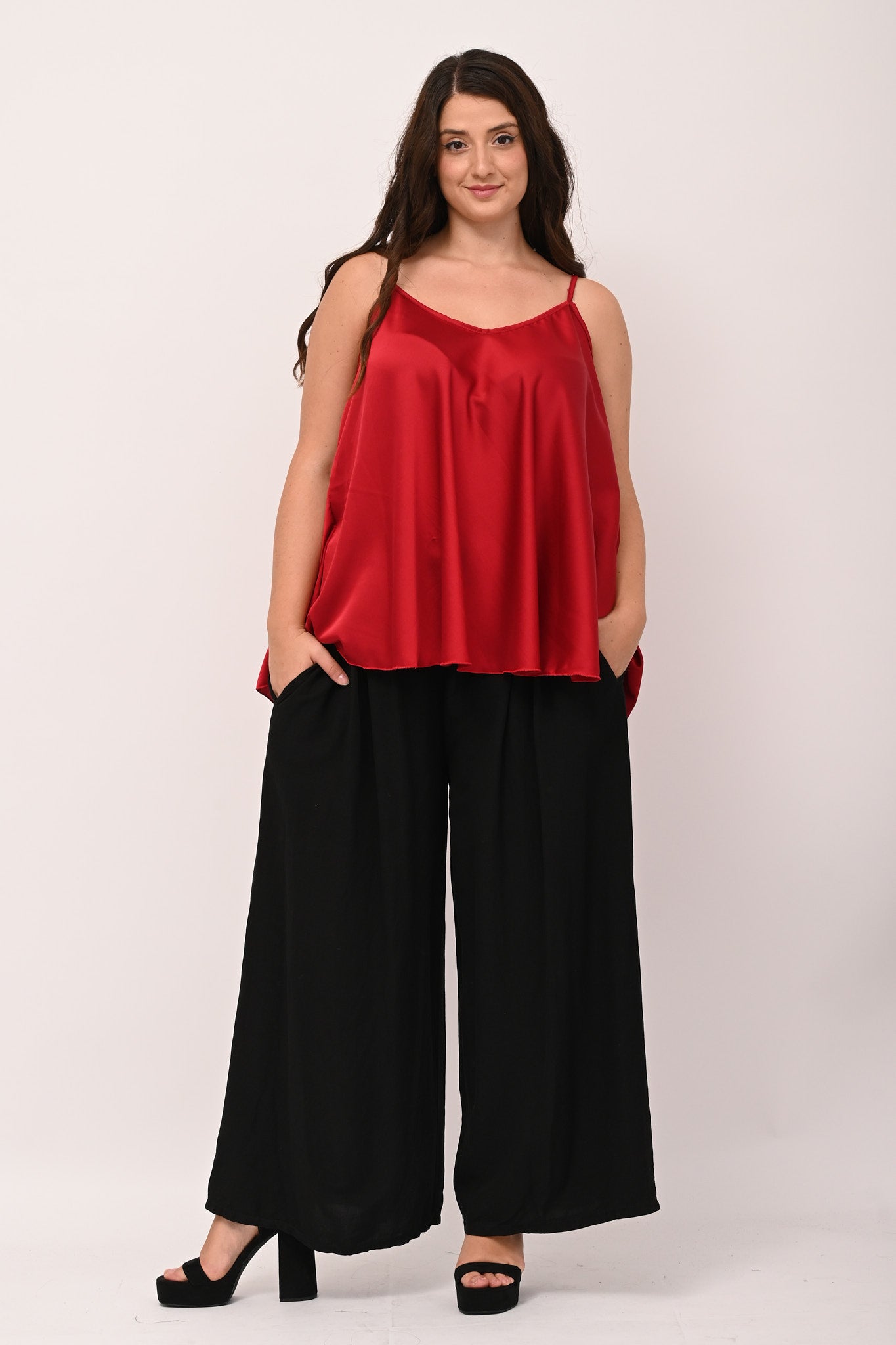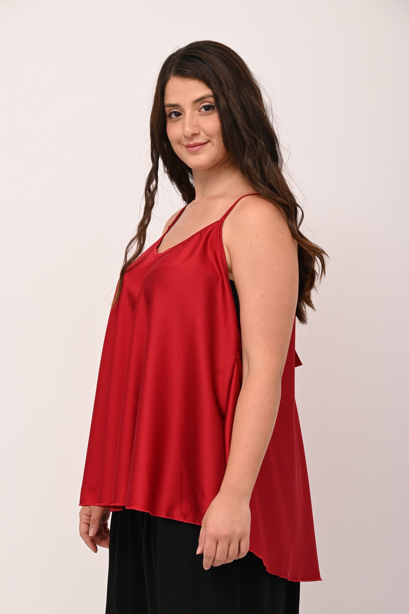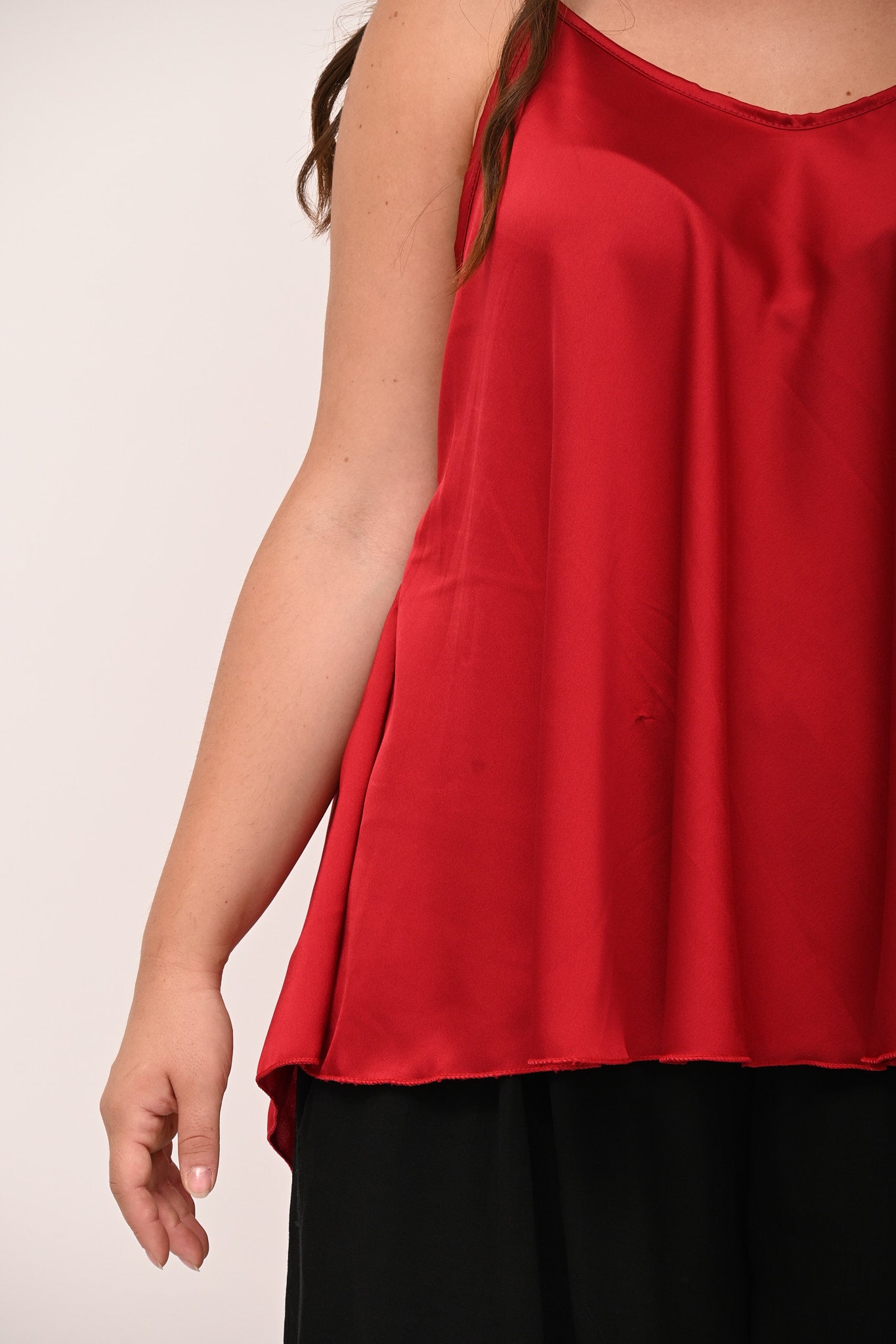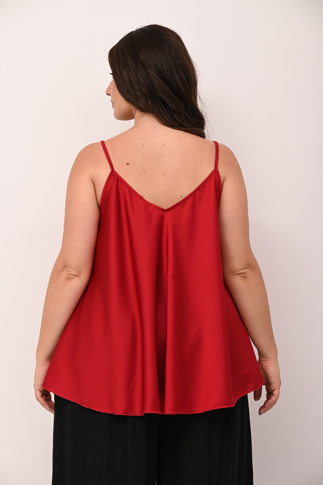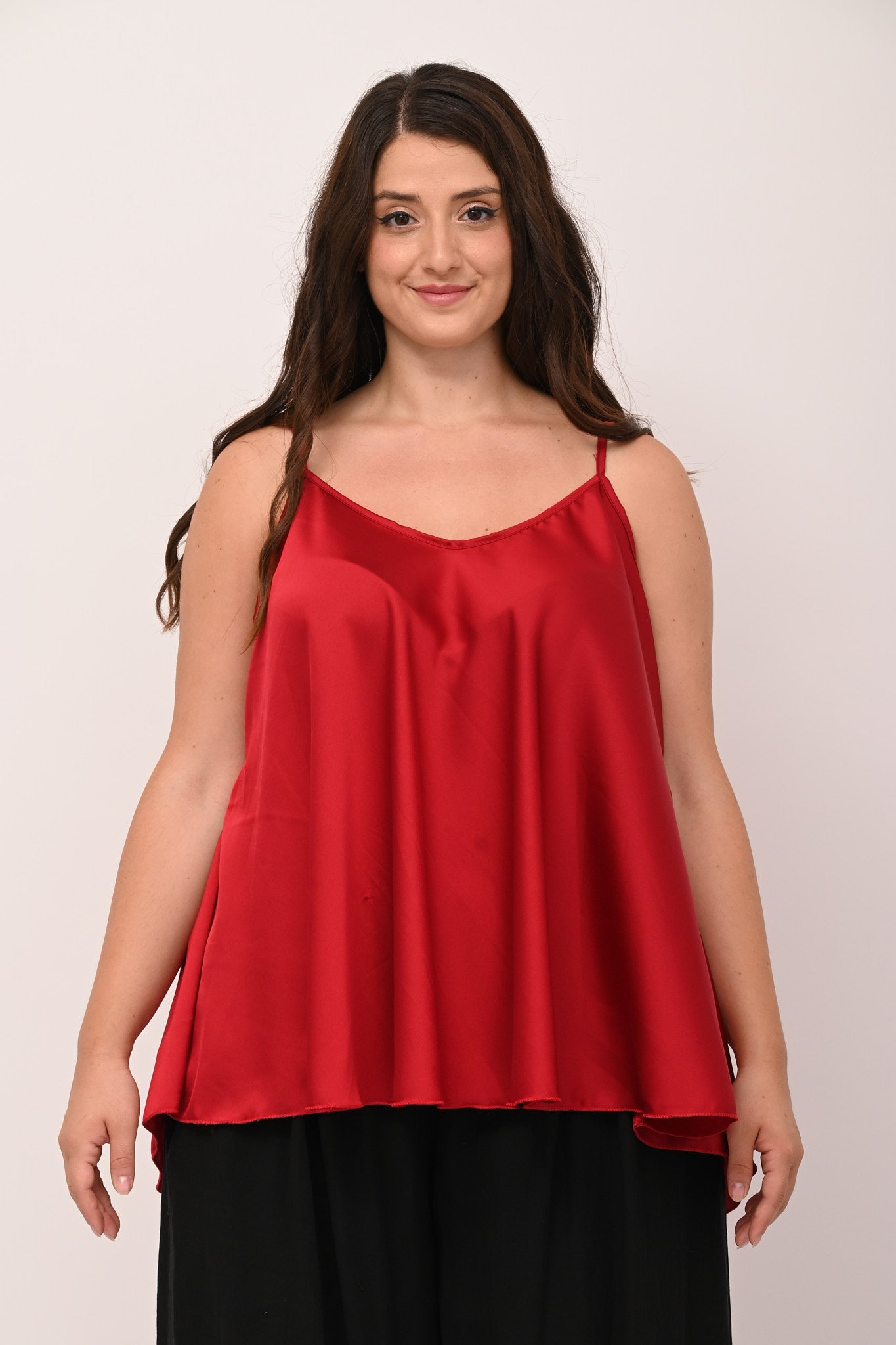 Top in raso, con bretelle sottili, scollatura a V, modello a ruota. Un top femminile, dalla vestibilità fluida, che può essere indossato per look quotidiani di tendenza, ma anche per eventi più eleganti. Un must have cool e senza tempo.