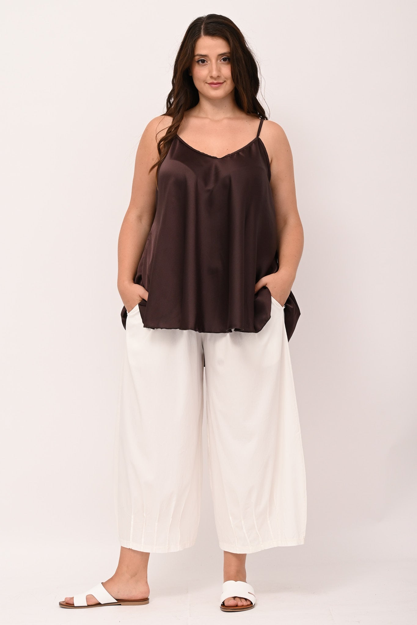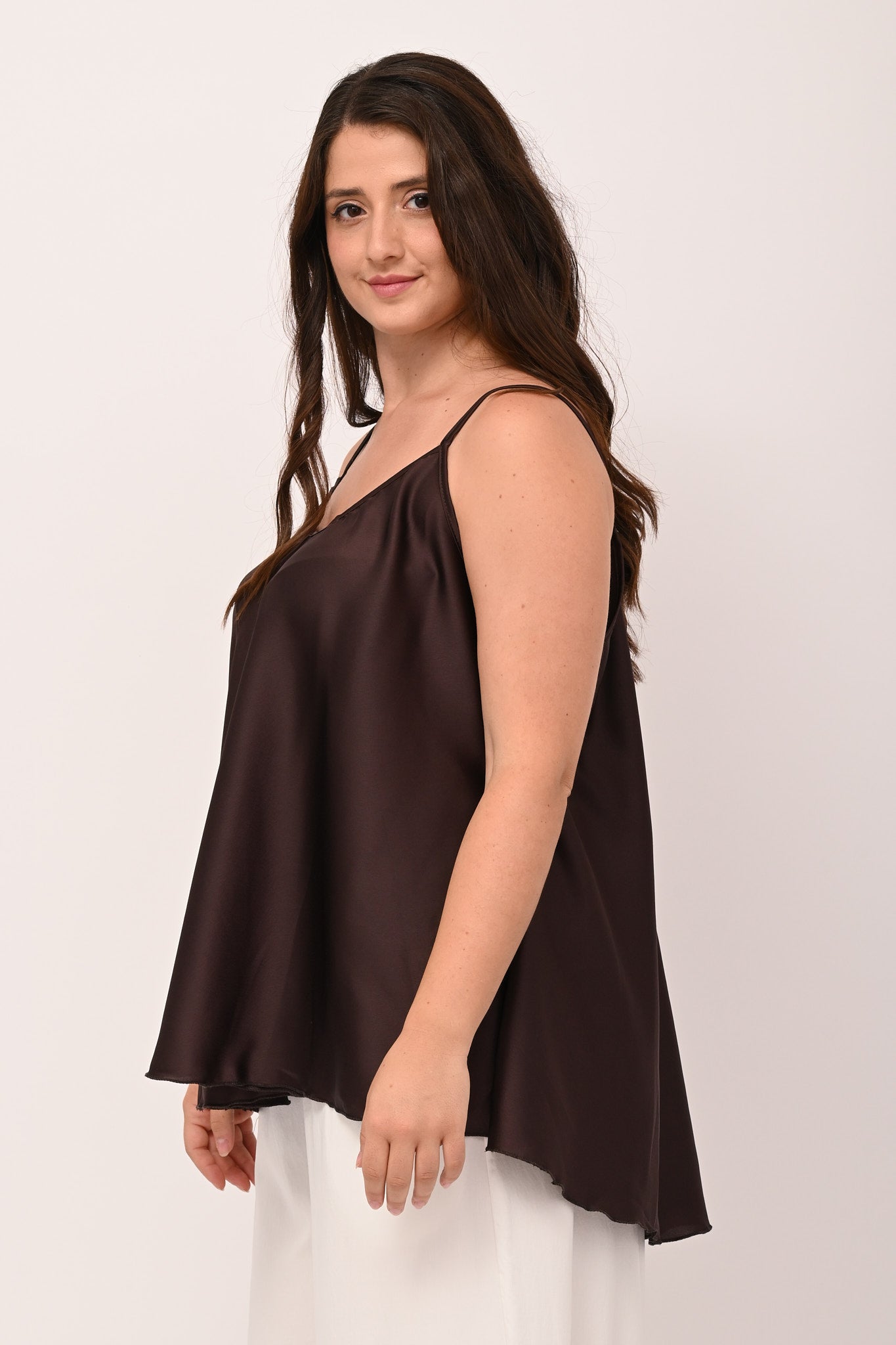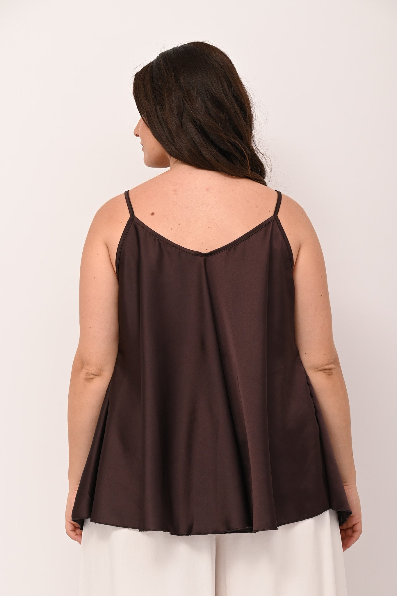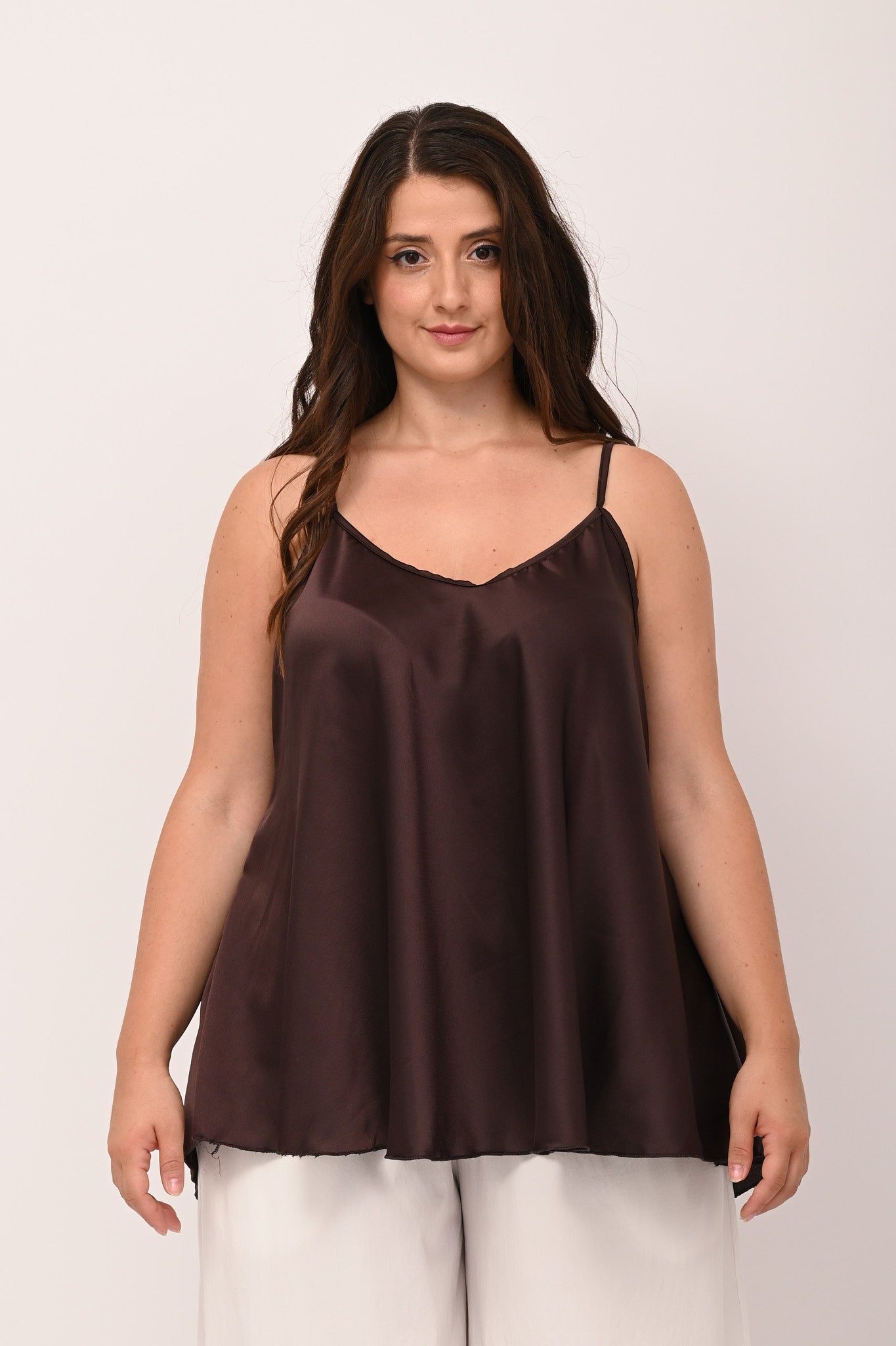 Top in raso, con bretelle sottili, scollatura a V, modello a ruota. Un top femminile, dalla vestibilità fluida, che può essere indossato per look quotidiani di tendenza, ma anche per eventi più eleganti. Un must have cool e senza tempo.
