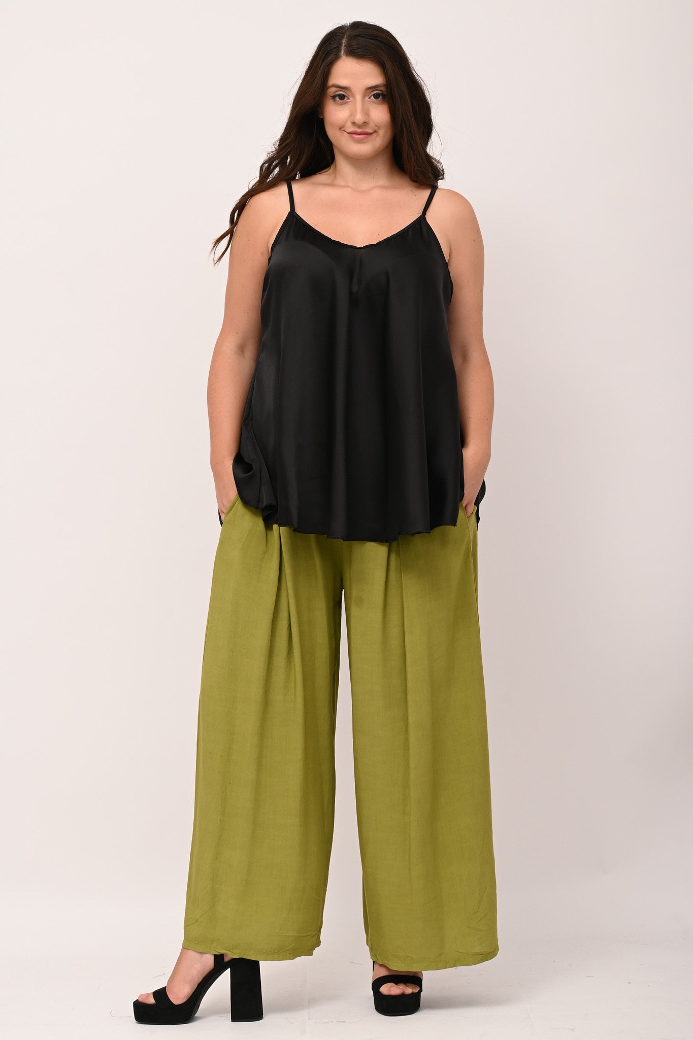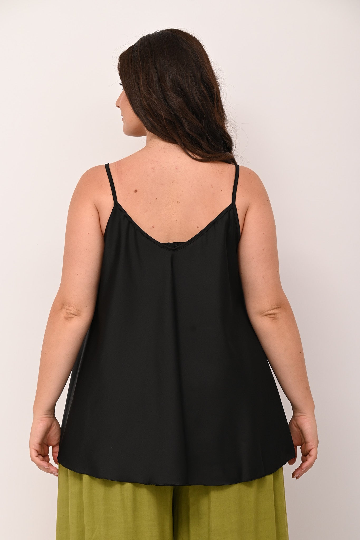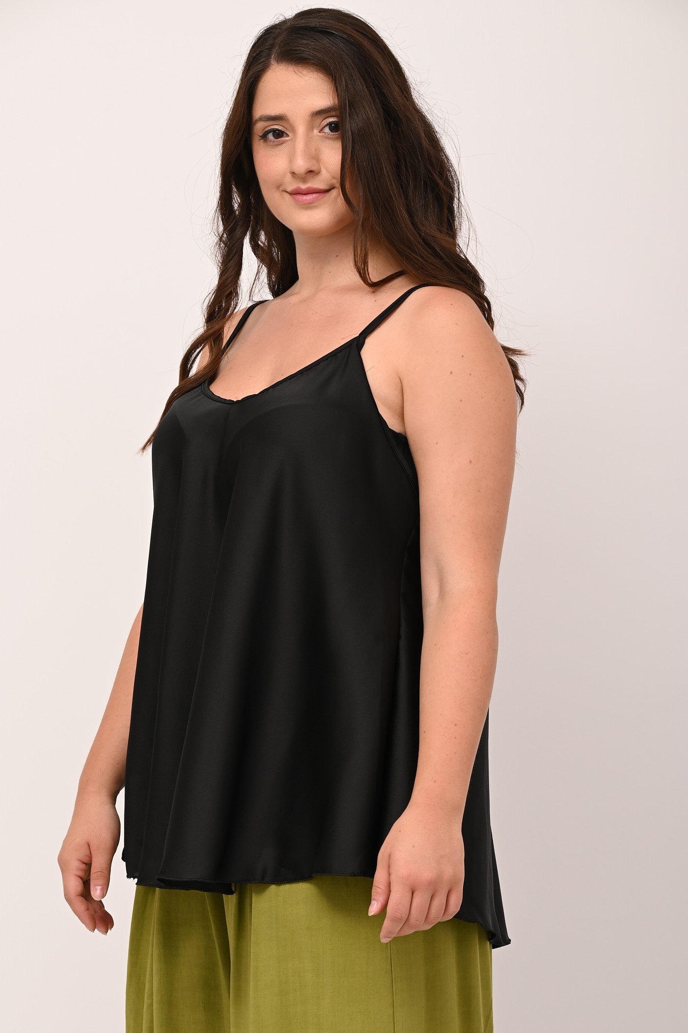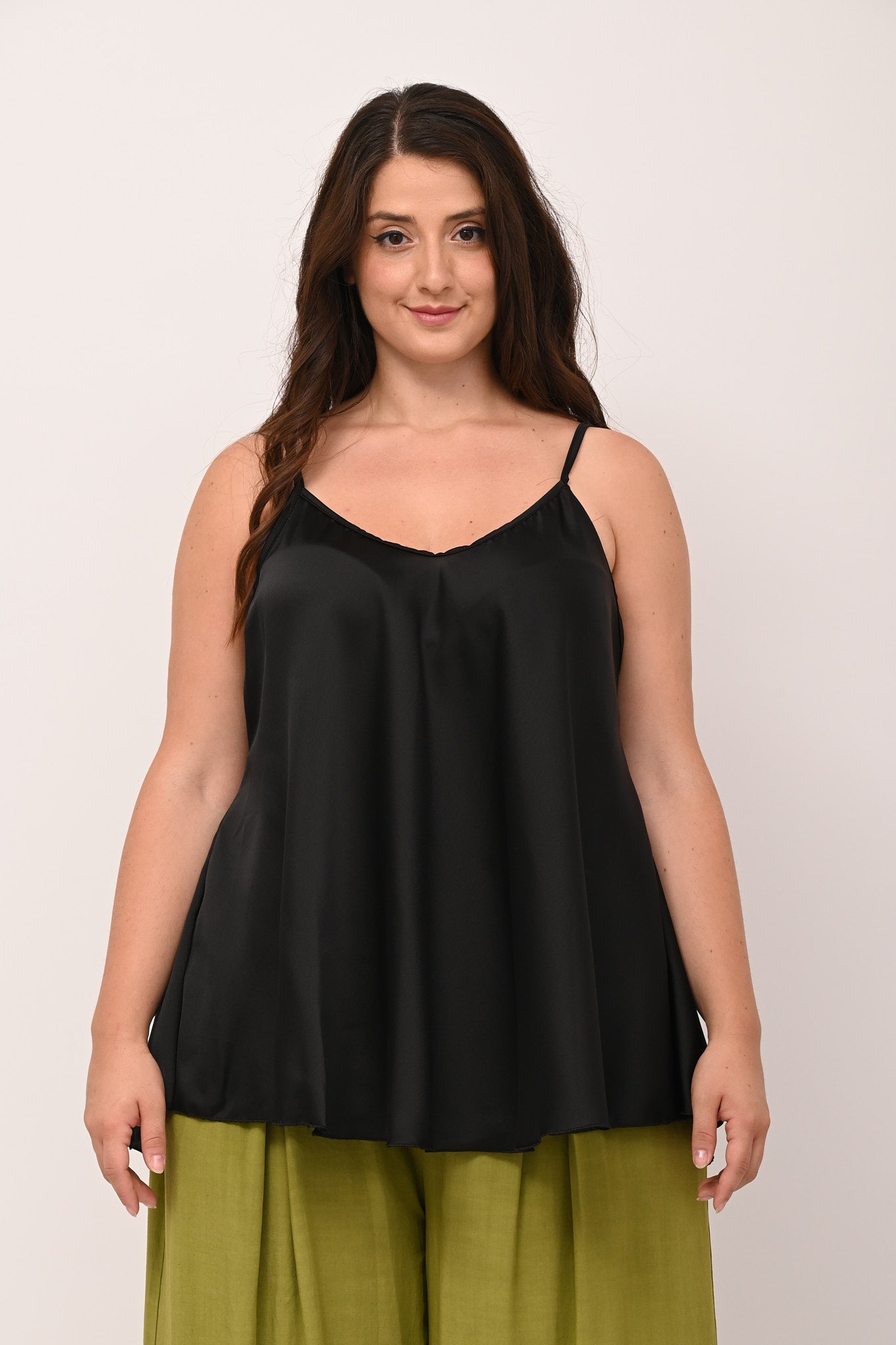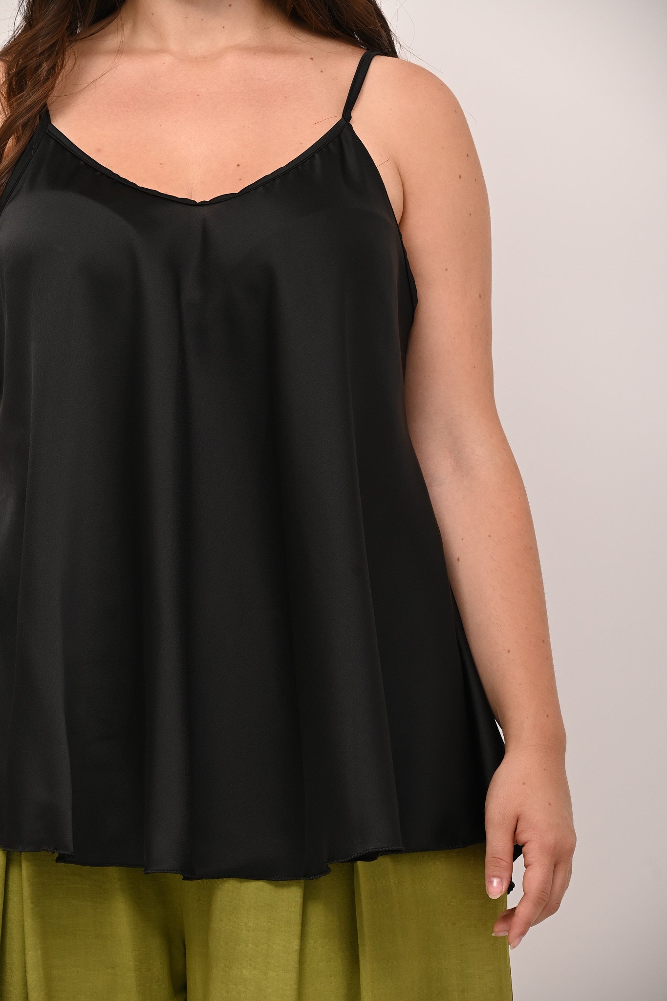 Top in raso, con bretelle sottili, scollatura a V, modello a ruota. Un top femminile, dalla vestibilità fluida, che può essere indossato per look quotidiani di tendenza, ma anche per eventi più eleganti. Un must have cool e senza tempo.