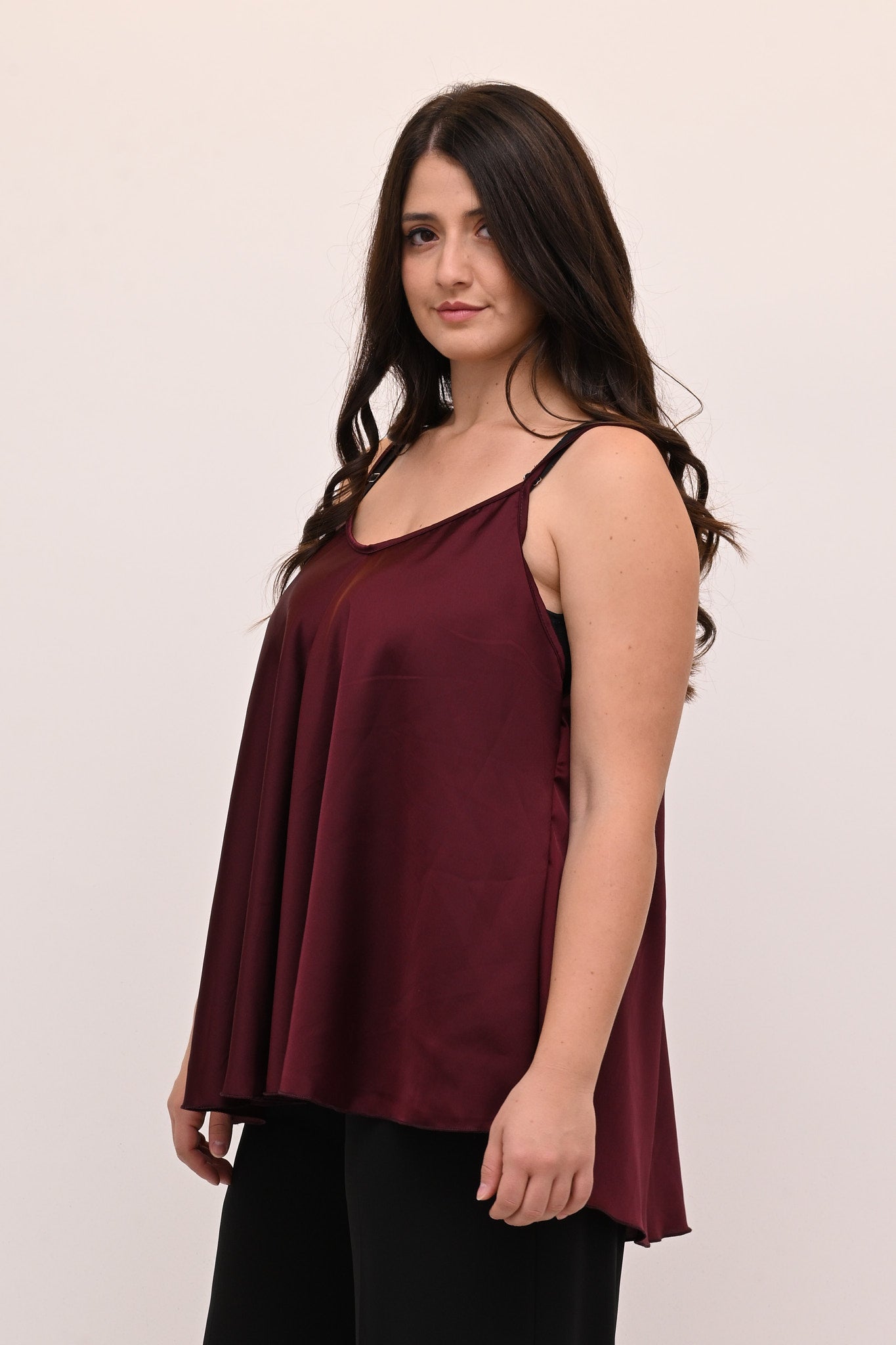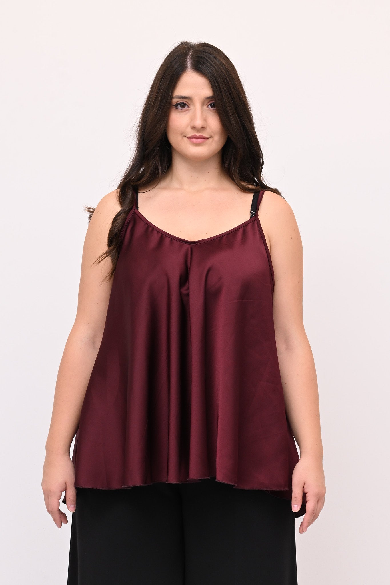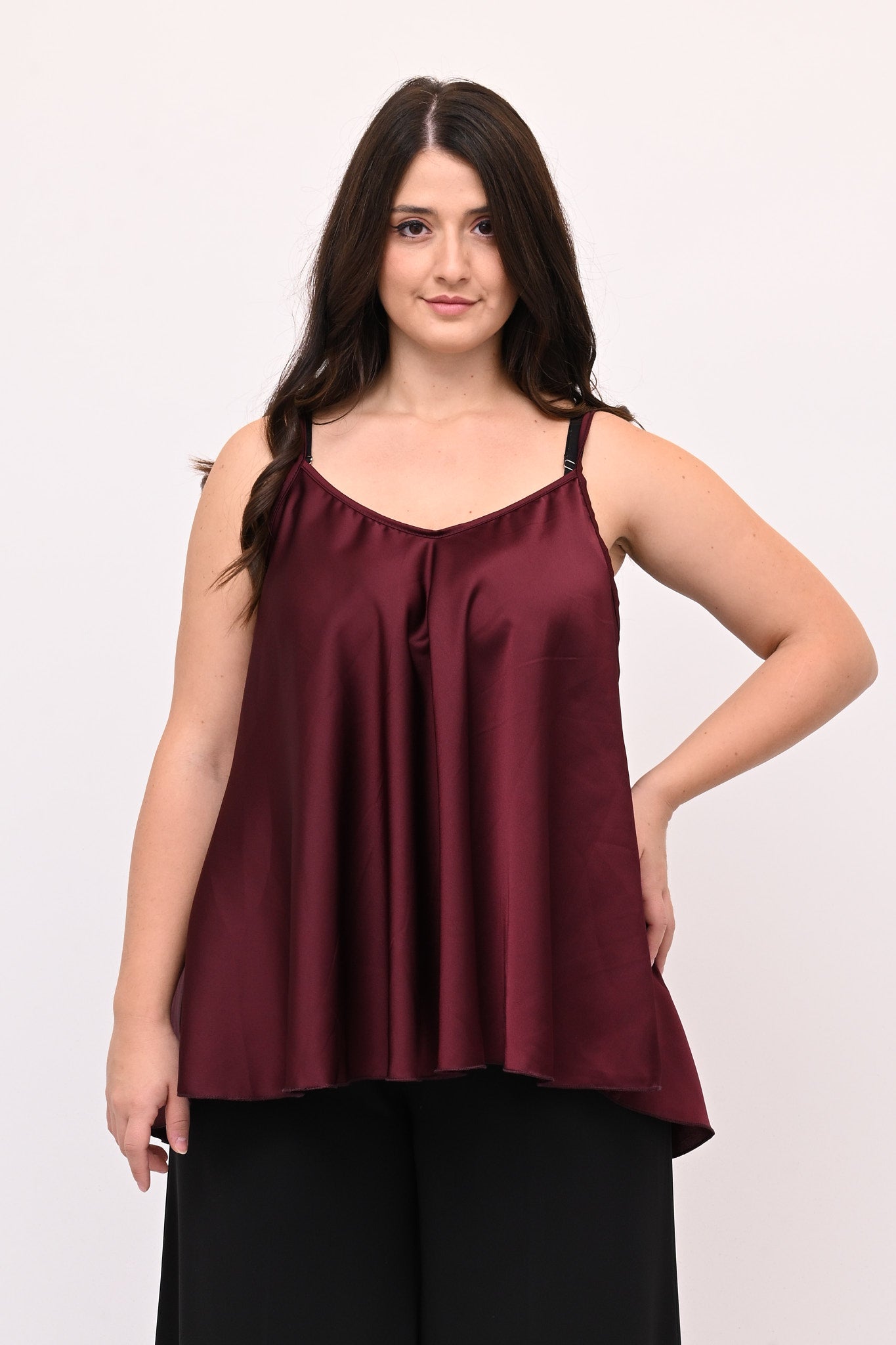 Top in raso, con bretelle sottili, scollatura a V, modello a ruota. Un top femminile, dalla vestibilità fluida, che può essere indossato per look quotidiani di tendenza, ma anche per eventi più eleganti. Un must have cool e senza tempo.