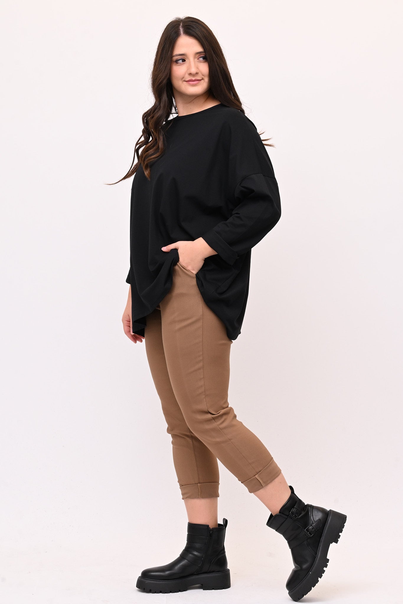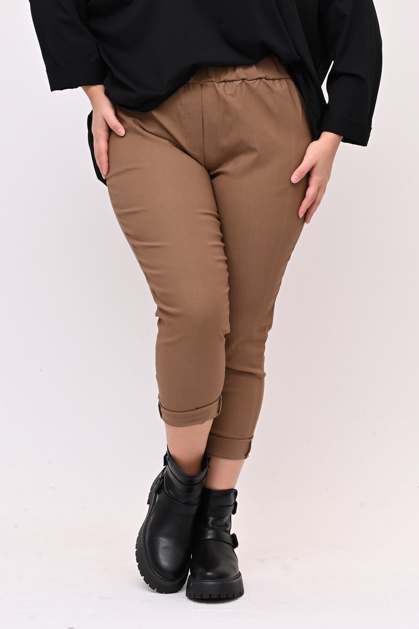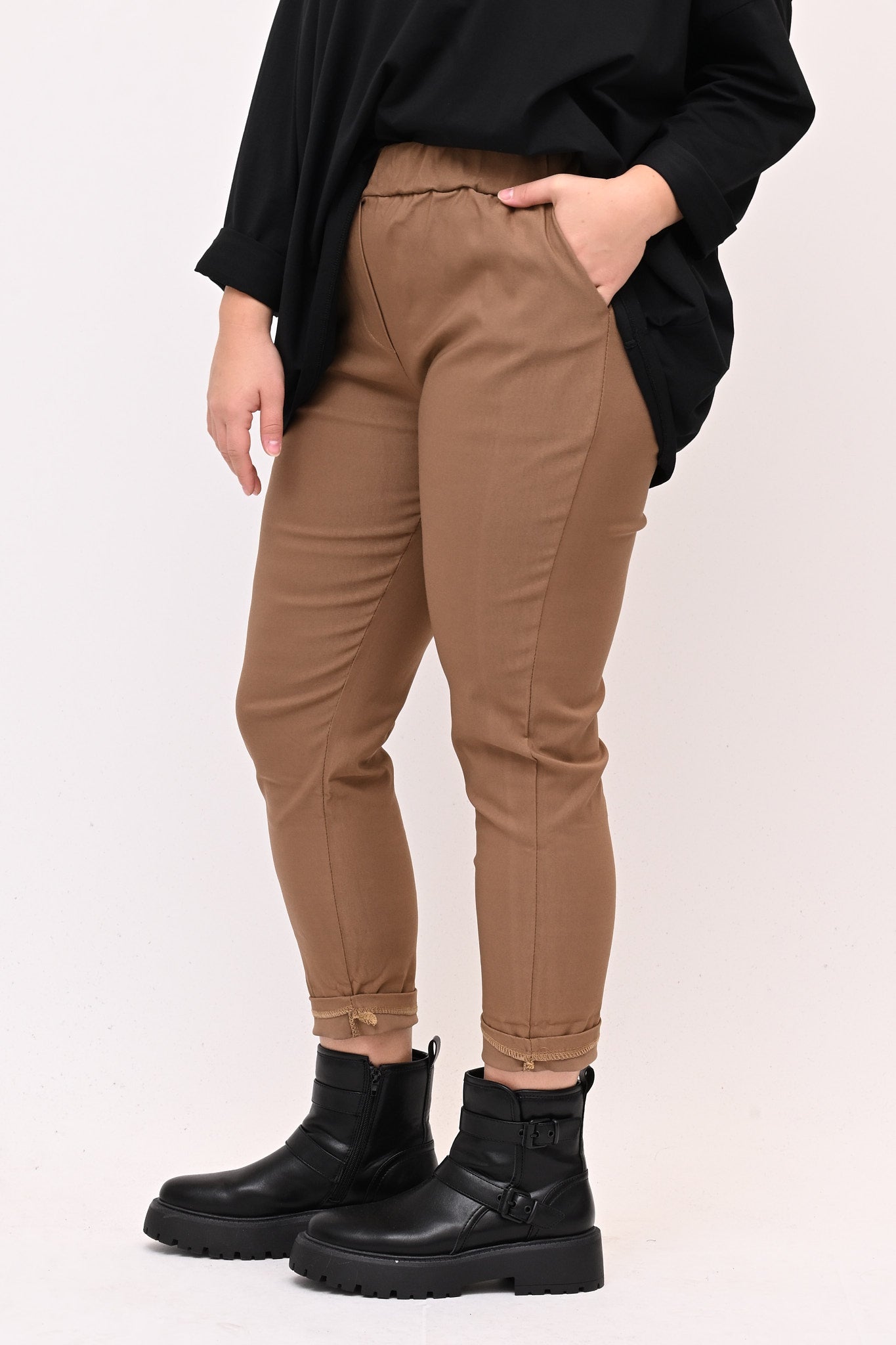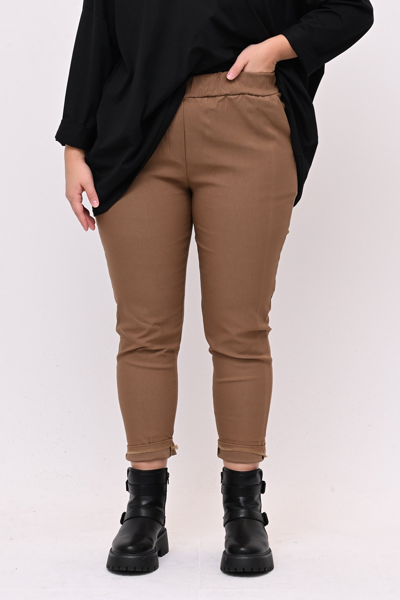 Pantaleggins in bengalina elasticizzata, con tasche. Il taglio aderente definisce la figura e l'elastico in vita assicura una vestibilità comoda e perfetta, garantendo comfort senza sacrificare lo stile. E' un pantalone 4 stagioni ideale per look casual e formali. Abbinato con top, camicie o giacche è versatile e adatto a chi cerca un equilibrio tra praticità e stile.