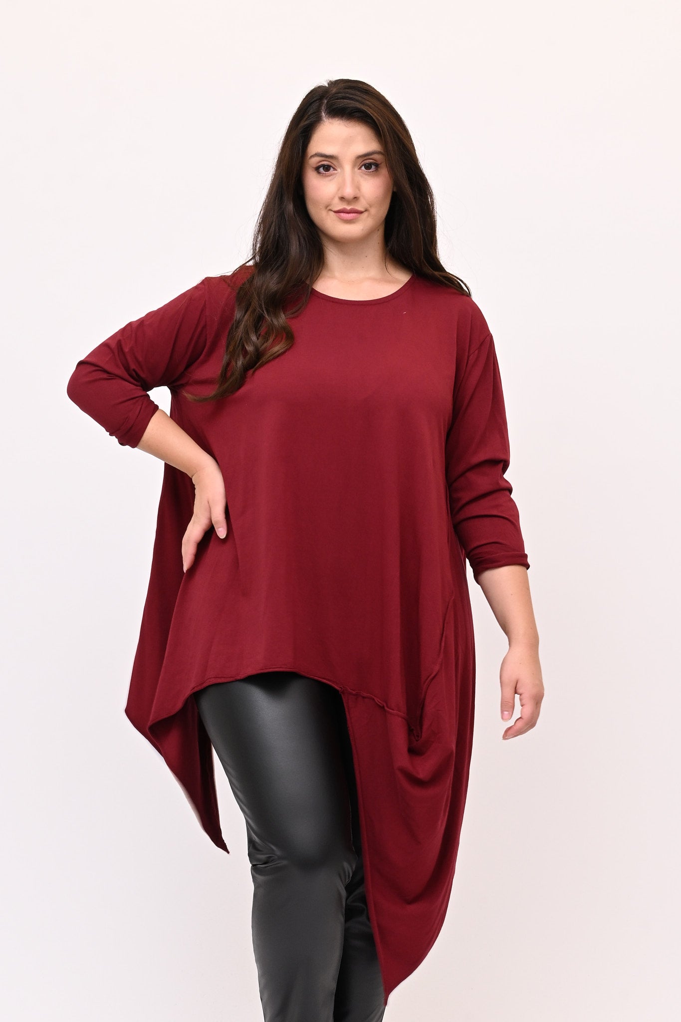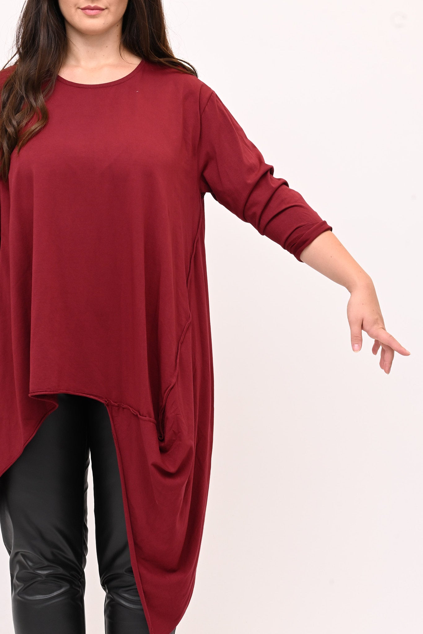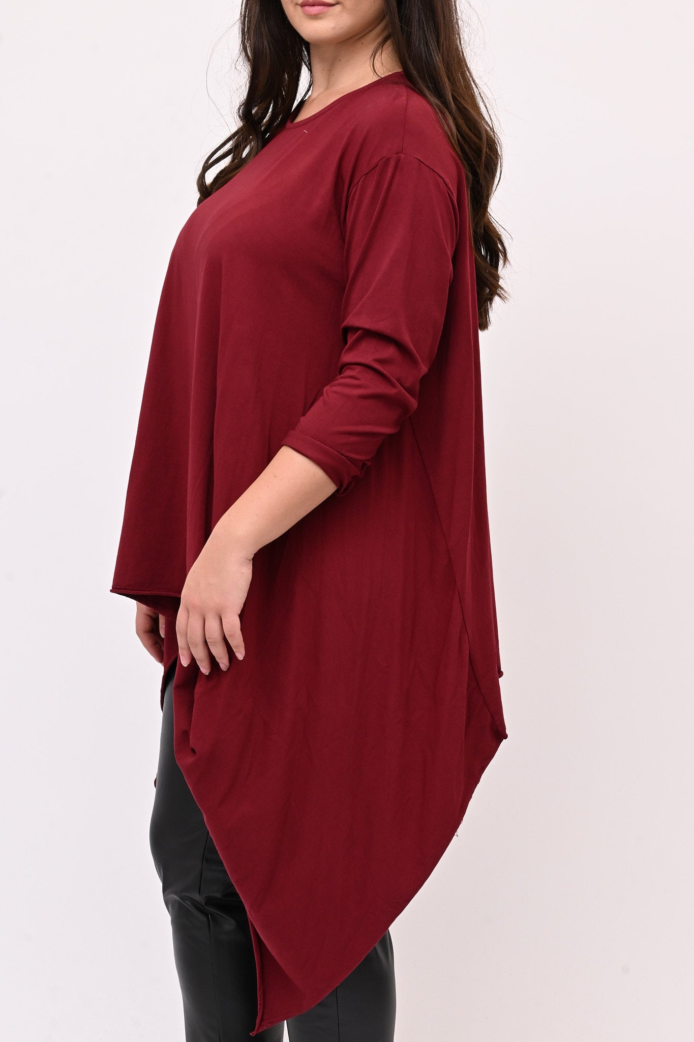 Maxi maglia in cotone elasticizzato, girocollo, maniche lunghe. Il design asimmetrico con punte laterali aggiunge un tocco distintivo e femminile. Un capo unico e versatile, perfetto per chi cerca uno stile particolare senza rinunciare al comfort.