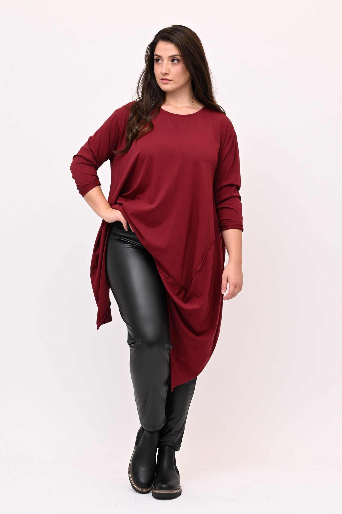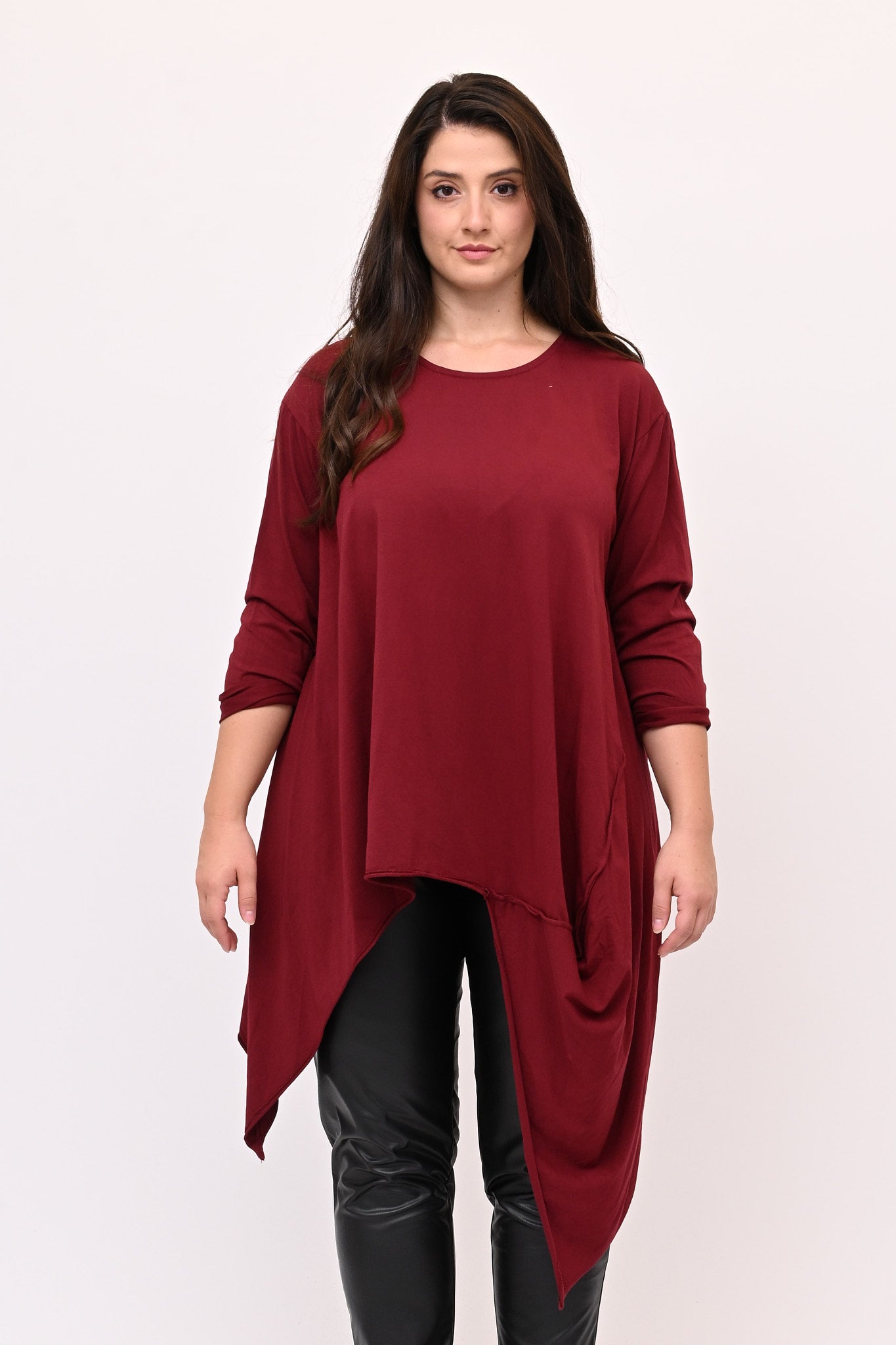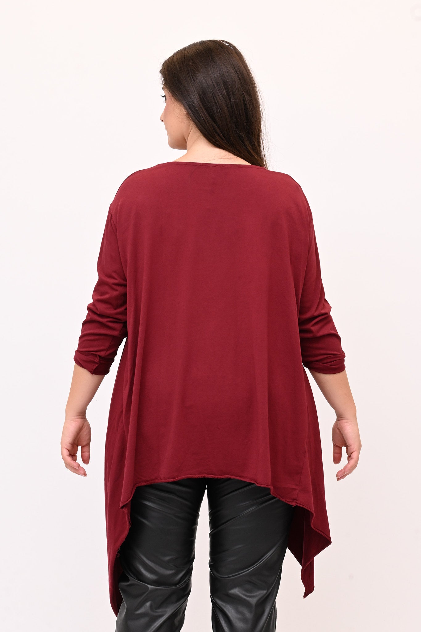 Maxi maglia in cotone elasticizzato, girocollo, maniche lunghe. Il design asimmetrico con punte laterali aggiunge un tocco distintivo e femminile. Un capo unico e versatile, perfetto per chi cerca uno stile particolare senza rinunciare al comfort.