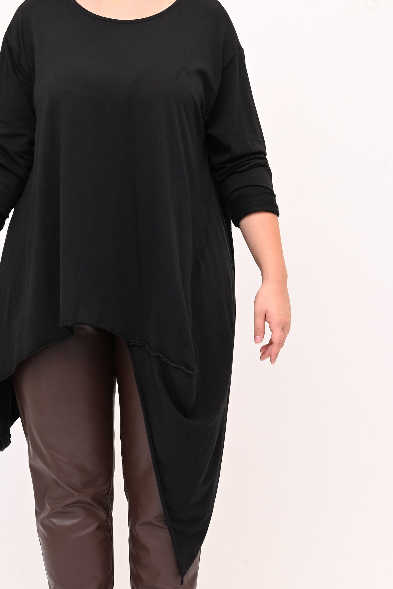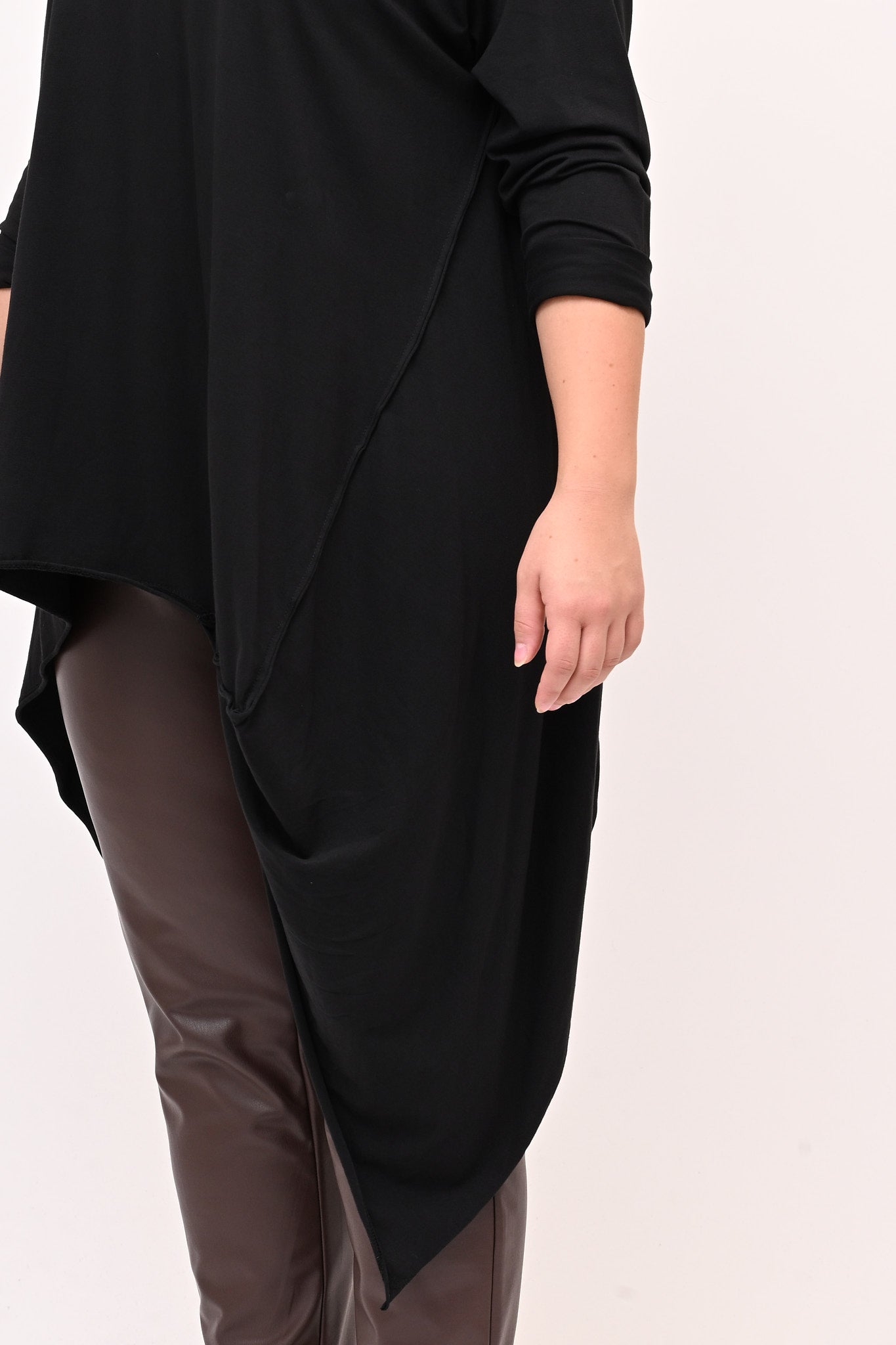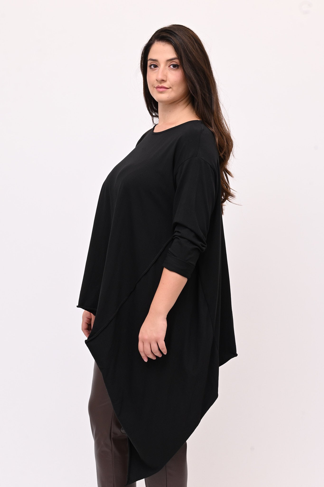 Maxi maglia in cotone elasticizzato, girocollo, maniche lunghe. Il design asimmetrico con punte laterali aggiunge un tocco distintivo e femminile. Un capo unico e versatile, perfetto per chi cerca uno stile particolare senza rinunciare al comfort.