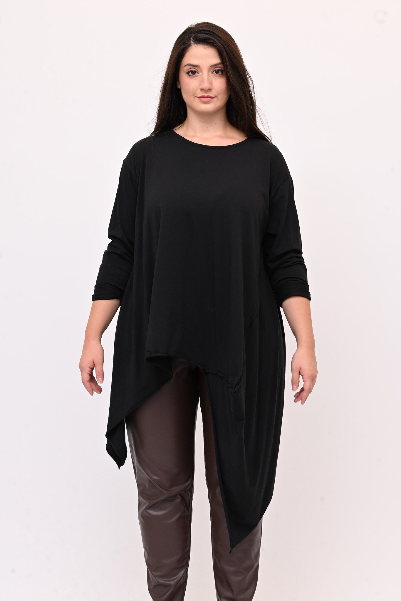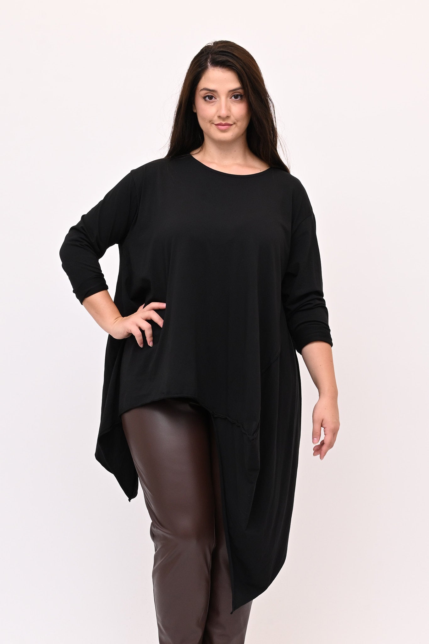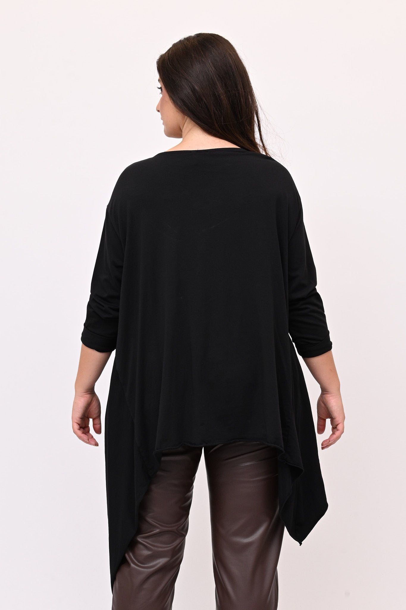 Maxi maglia in cotone elasticizzato, girocollo, maniche lunghe. Il design asimmetrico con punte laterali aggiunge un tocco distintivo e femminile. Un capo unico e versatile, perfetto per chi cerca uno stile particolare senza rinunciare al comfort.