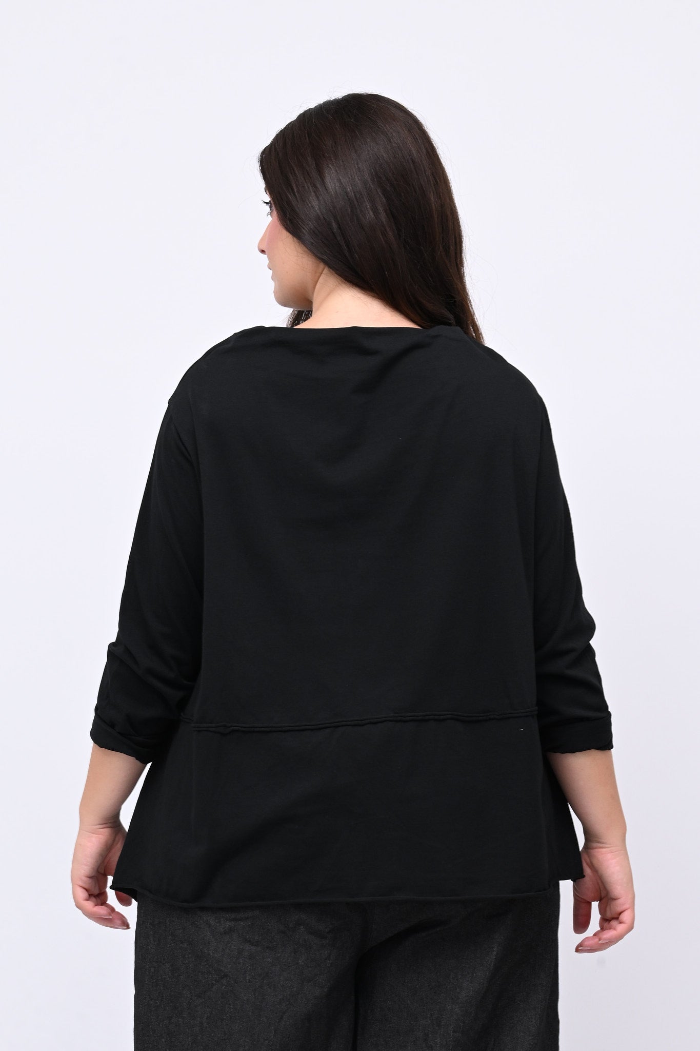 Maglia in cotone elasticizzato, con collo a vulcano e giochi di cuciture sul busto, che la rendono moderna e originale. Perfetta per chi cerca una maglia versatile, che unisca stile e comfort.