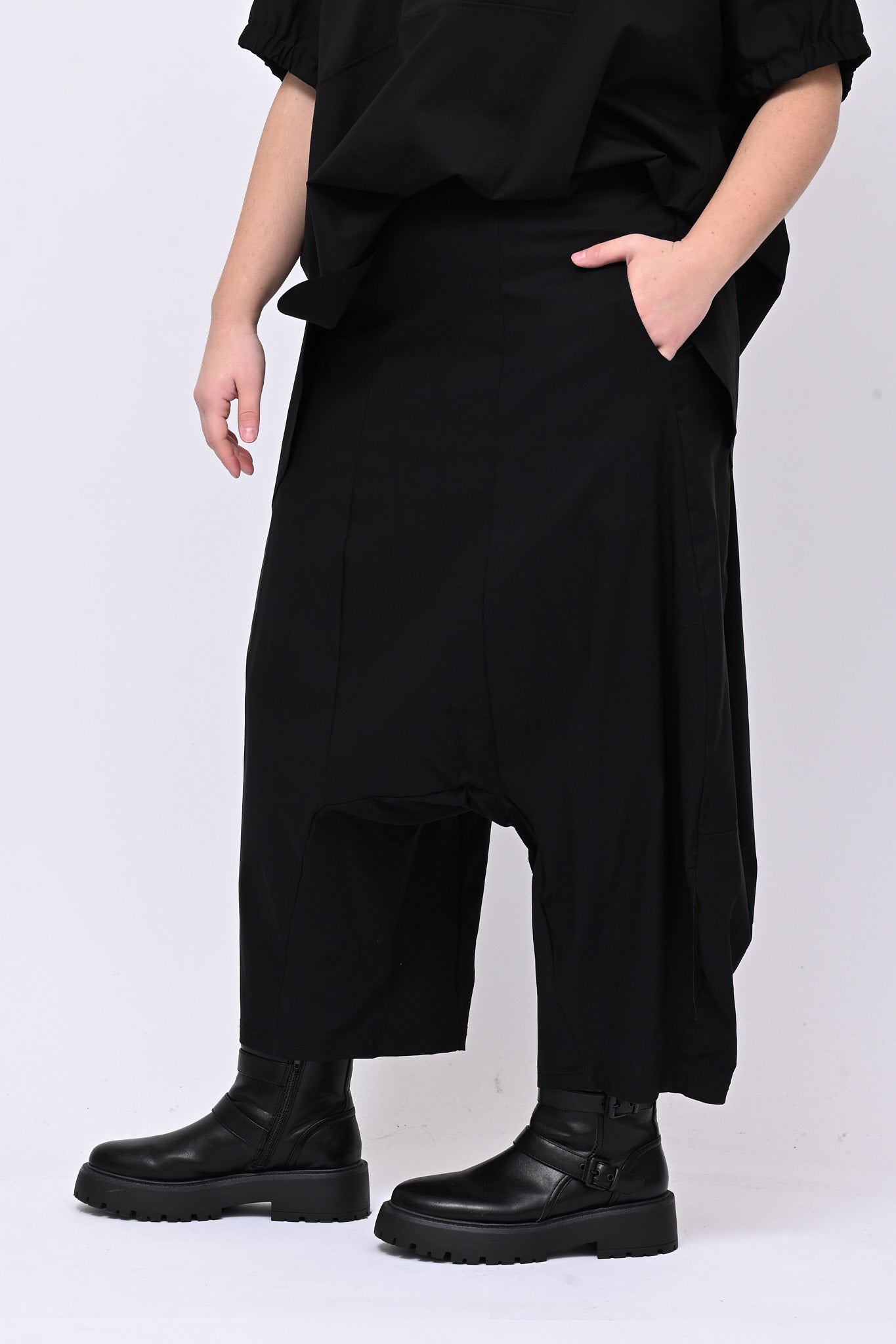 Pantalone in bengalina elasticizzata, con cavallo basso, gamba baloon, elastico in vita e tasche laterali. Confortevole e versatile è ideale per chi desidera un capo contemporaneo, originale e di tendenza.