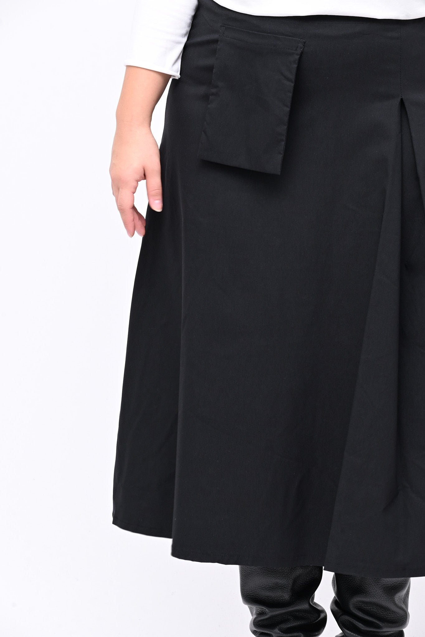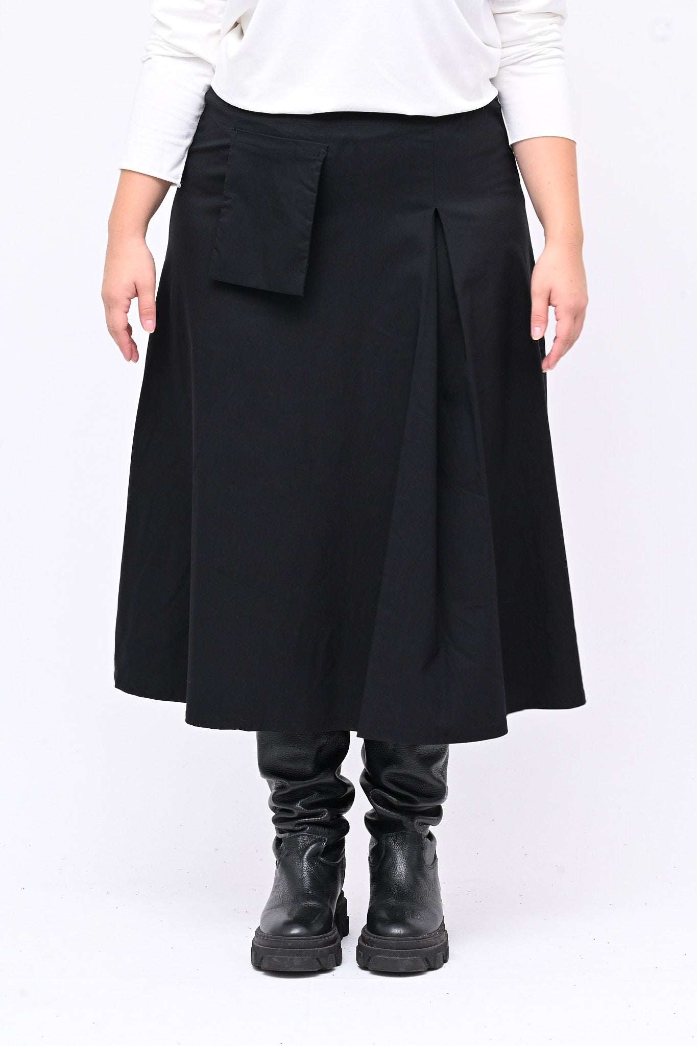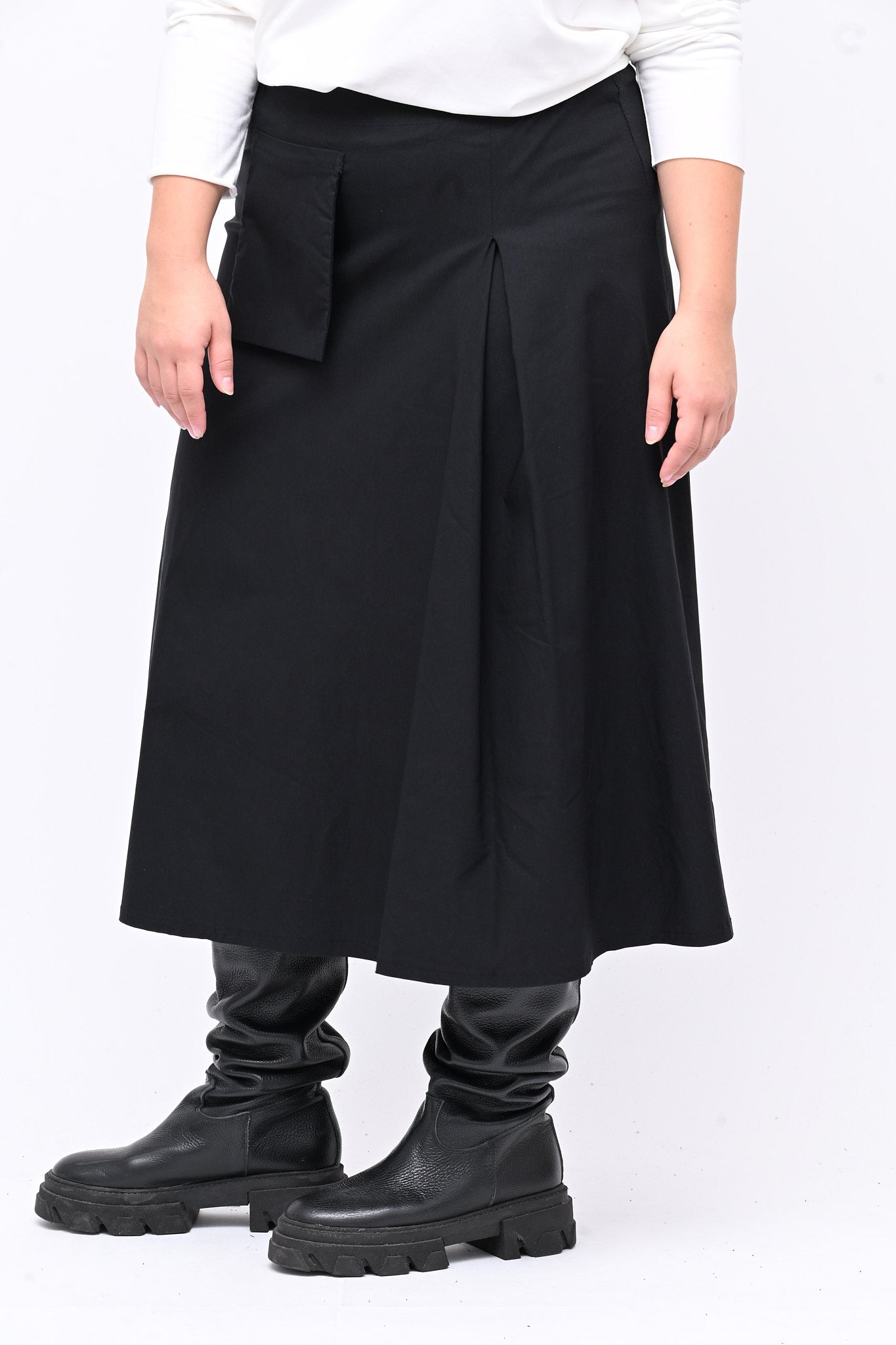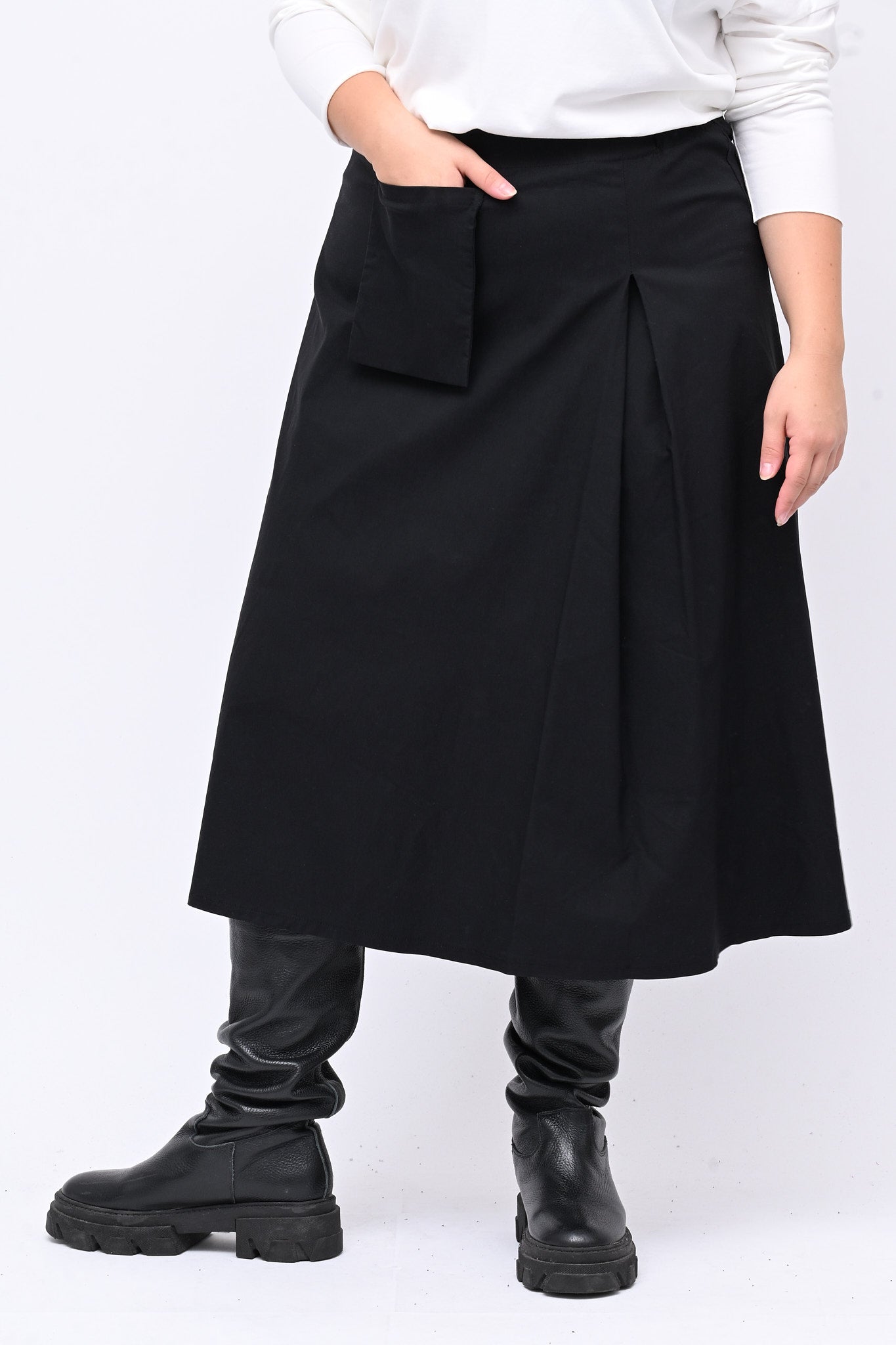 Gonna in bengalina elasticizzata, con elastico in vita e mono pince laterale. La vestibilità è confortevole e la tasca frontale aggiunge un tocco di design. La linea svasata esalta i movimenti e la silhouette, rendendola un capo versatile sia per l'abbigliamento professionale che casual.