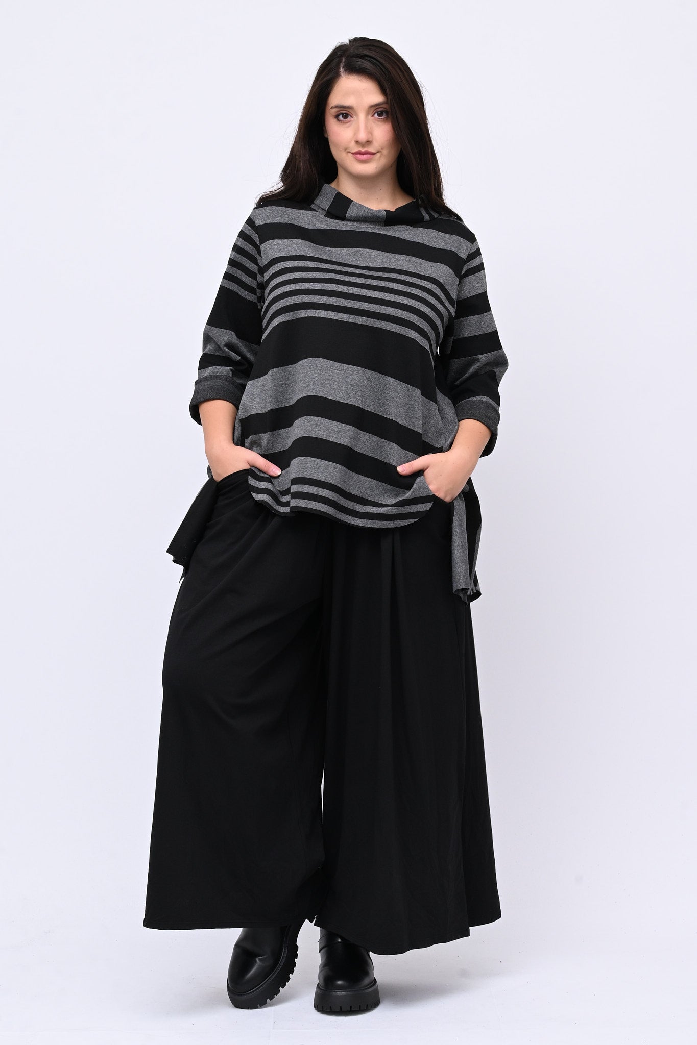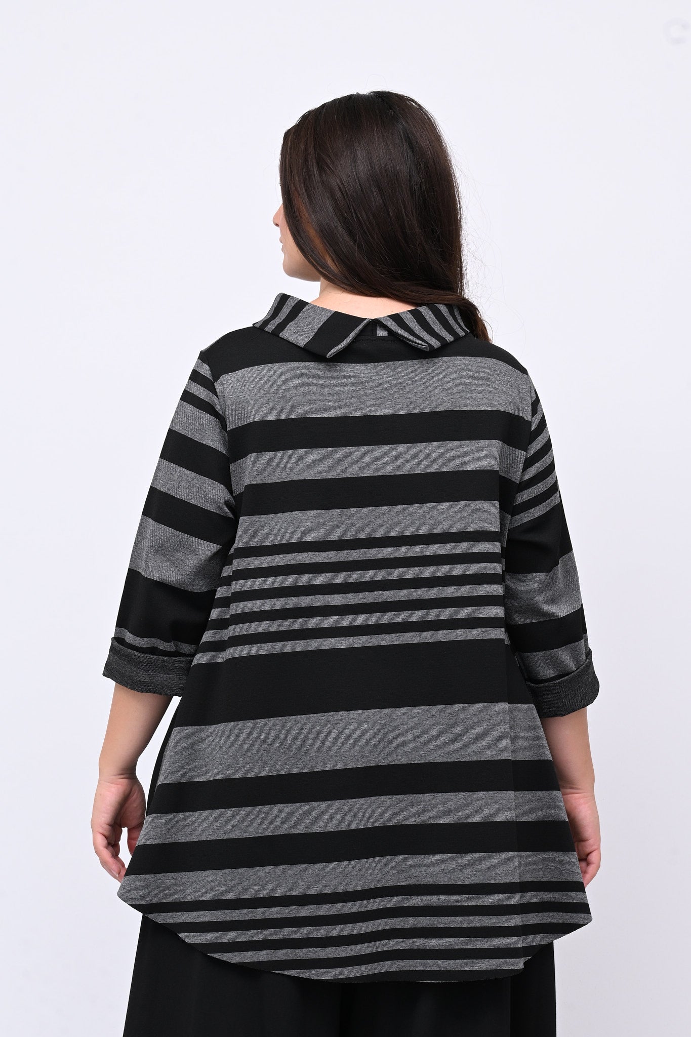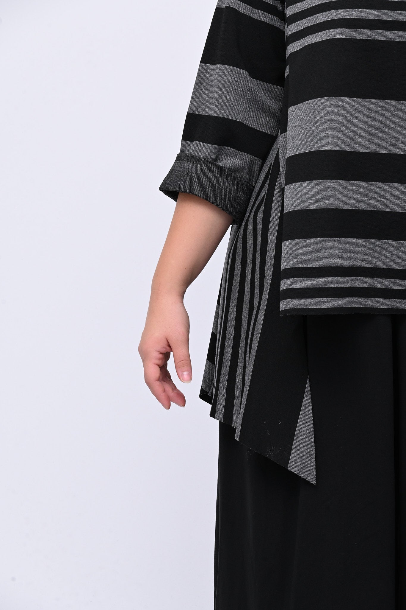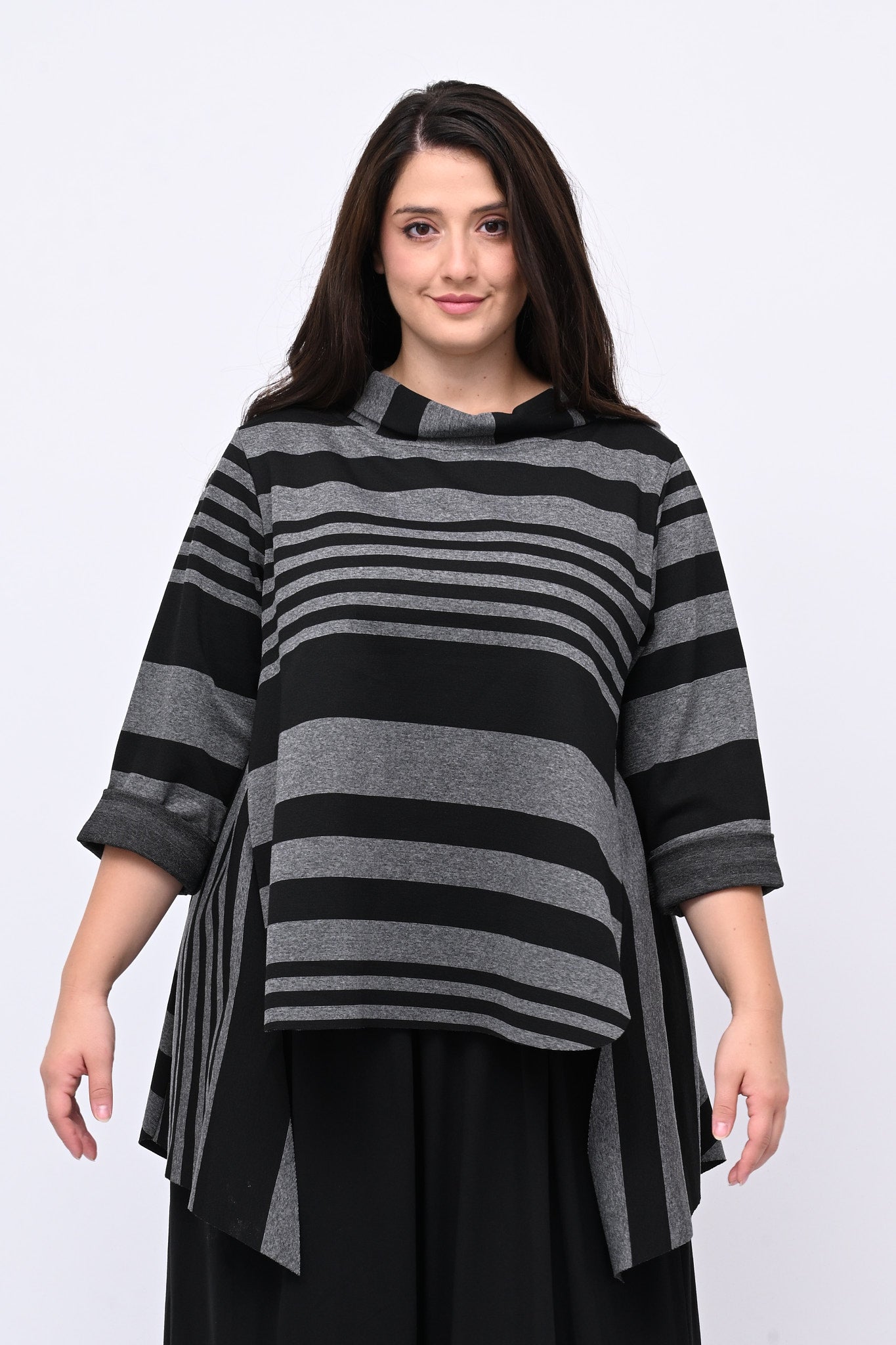 Maglia a fantasia rigata con collo ad anello e maniche lunghe. Il design si distingue per l'orlo vivo asimmetrico, più lungo sul retro e con punte frontali, che la rende moderna e dinamica. Ideale per chi cerca un capo versatile e di carattere, capace di valorizzare la silhouette con stile.