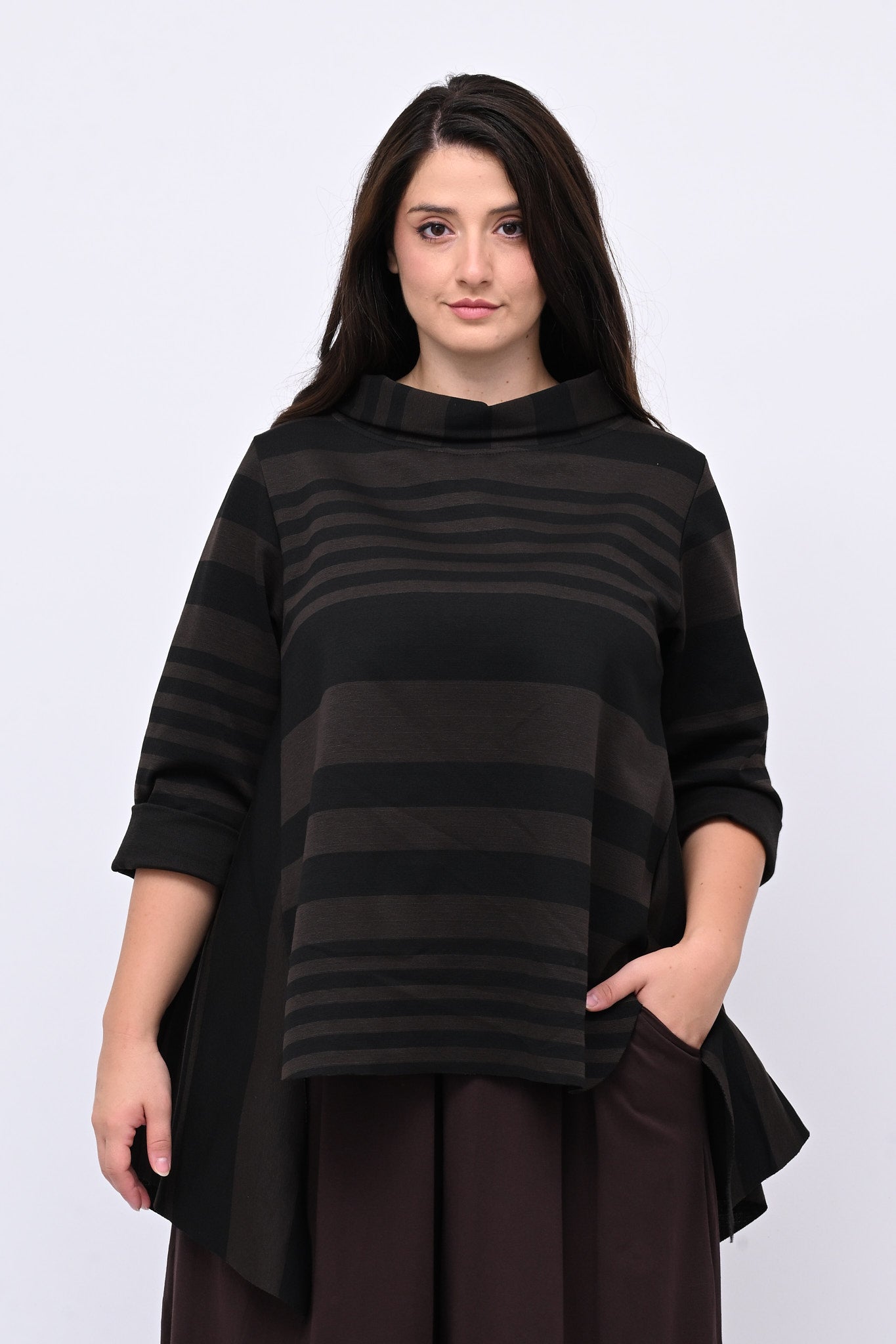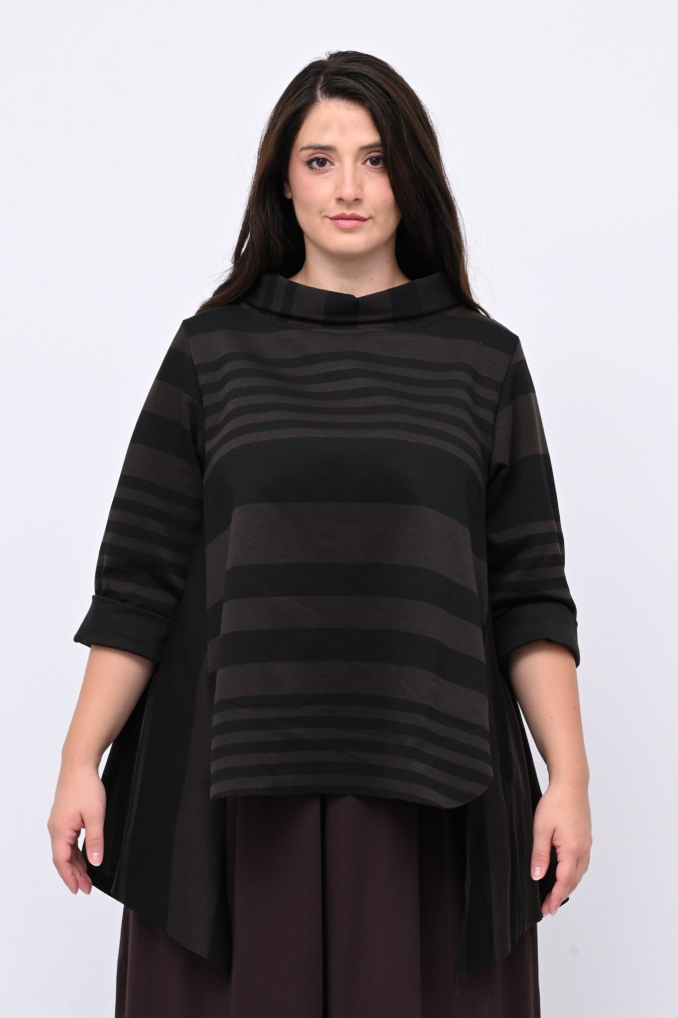Maglia a fantasia rigata con collo ad anello e maniche lunghe. Il design si distingue per l'orlo vivo asimmetrico, più lungo sul retro e con punte frontali, che la rende moderna e dinamica. Ideale per chi cerca un capo versatile e di carattere, capace di valorizzare la silhouette con stile.