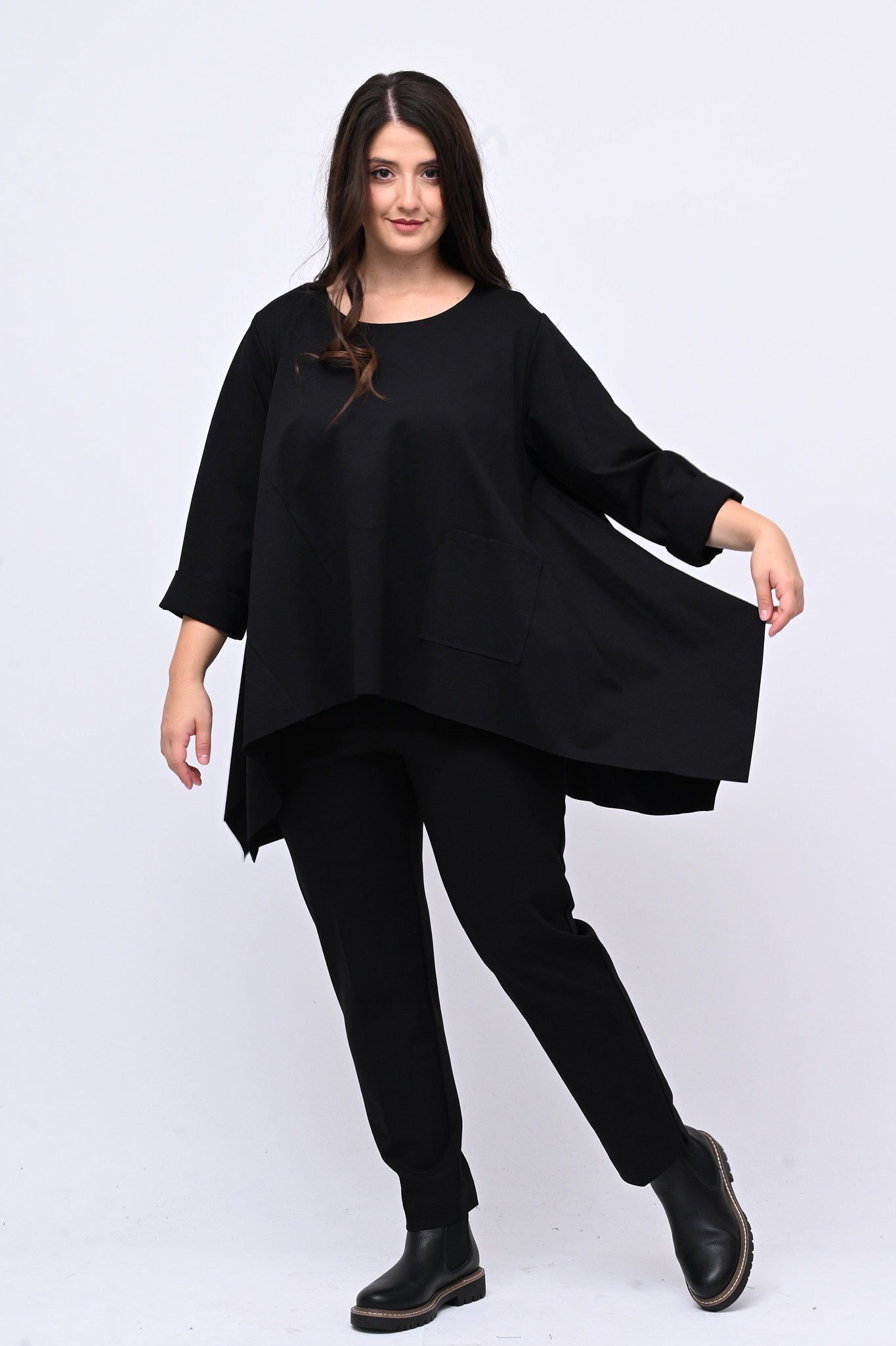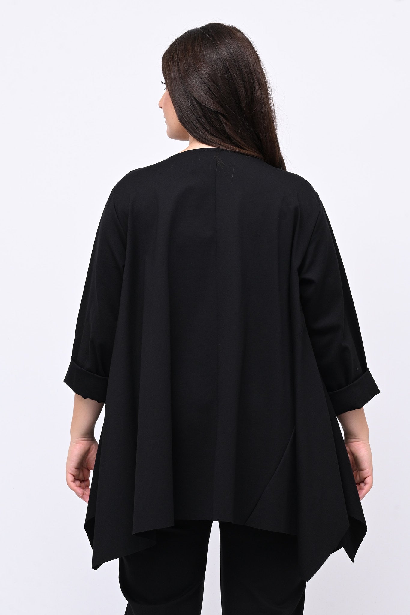 Maglia girocollo, maniche lunghe e tasca a toppa frontale. Il modello a ruota, più lungo sul retro, crea un elegante gioco di punte laterali che valorizza la silhouette e aggiunge un tocco dinamico al capo. Perfetto per chi cerca un look sofisticato ma pratico.