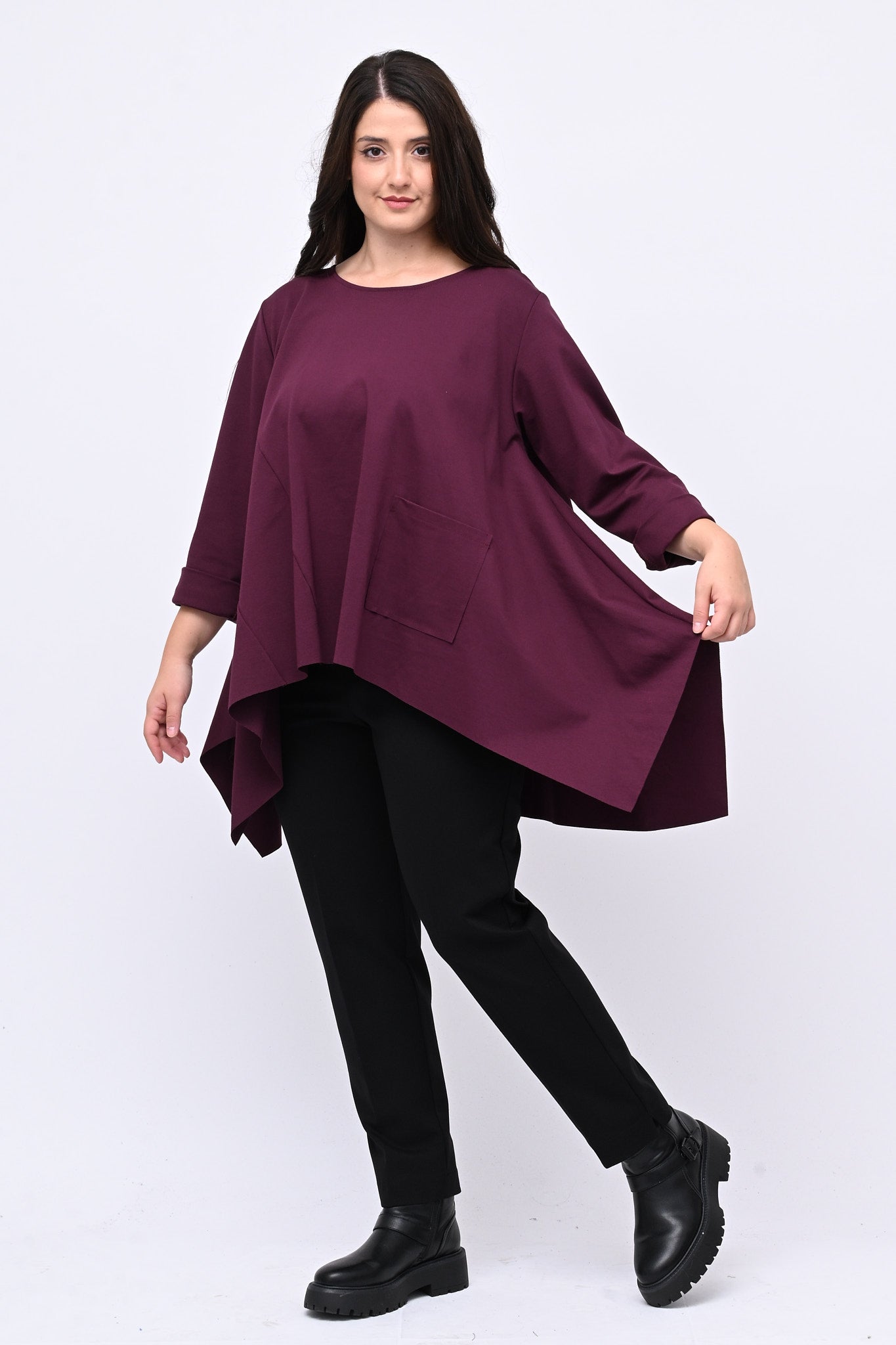 Maglia girocollo, maniche lunghe e tasca a toppa frontale. Il modello a ruota, più lungo sul retro, crea un elegante gioco di punte laterali che valorizza la silhouette e aggiunge un tocco dinamico al capo. Perfetto per chi cerca un look sofisticato ma pratico.