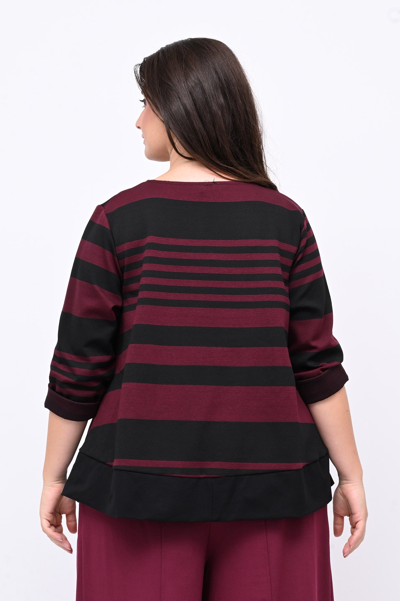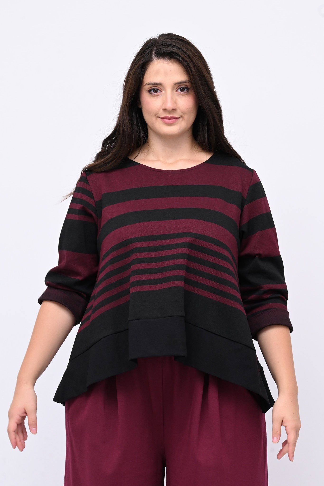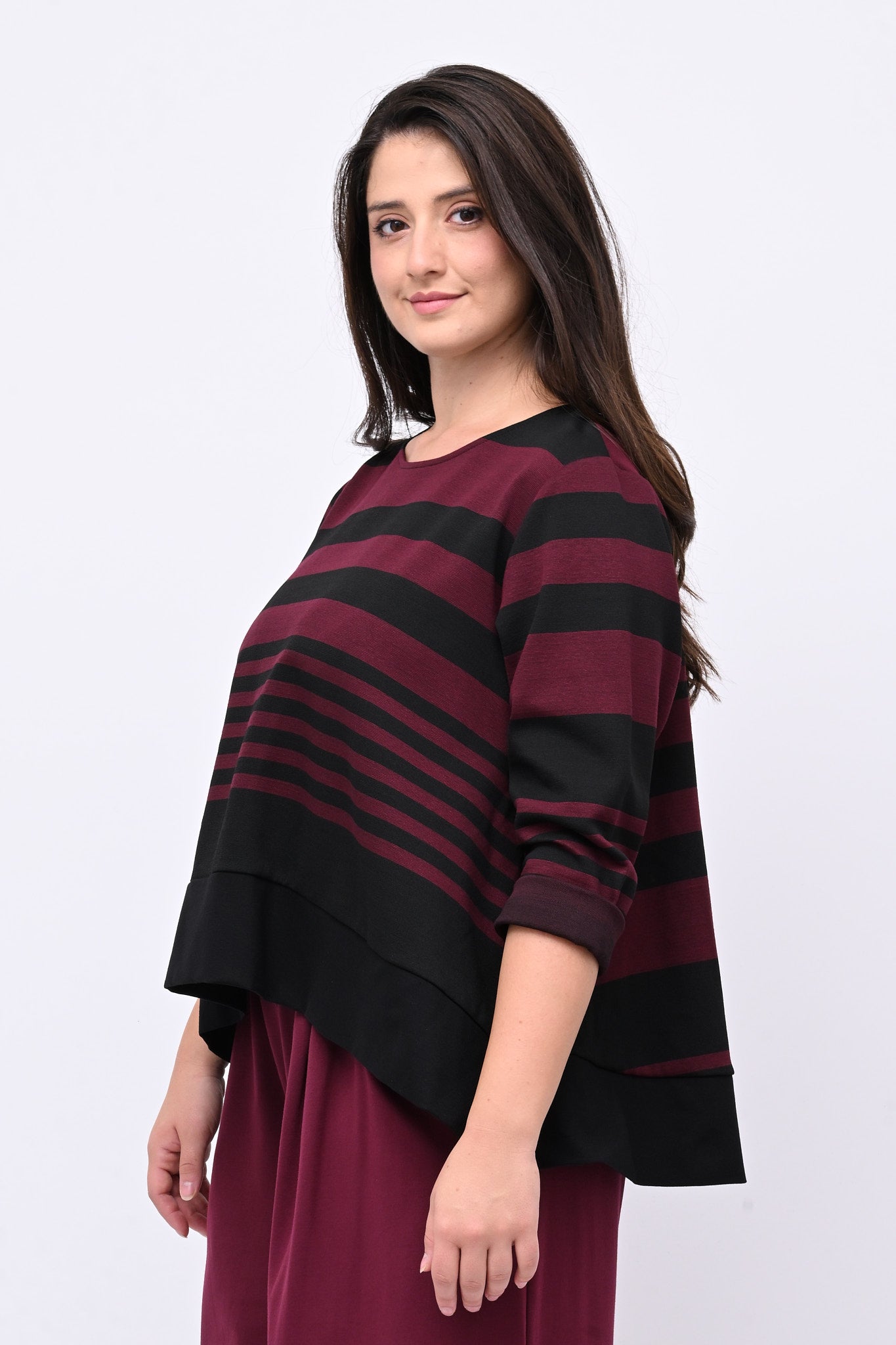 Maglia girocollo, fantasia a righe, taglio ad A e bordo alto sul fondo. Il design sporty chic la rende un capo versatile, perfetto per passare con stile dal tempo libero a un look più curato, garantendo comfort e raffinatezza in ogni occasione.